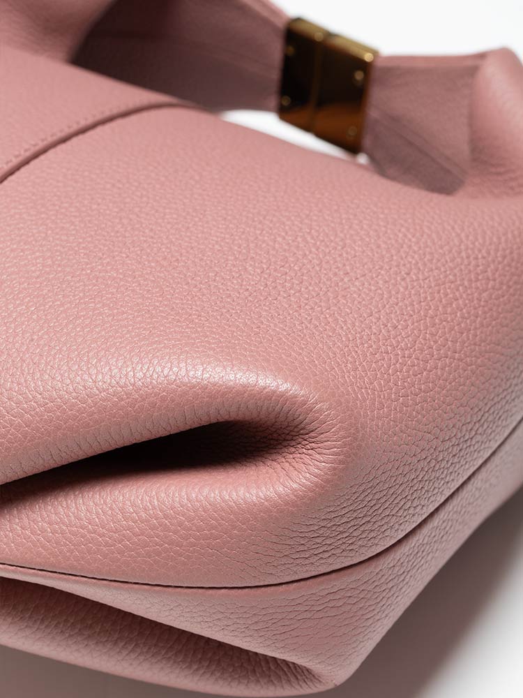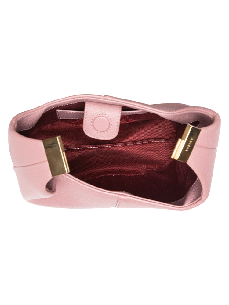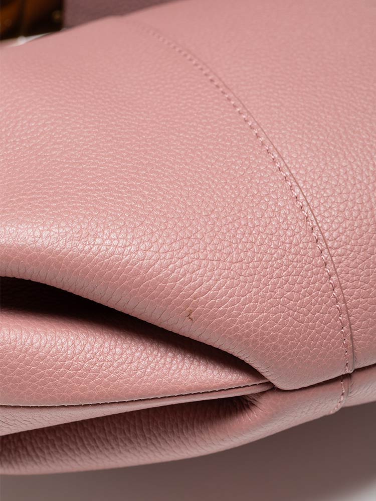 This bag is crafted of calfskin material. It features top handle with Polene lettering on brass hardware, and long strap. The bag opens to a fabric lining with patch pocket.