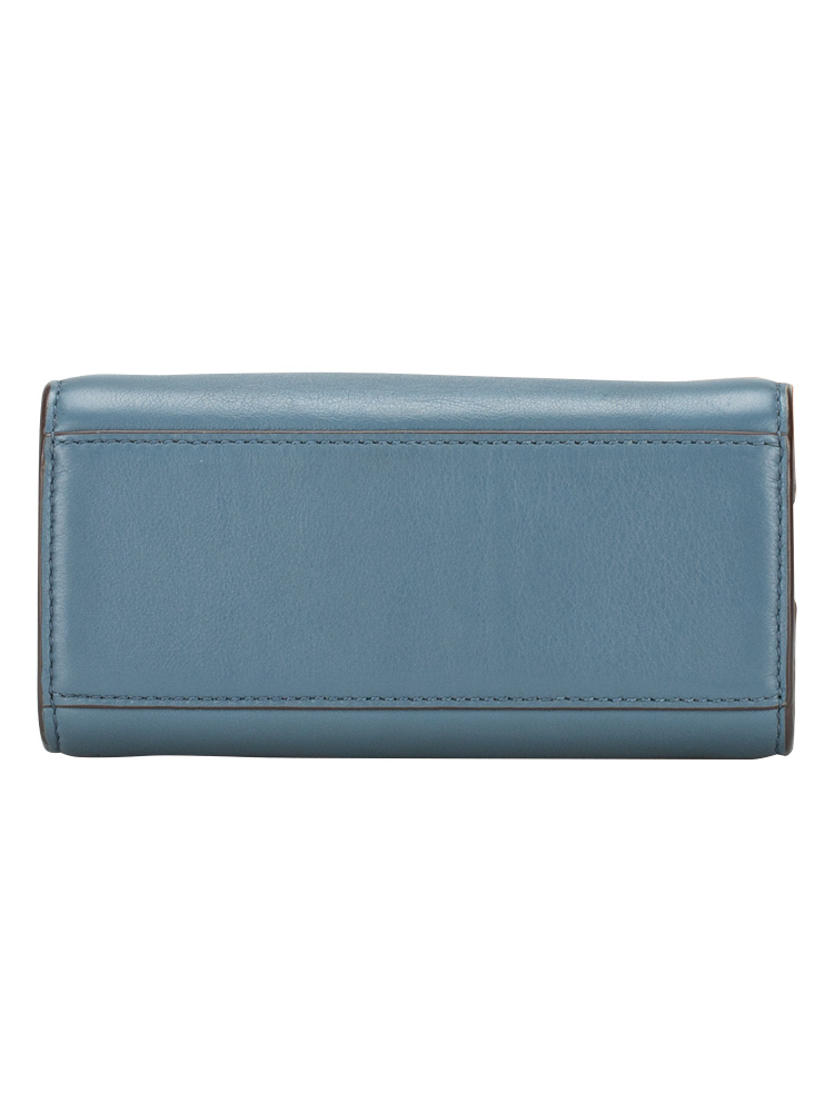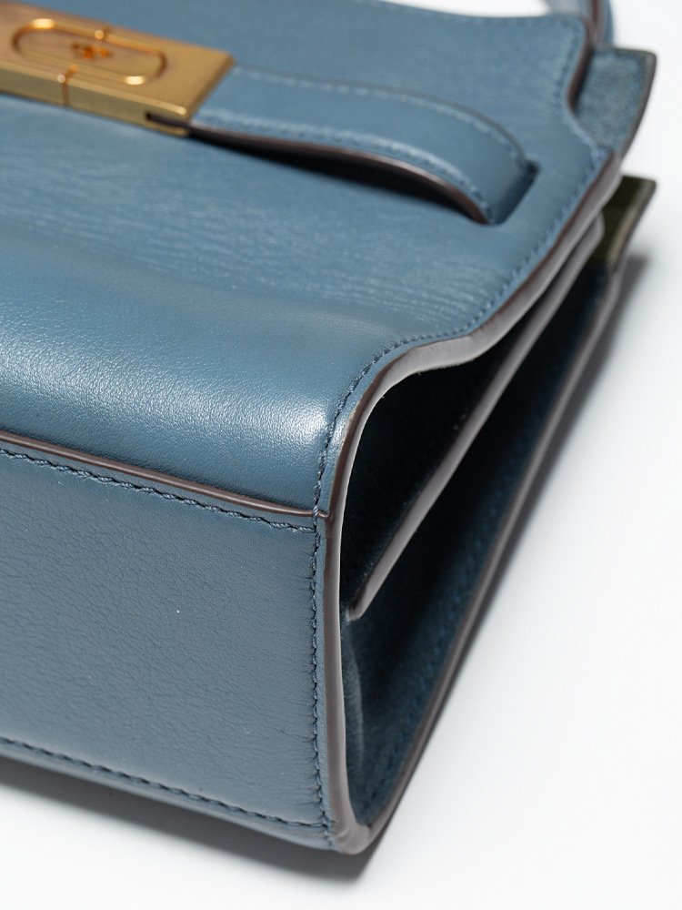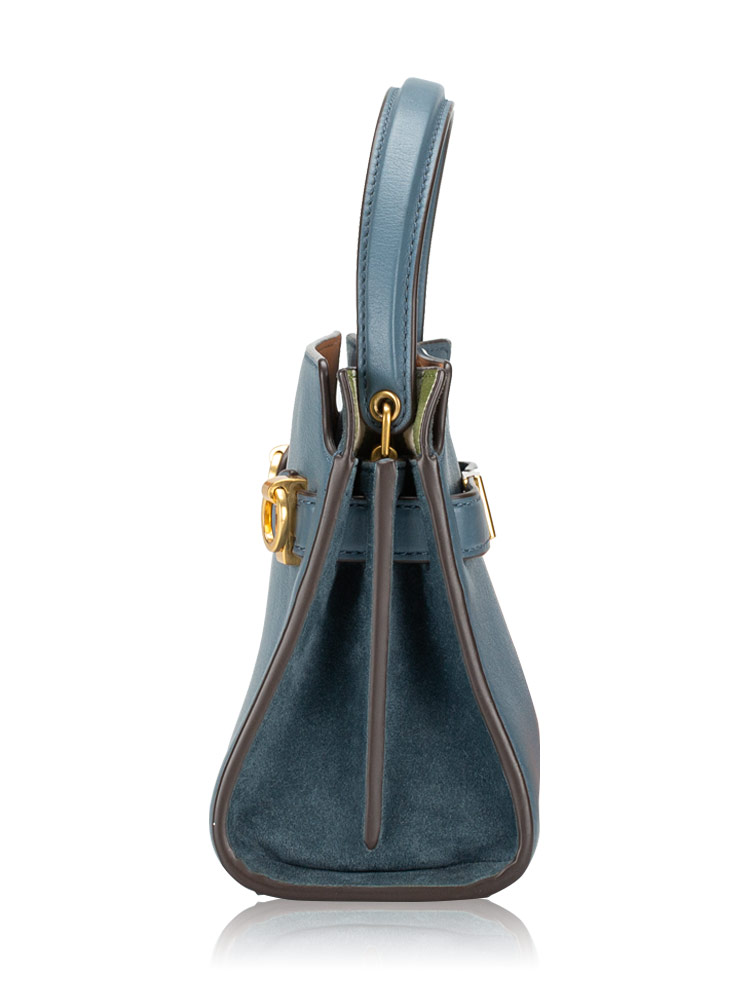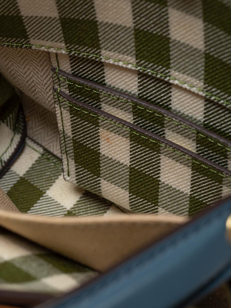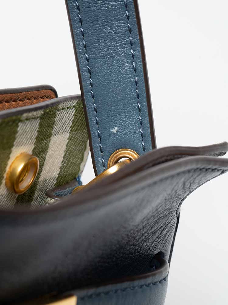 Made of smooth leather. The bag features a button closure that opens to canvas lining with interior two card slots and exterior two compartments.