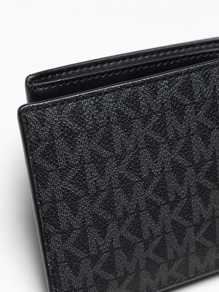 Made of signature coated canvas and smooth lether. The wallet features a folding closure with two full length bill compartments, eight card slots, two slip pockets and insert removable id window, two card slots, one slip pocket.