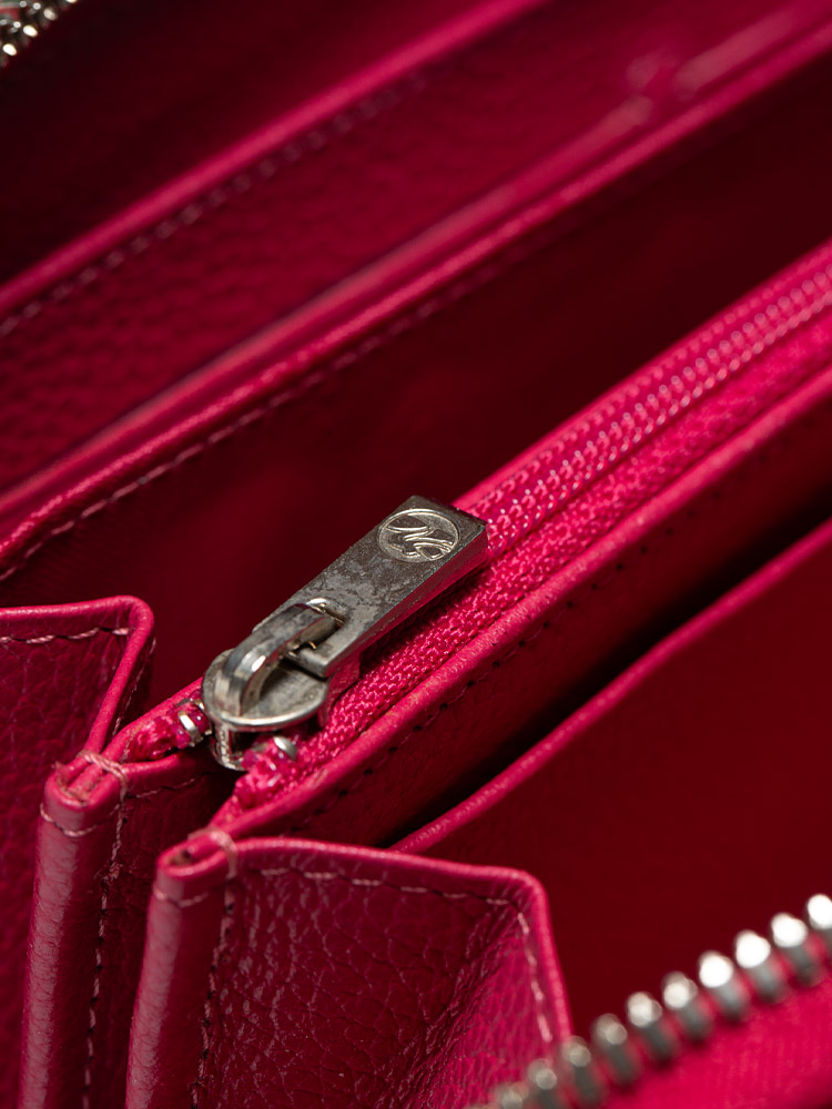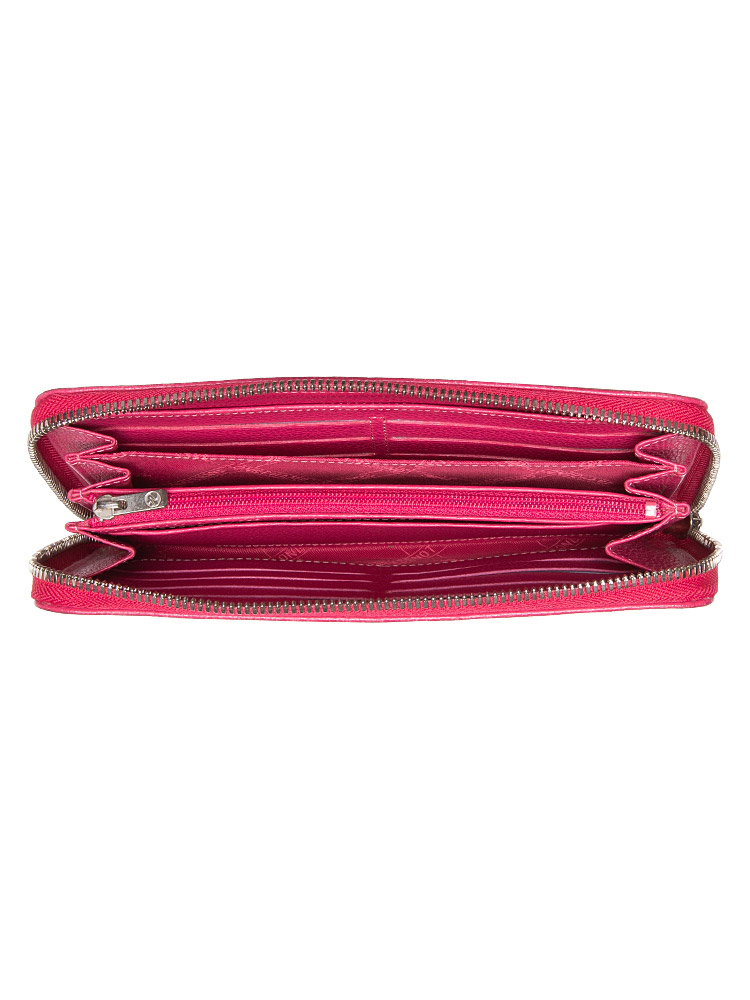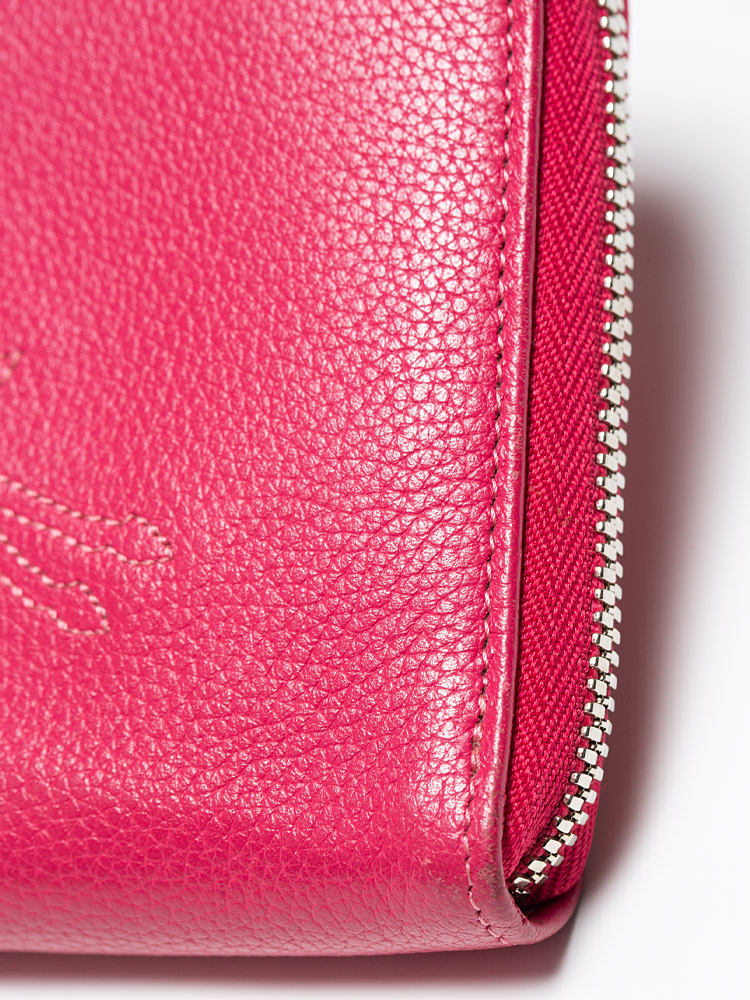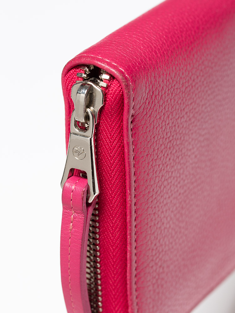 Made of calfskin leather. The wallet features a zip closure that opens to jacquard lining with interior one zip pocket, four slip pockets, tweleve card slots.