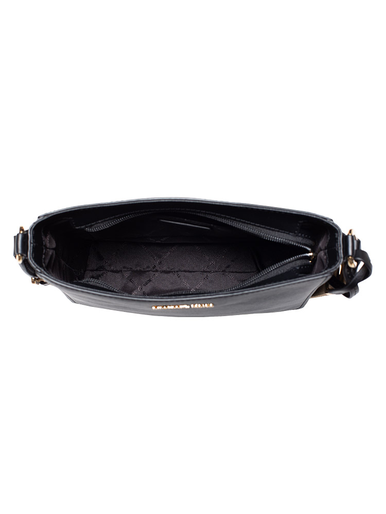 Made of saffiano leather. The bag features a zip closure that openst to polyester lining with interior one slip pocket and exterior one slip pocket at back.