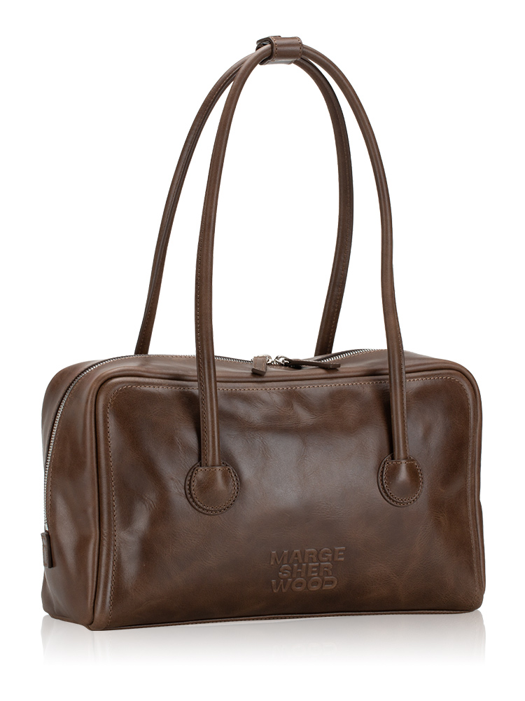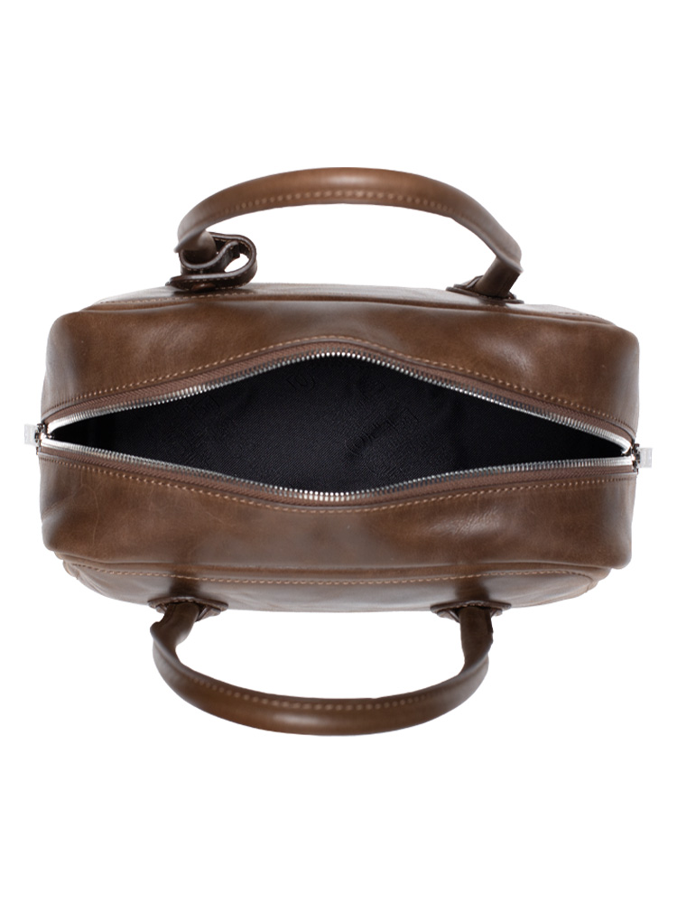 Made of cow leather. The bag features a zip closure that opens to fabric lining with one slip pocket, one zip pocket, double handles drop 27 cm.