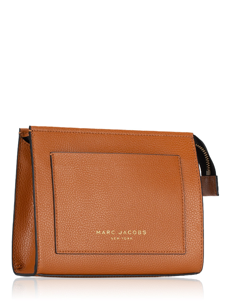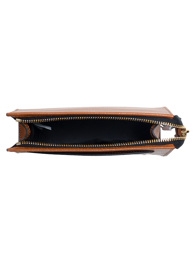 Crafted from grind leather with fabric lining. It features an open zip closure, gold tone hardware, and 1 front slip pocket.