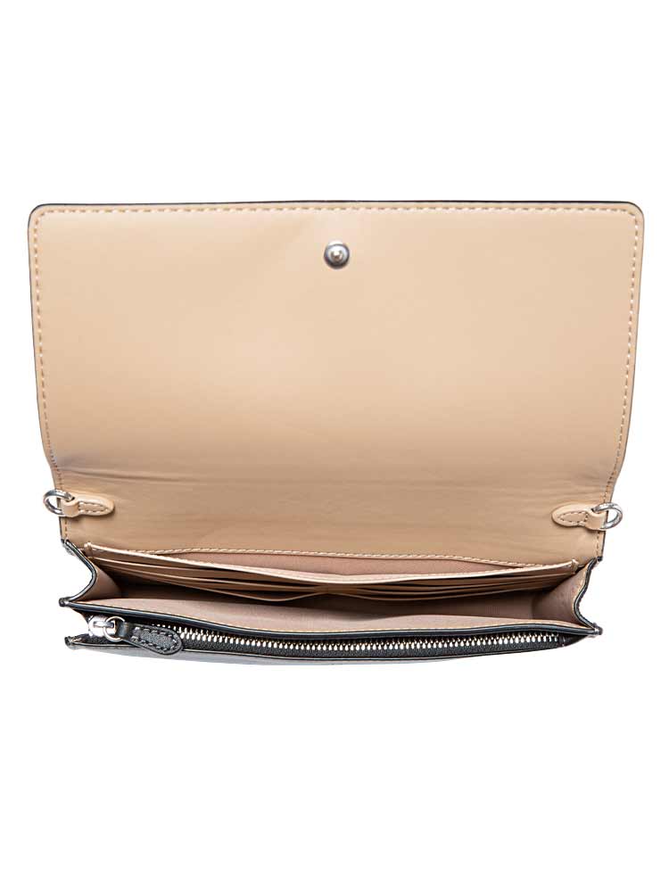 Made of signature coated canvas and smooth leather. The bag features a flap button closure that opens to smooth leather and fabric lining with interior one slip pocket, eight card slots, one zip pocket at front and exterior one slip pocket at back.