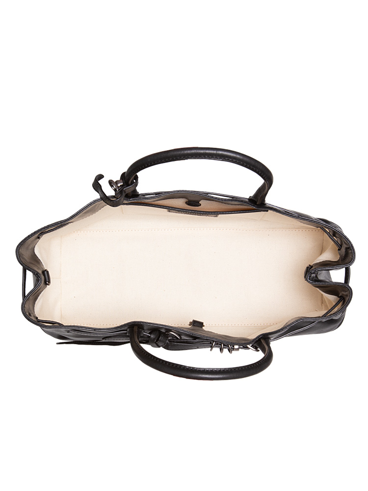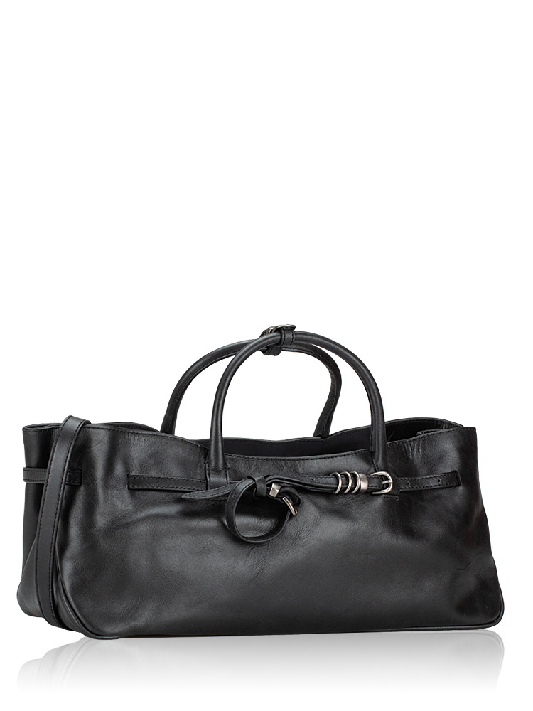 Made of vegetable tanned pull-up cow leather material. The bag features an open dog leash closure, silver tone hardware, a baguette-shaped bag featuring a knotted belt strap and one slip pocket.