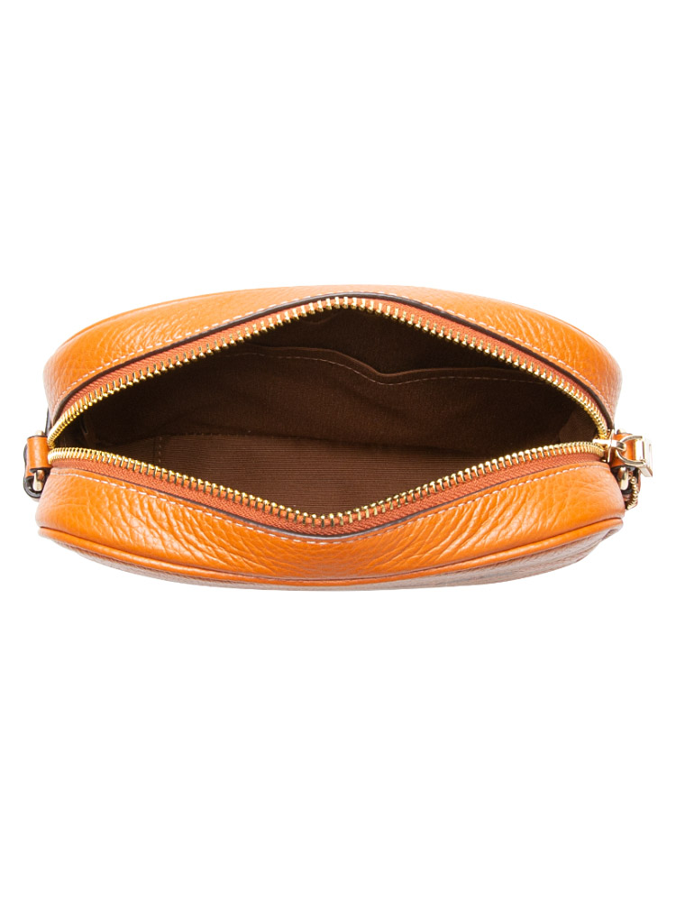 Made of pebbled leather. The bag features a zip closure that opens to fabric lining with one slip pocket, two card slots, exterior one slip pocket at back, adjustable strap.