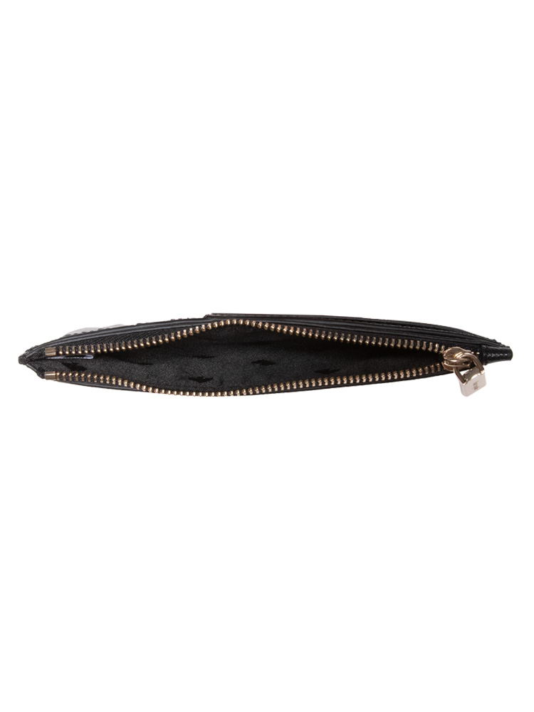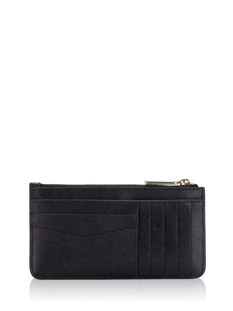 Made of saffiano pvc with 2 way spade jacquard lining. The card holder features an zip closure, gold tone hardware, seven card slots and two slip pocket.