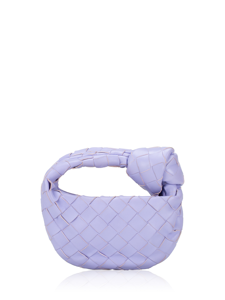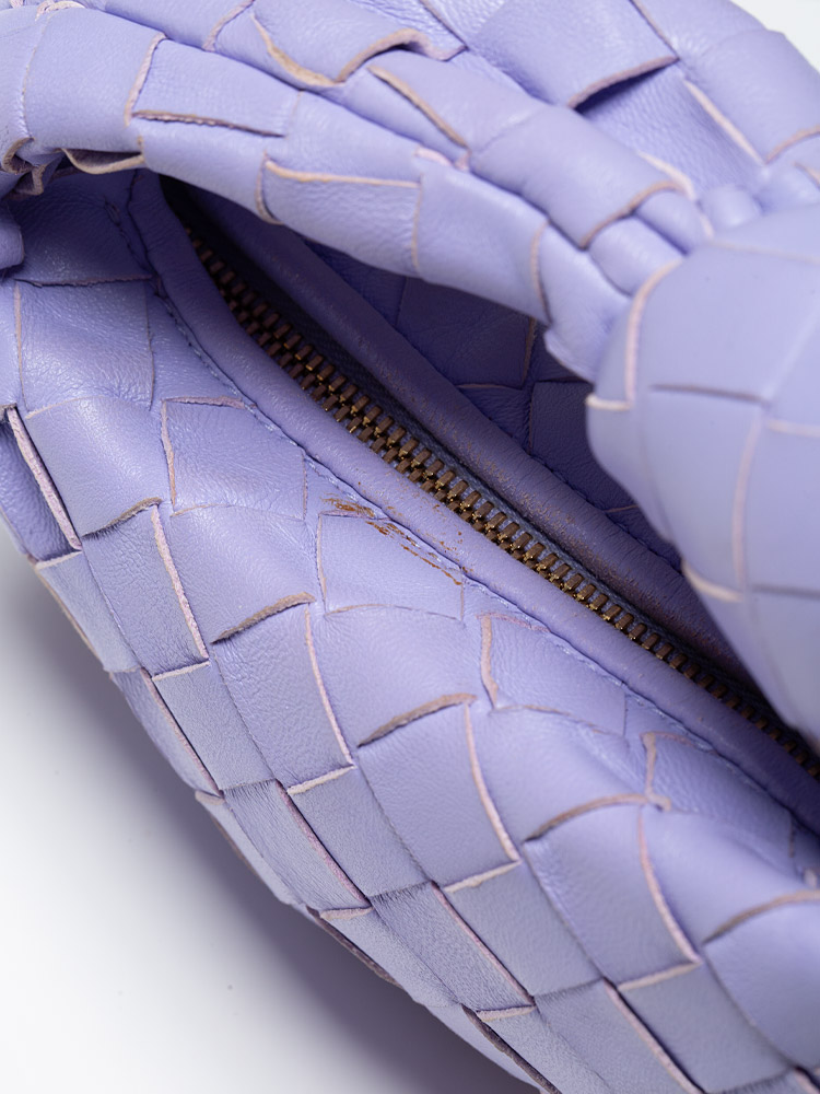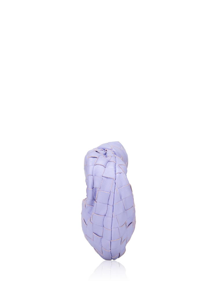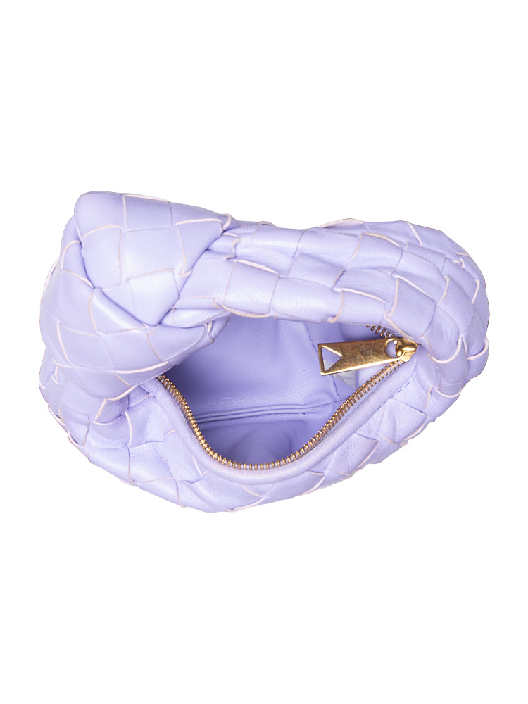 Crafted of soft woven lambskin leather. The shoulder bag features a matching handle and a gold top zipper that opens to a compact leather interior.