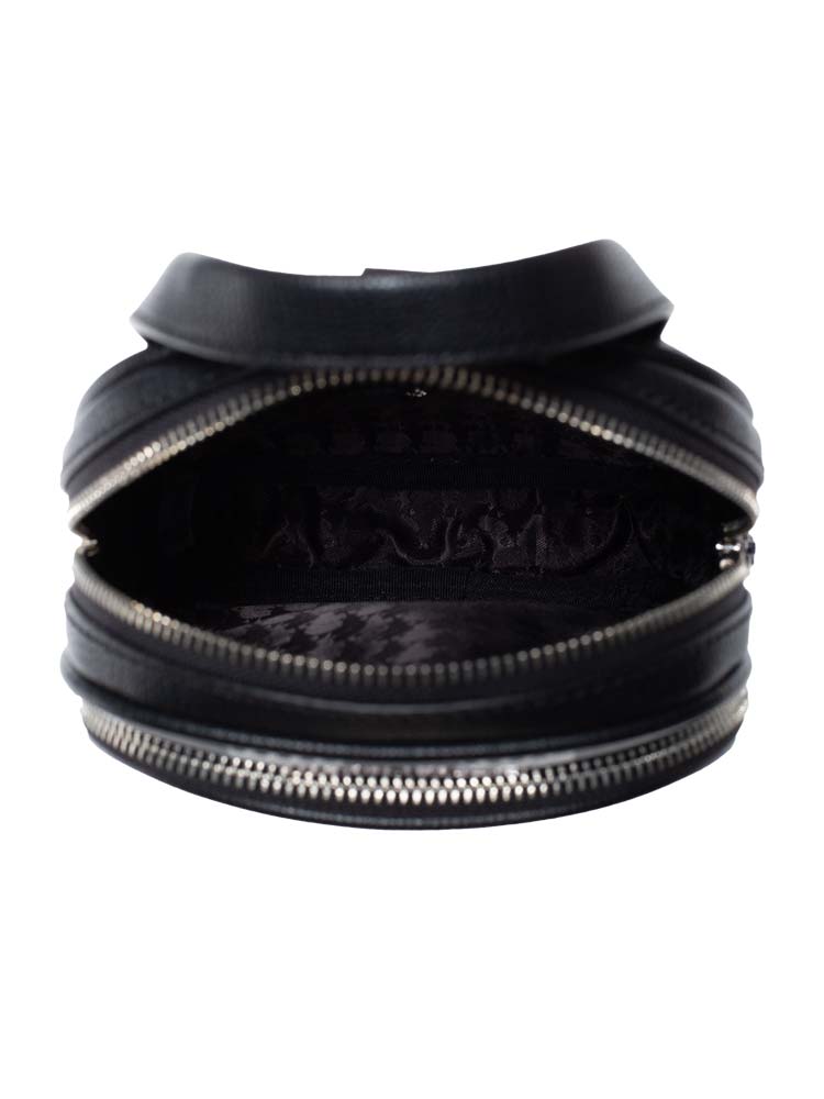 Made of leather. The bag features a zip closure that opens to jacquard lining with interior one slip pocket and exterior one zip pocket at front.