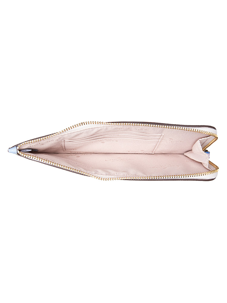 Made of saffiano PVC. The wristlet features a zip closure that opens to fabric lining with three card slots, exterior one slip pocket at back.