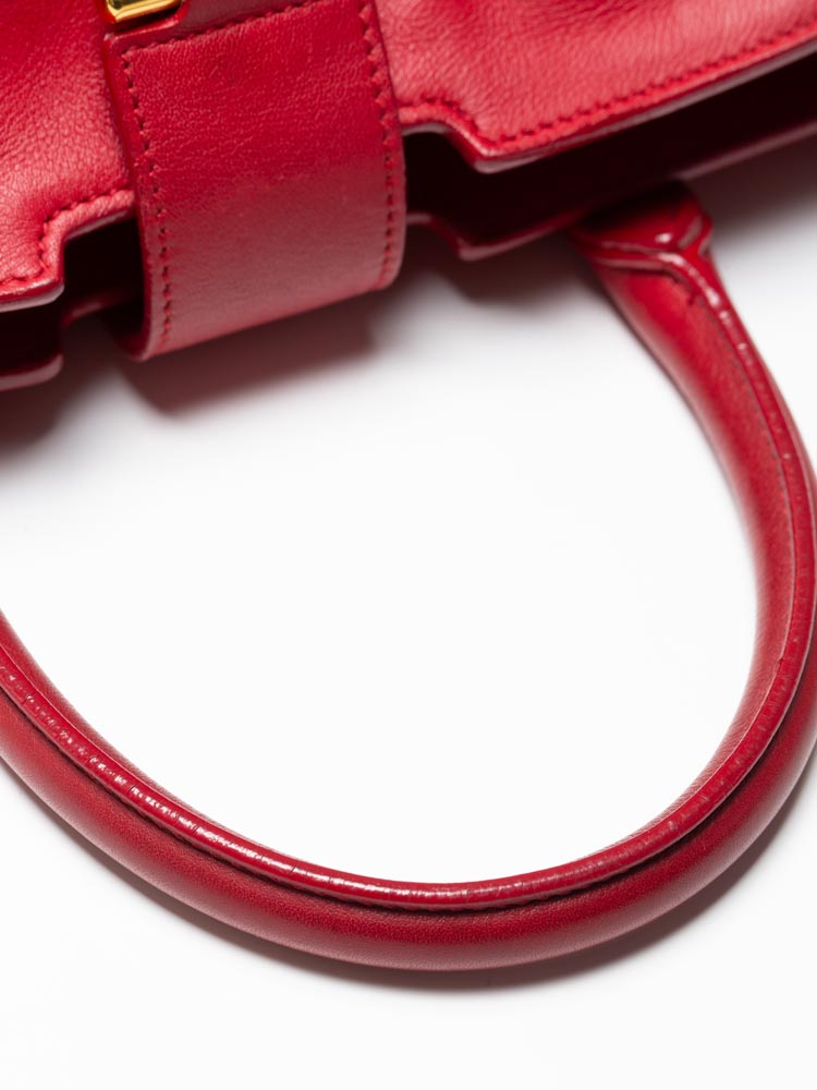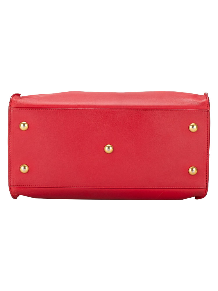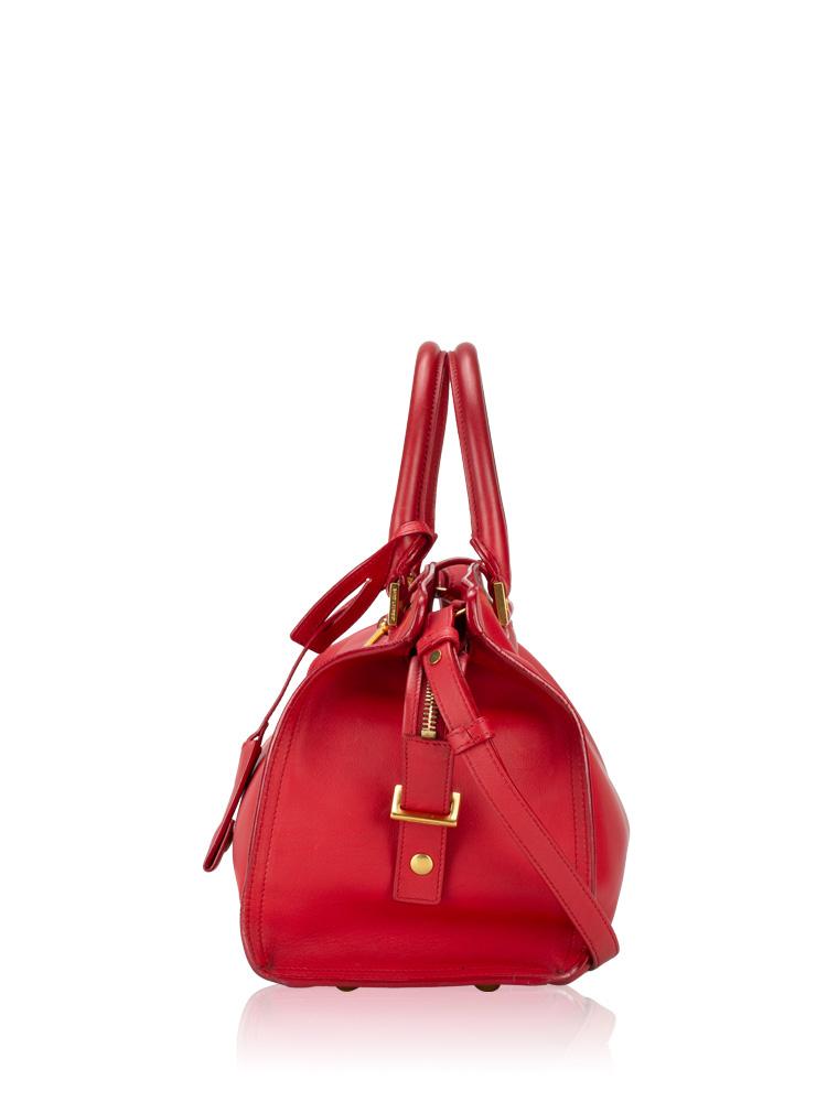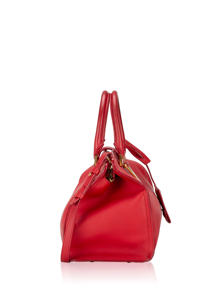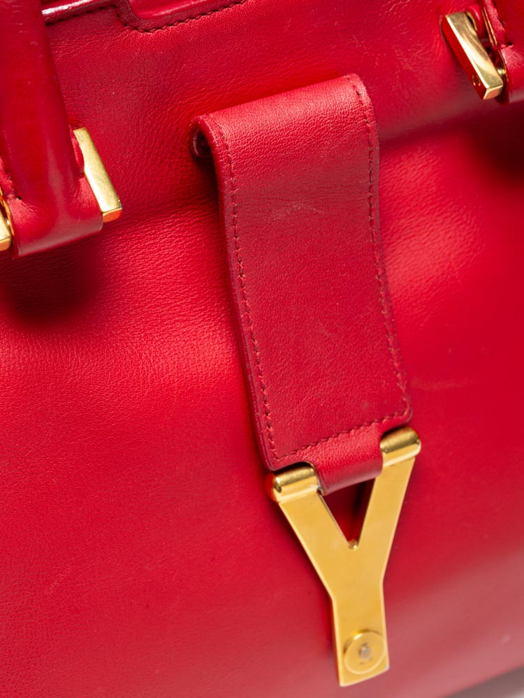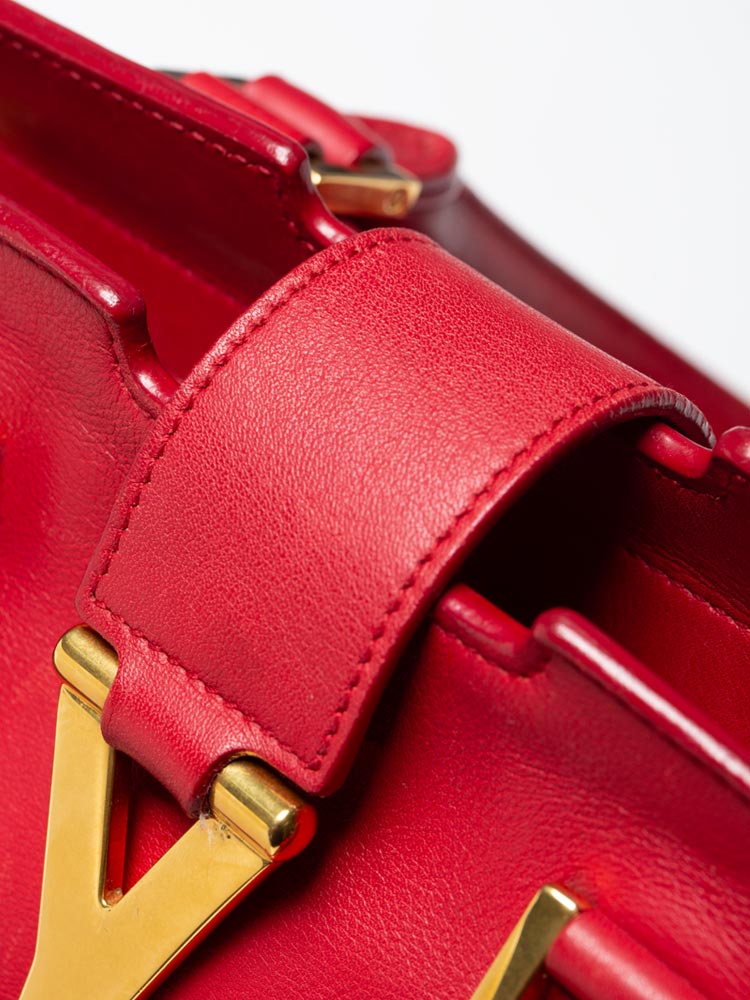 Crafted of smooth calfskin leather. The bag features rolled leather top handles, an optional leather shoulder strap, a crossover strap with a weighted gold Y charm closure and a hanging clochette with a key ring.