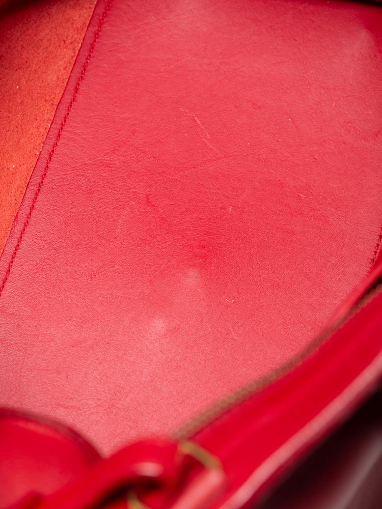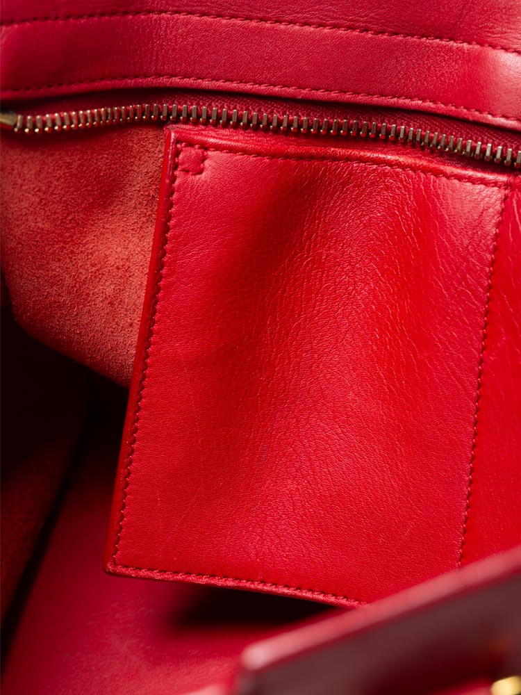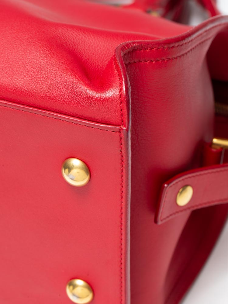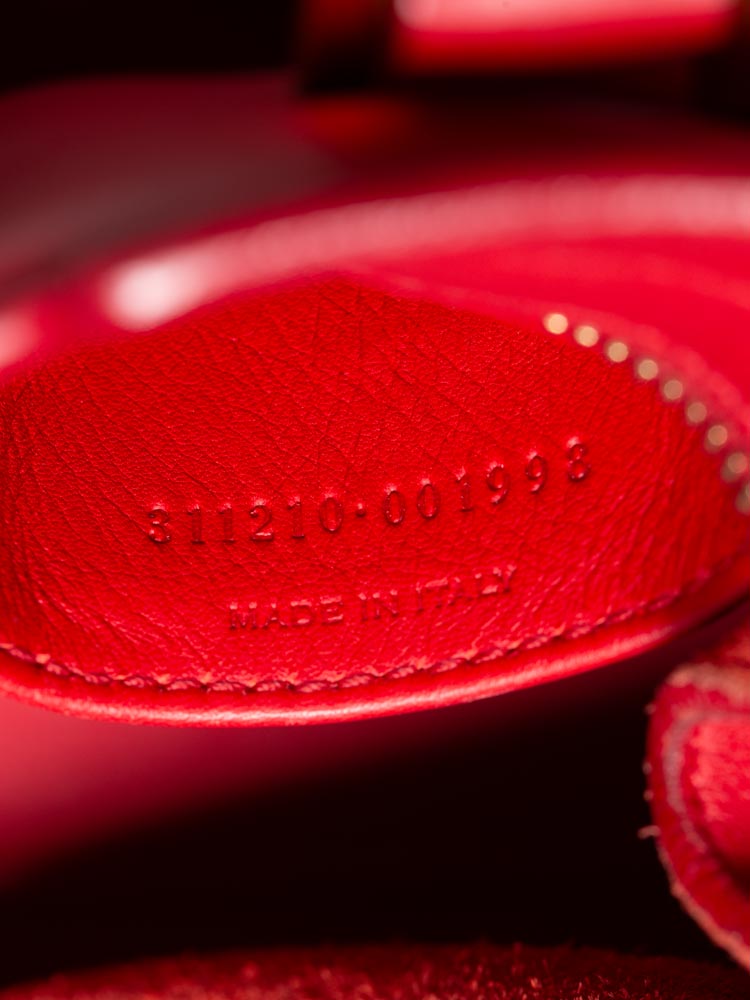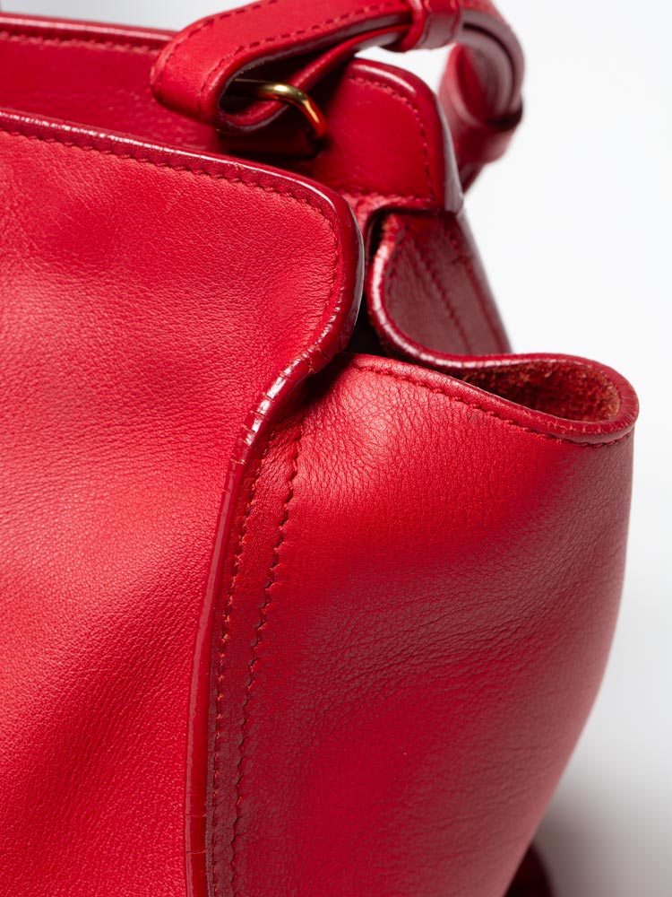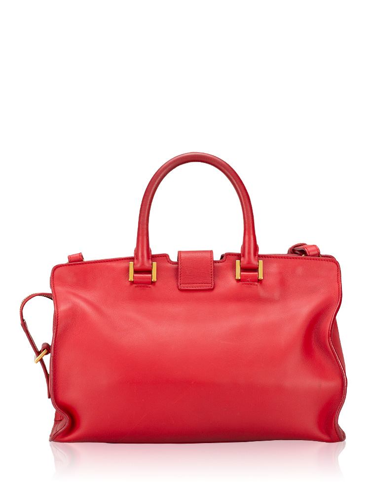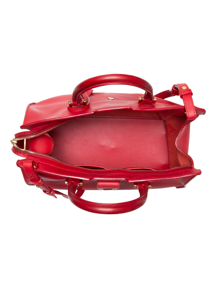 Crafted of smooth calfskin leather. The bag features rolled leather top handles, an optional leather shoulder strap, a crossover strap with a weighted gold Y charm closure and a hanging clochette with a key ring.