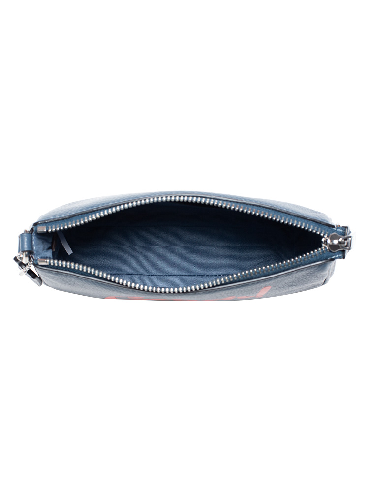 Made of refined pebble leather with fabric lining. The bag features an open zip closure, silver tone hardware and two card slots.