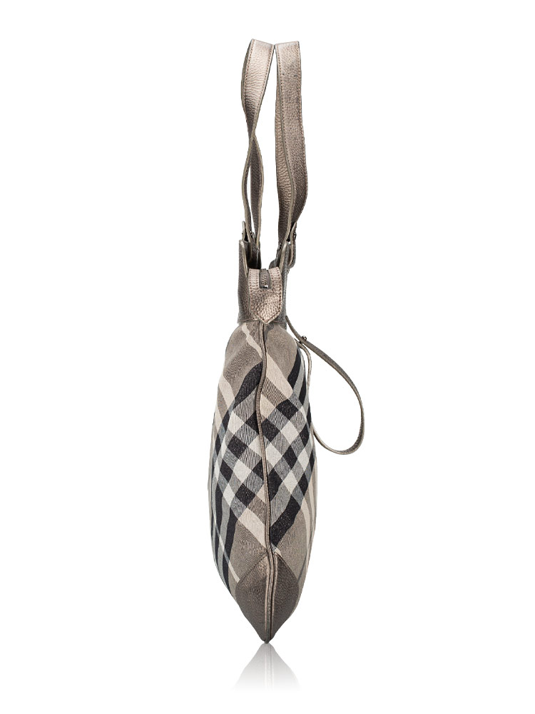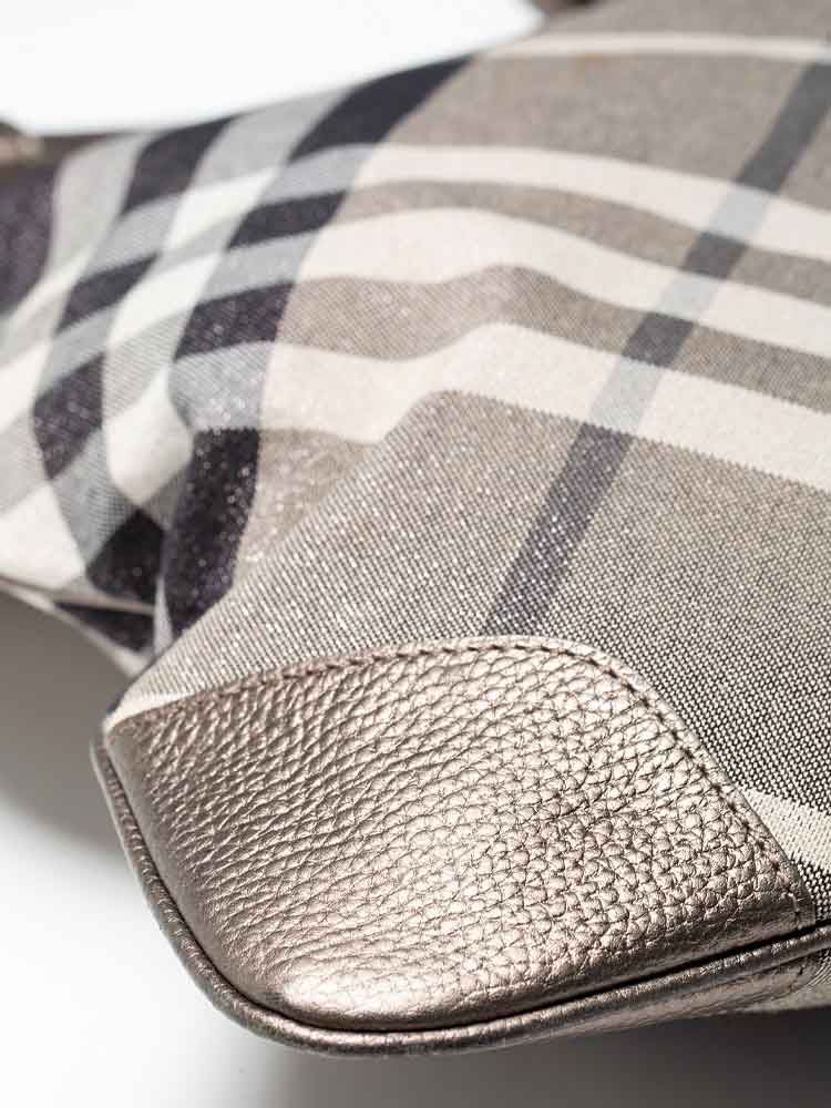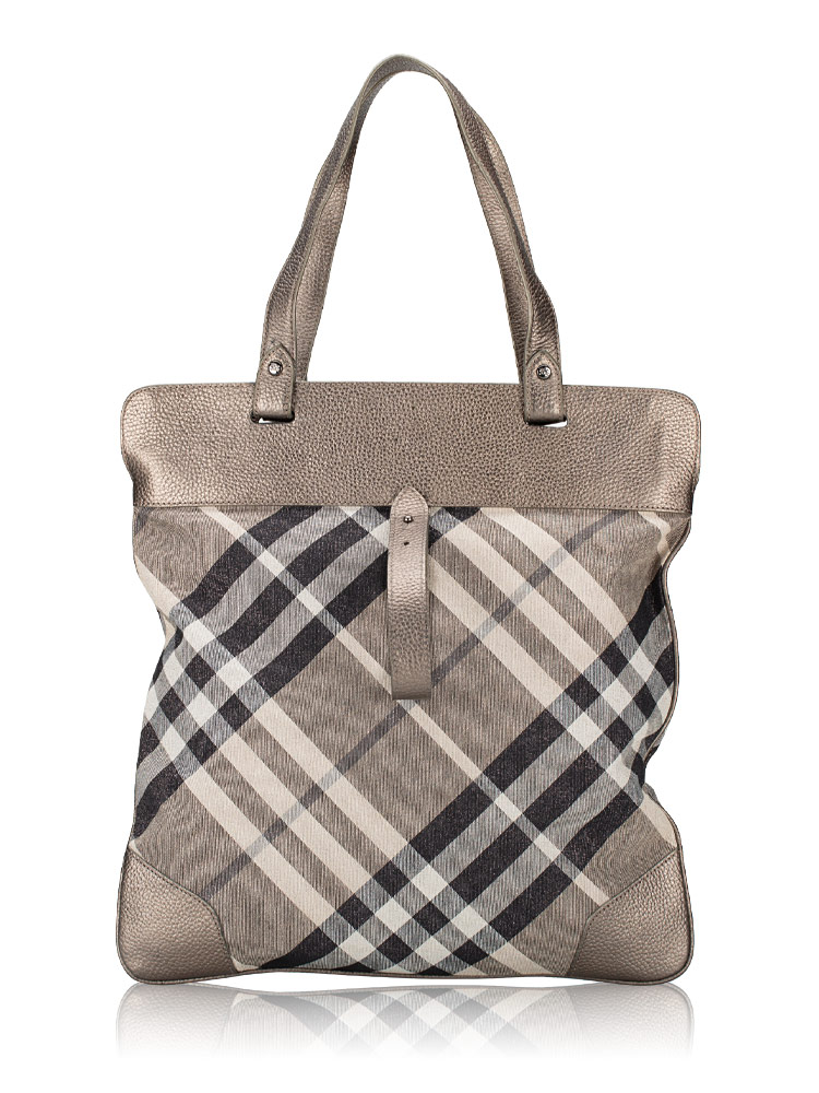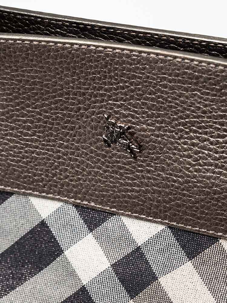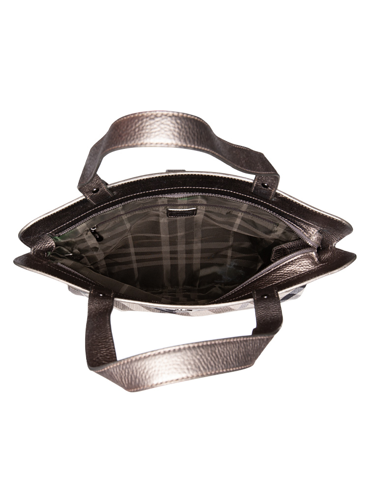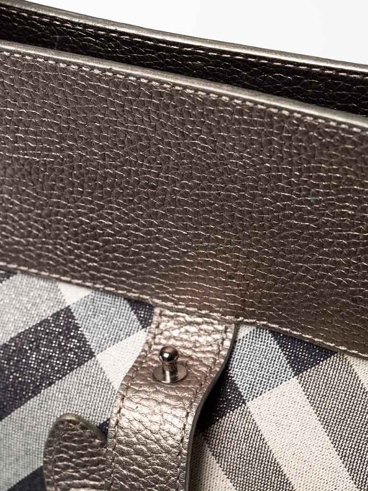 This tote is crafted of metallic nova check canvas and leather trim in grey. Features matching grey strap leather handles and leather trim at the corners, and top crest. The top zipper opens to a jacquard interior with zipper and patch pockets.