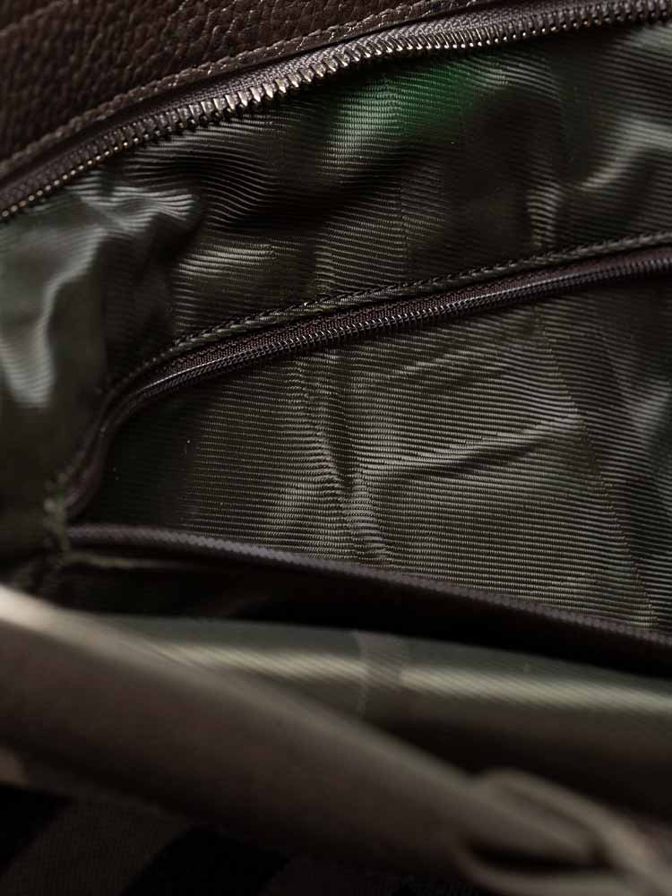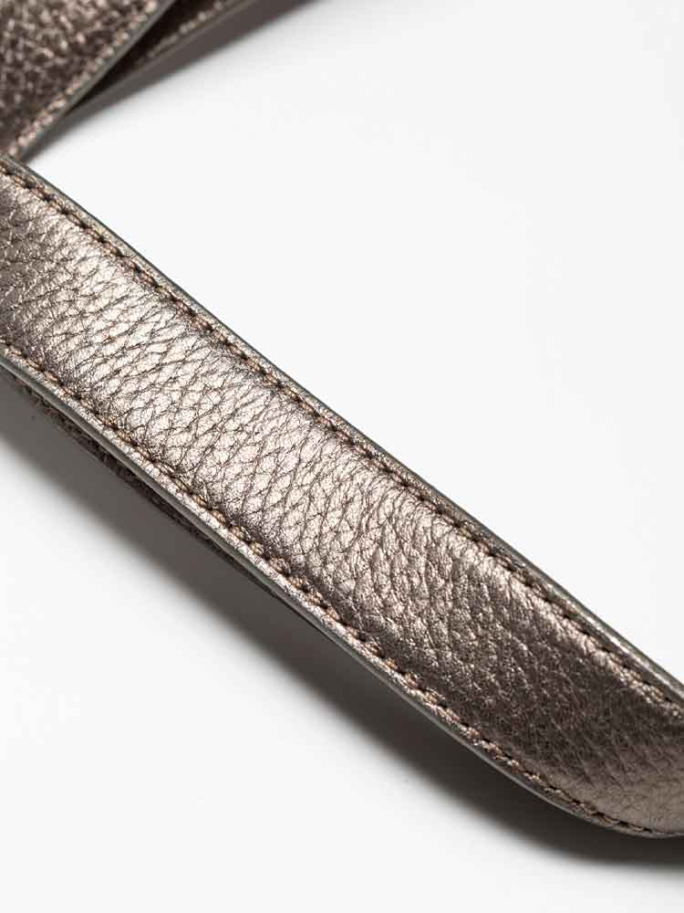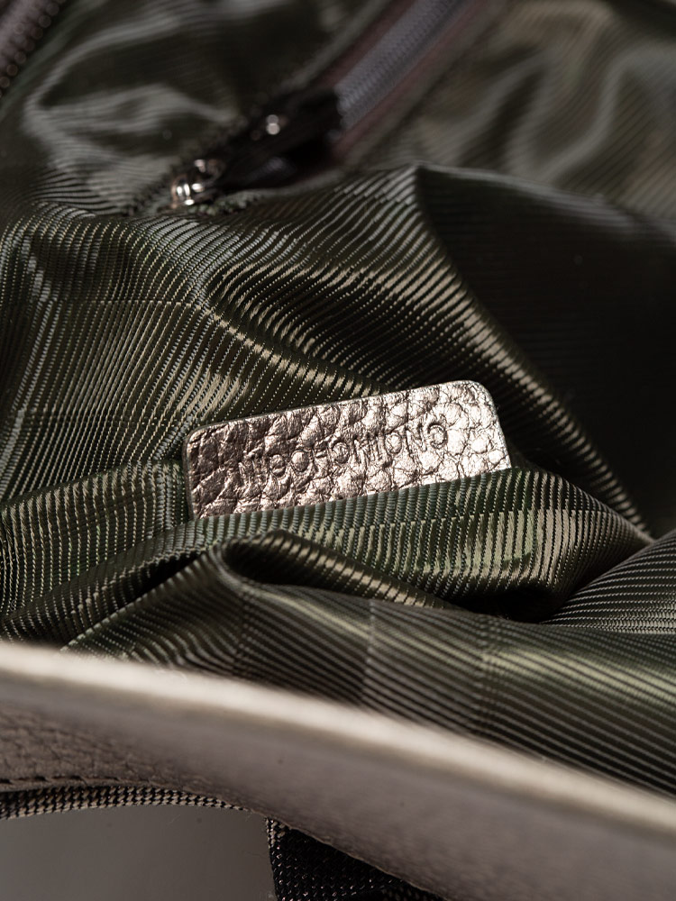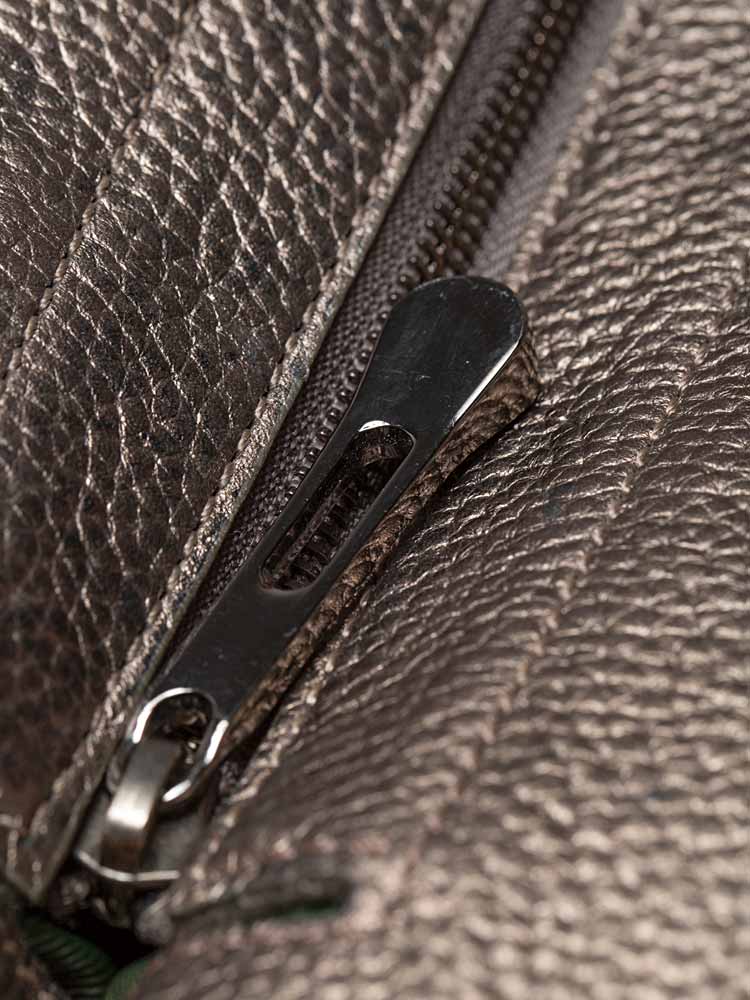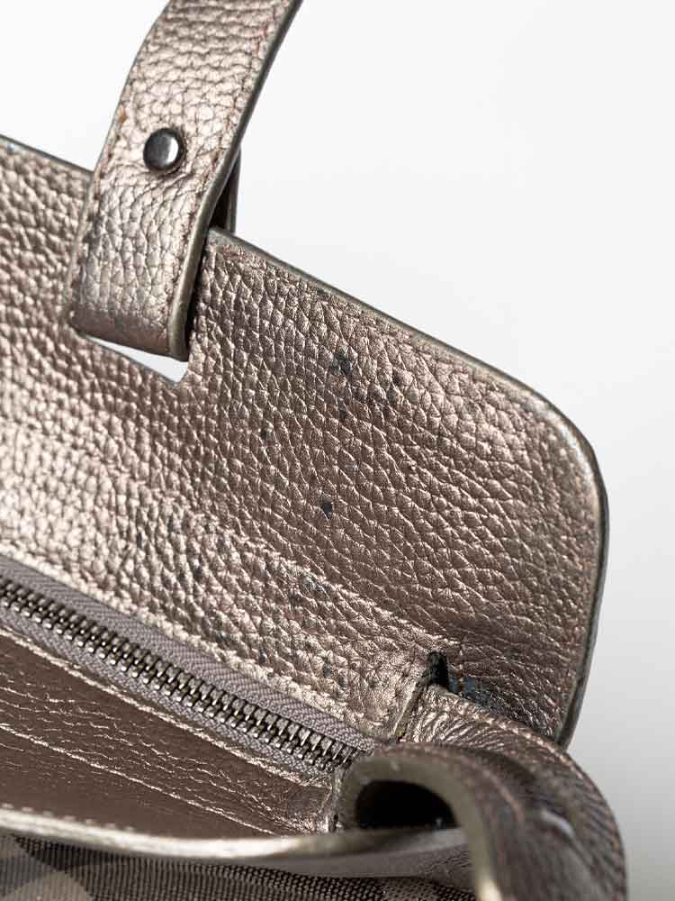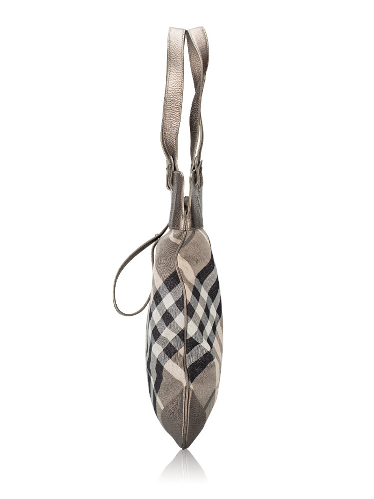 This tote is crafted of metallic nova check canvas and leather trim in grey. Features matching grey strap leather handles and leather trim at the corners, and top crest. The top zipper opens to a jacquard interior with zipper and patch pockets.