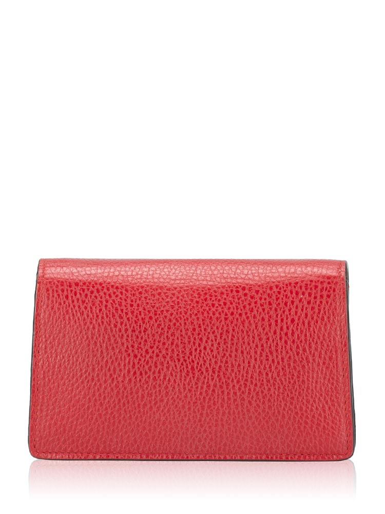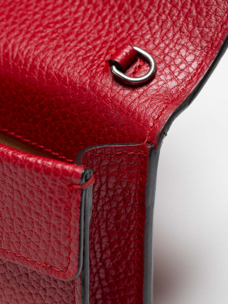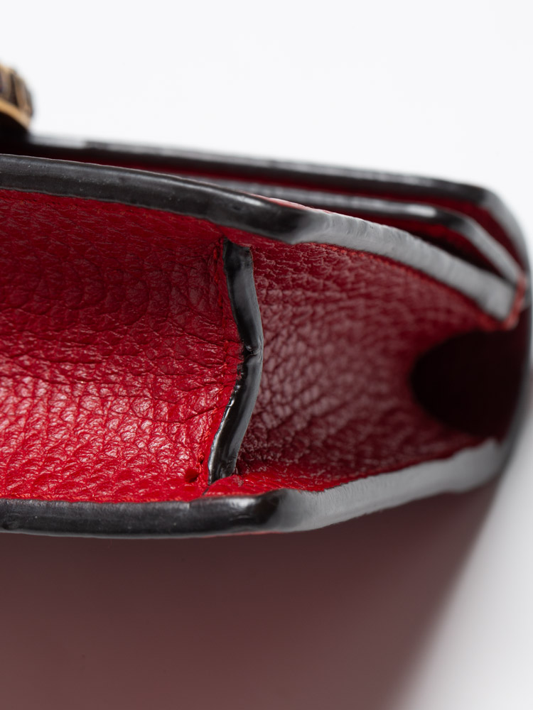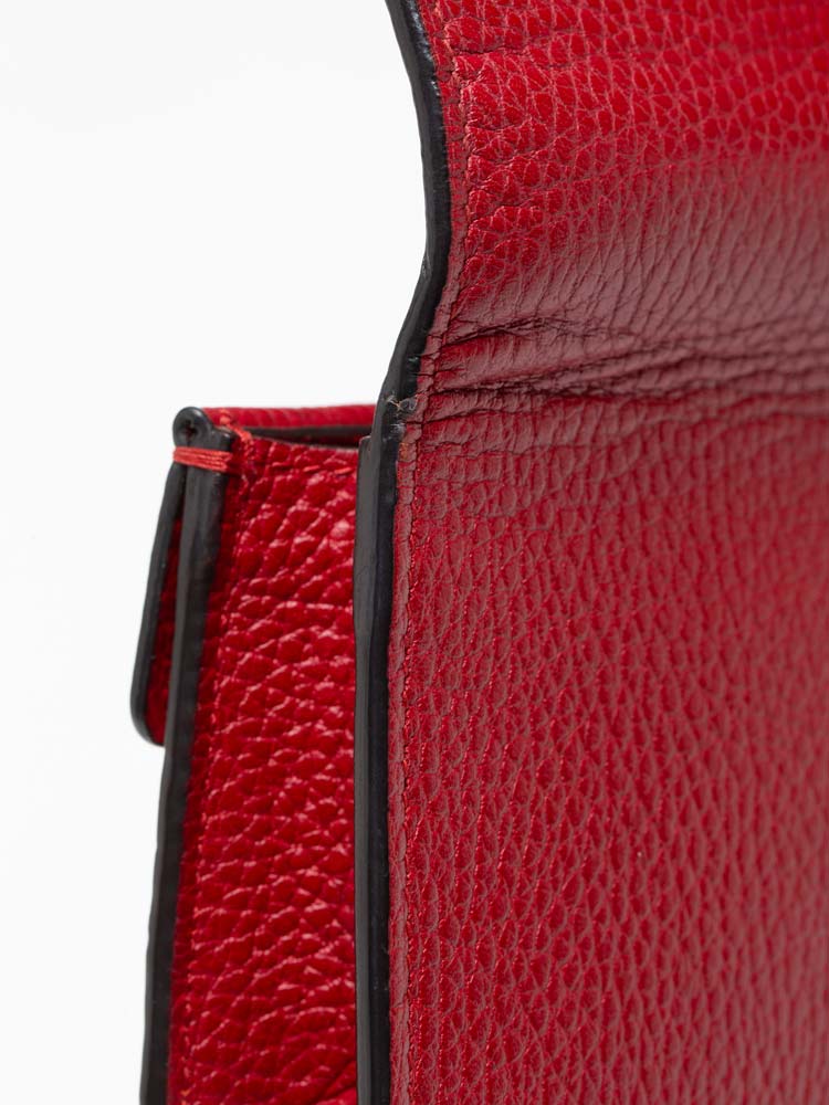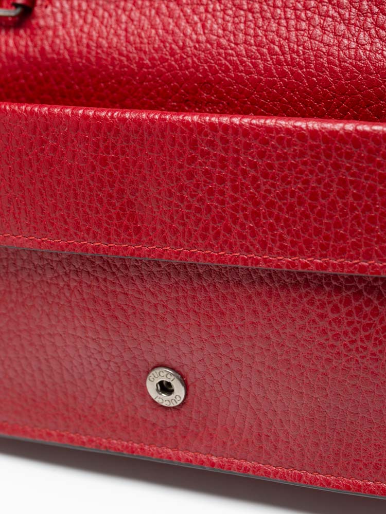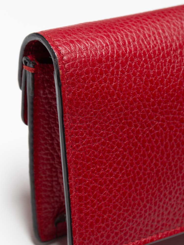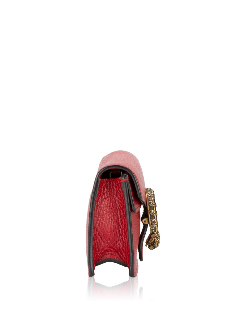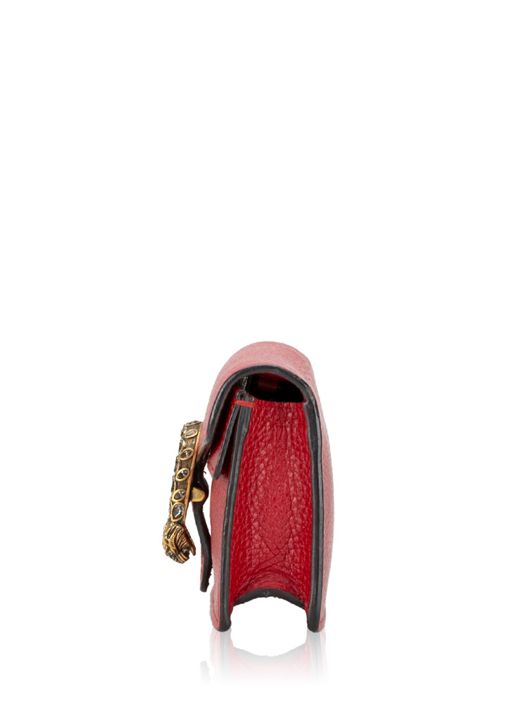 This petite bag is crafted of grained calfskin in red. This shoulder bag features an aged silver chain shoulder strap and a gold textured horseshoe tiger spur closure encrusted with crystals.