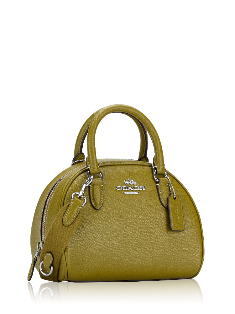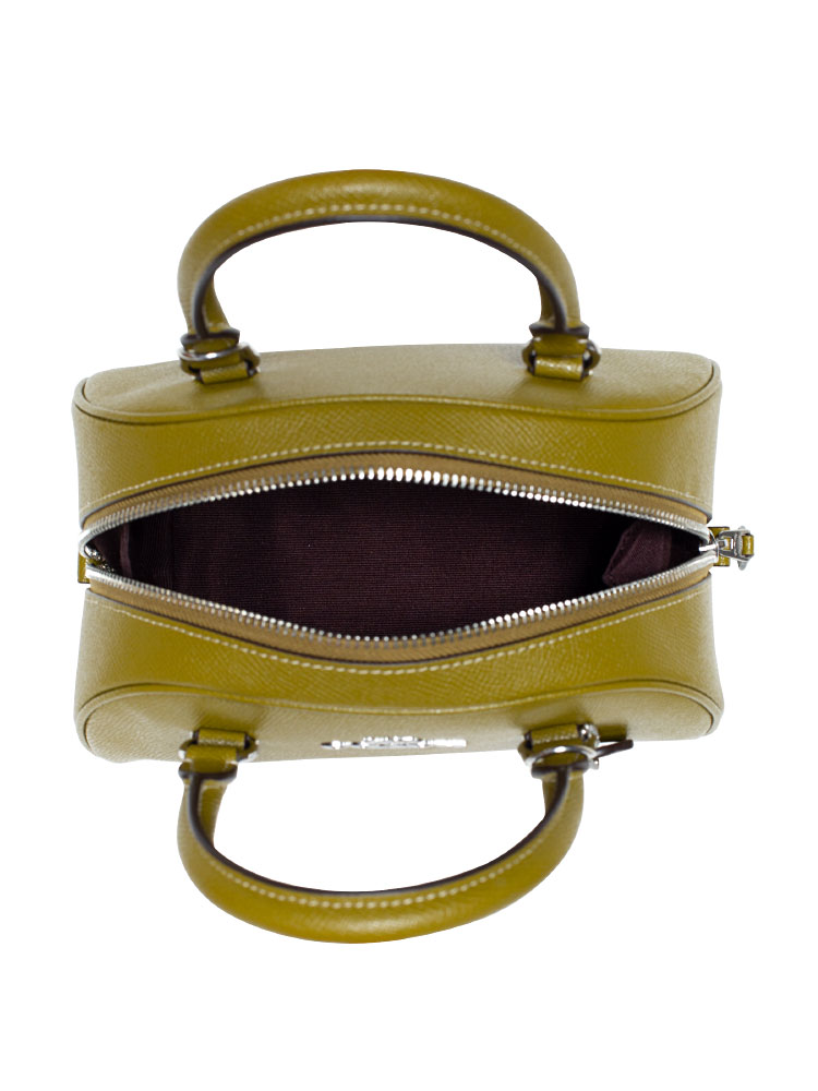 Made of crossgrain leather. The bag features a zip closure that opens to fabric lining with one slip pocket, double handles drop 10 cm, adjustable and removable long strap.