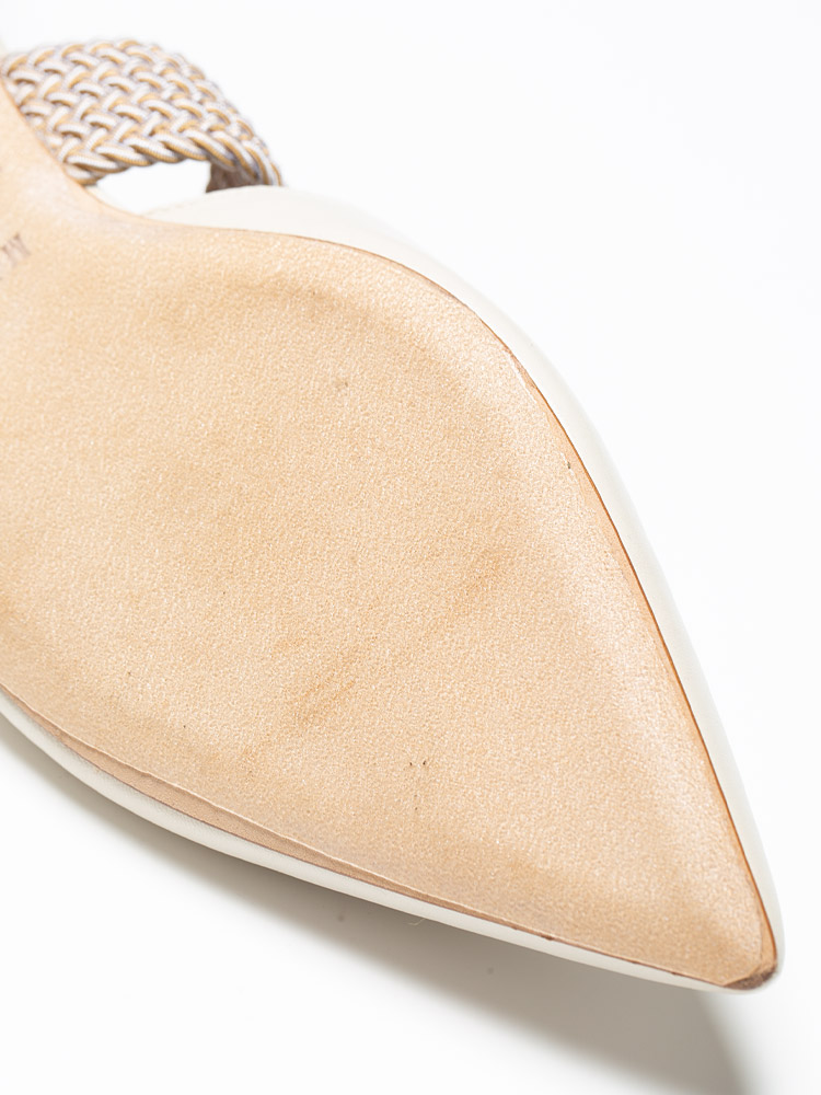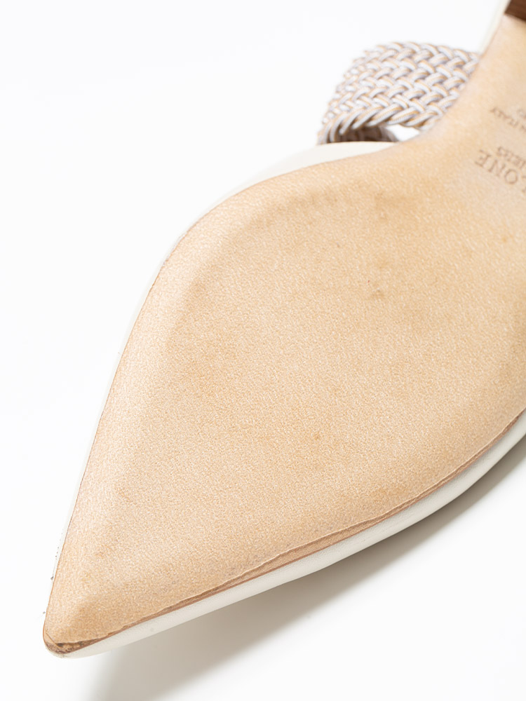 Crafted of lamb skin leather. Features a pointed toe shoes balance with feminine V-cut vamp and a chunky braided elastic strap.