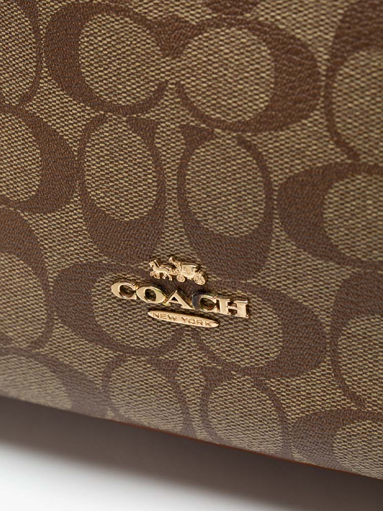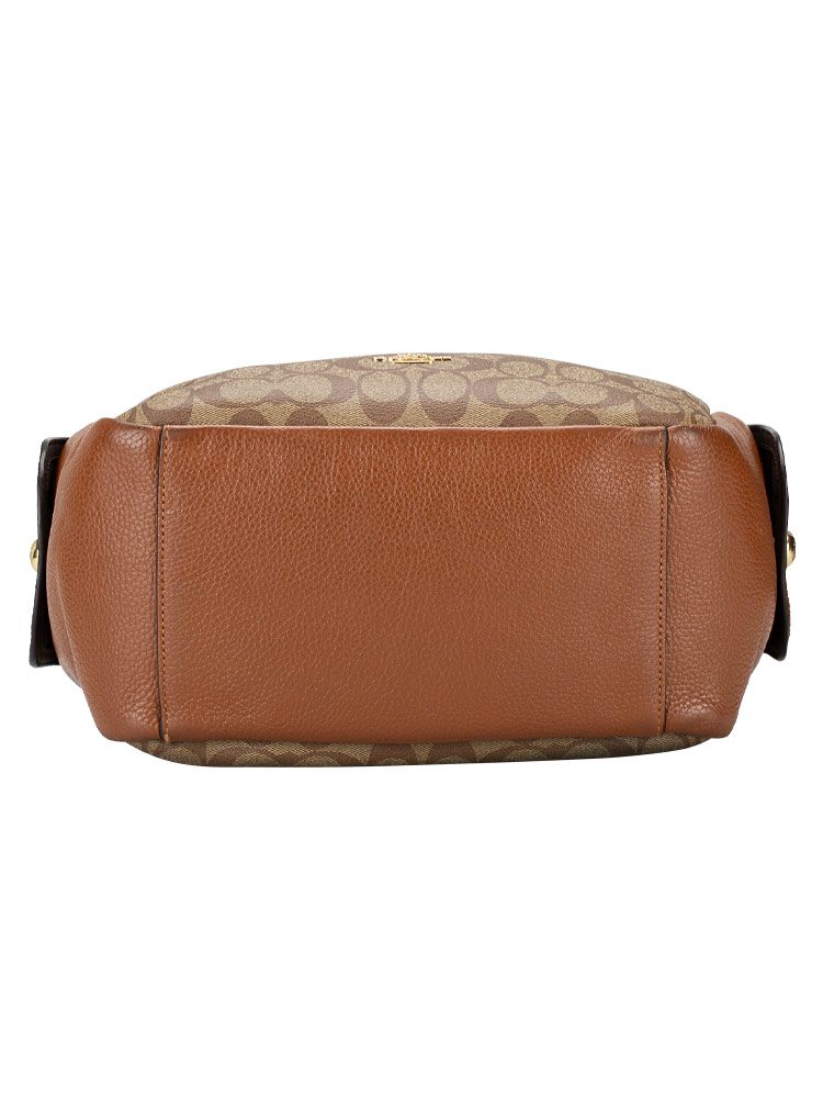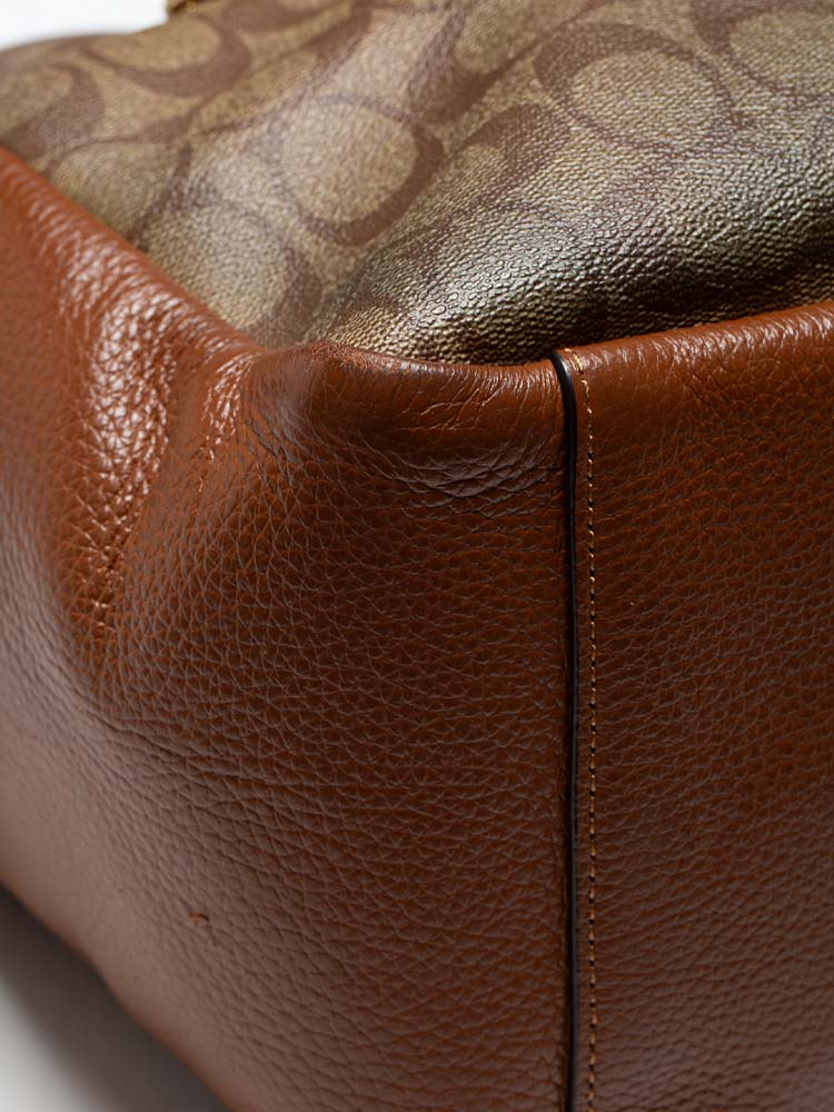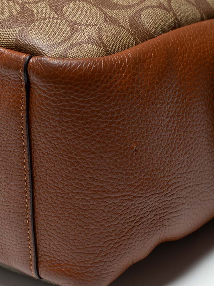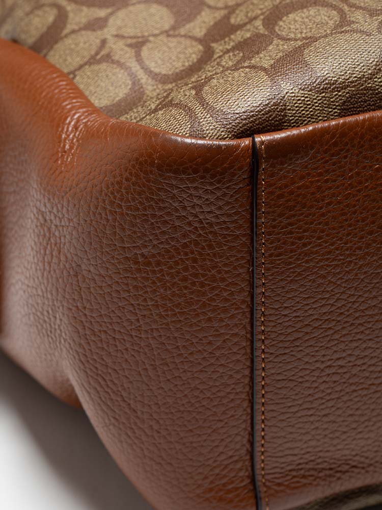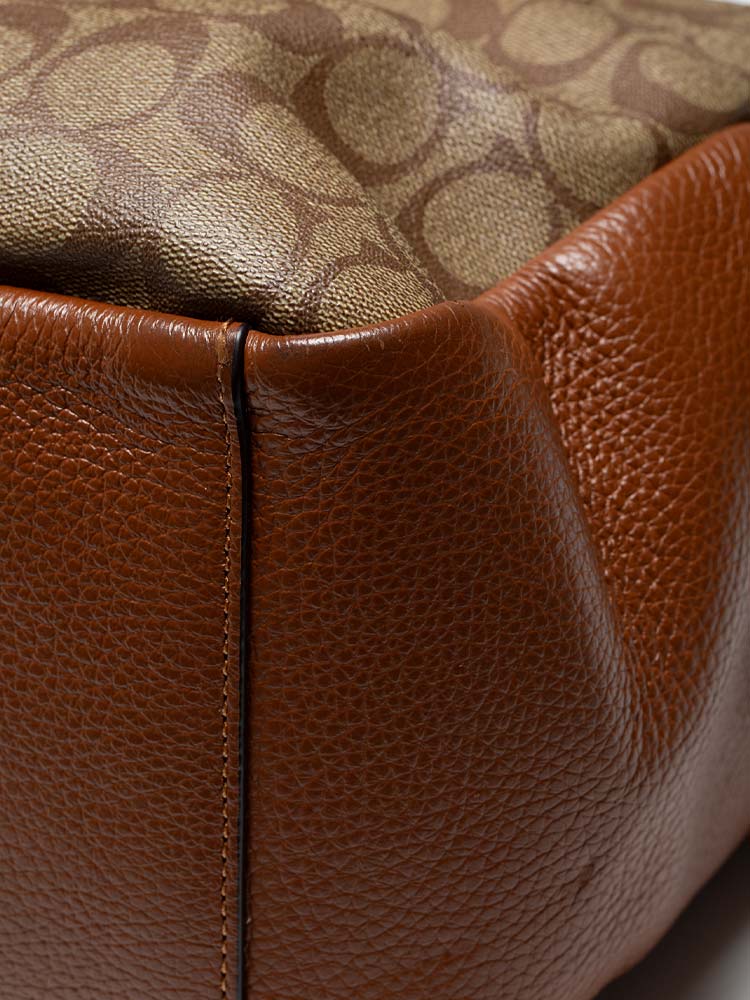 Signature coated canvas and refined pebble leather. Inside zip pocket. Zip-top closure, fabric lining. Detachable handle with 7 inc drop. Outside zip and snap pockets. Detachable strap with 20 3/4 inc drop for shoulder or crossbody wear. 10 3/4 (L) x 11 3/4 (H) x 5 1/4 (W) inc.