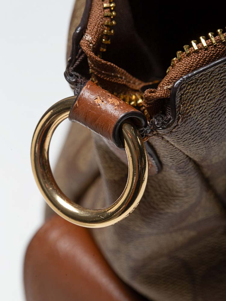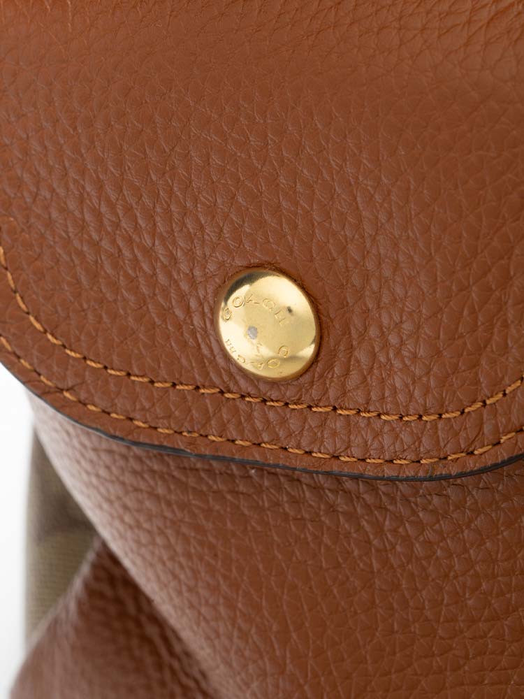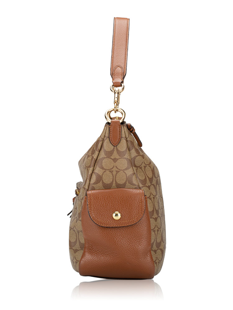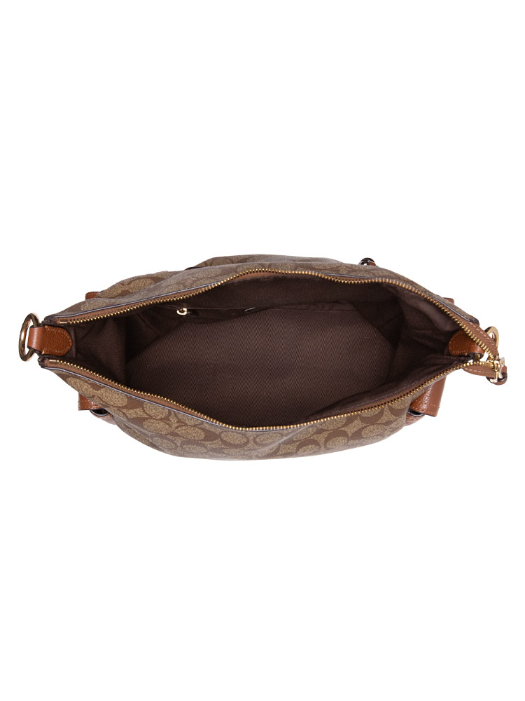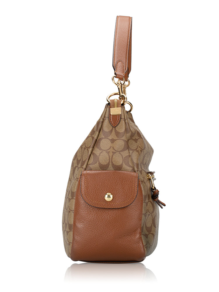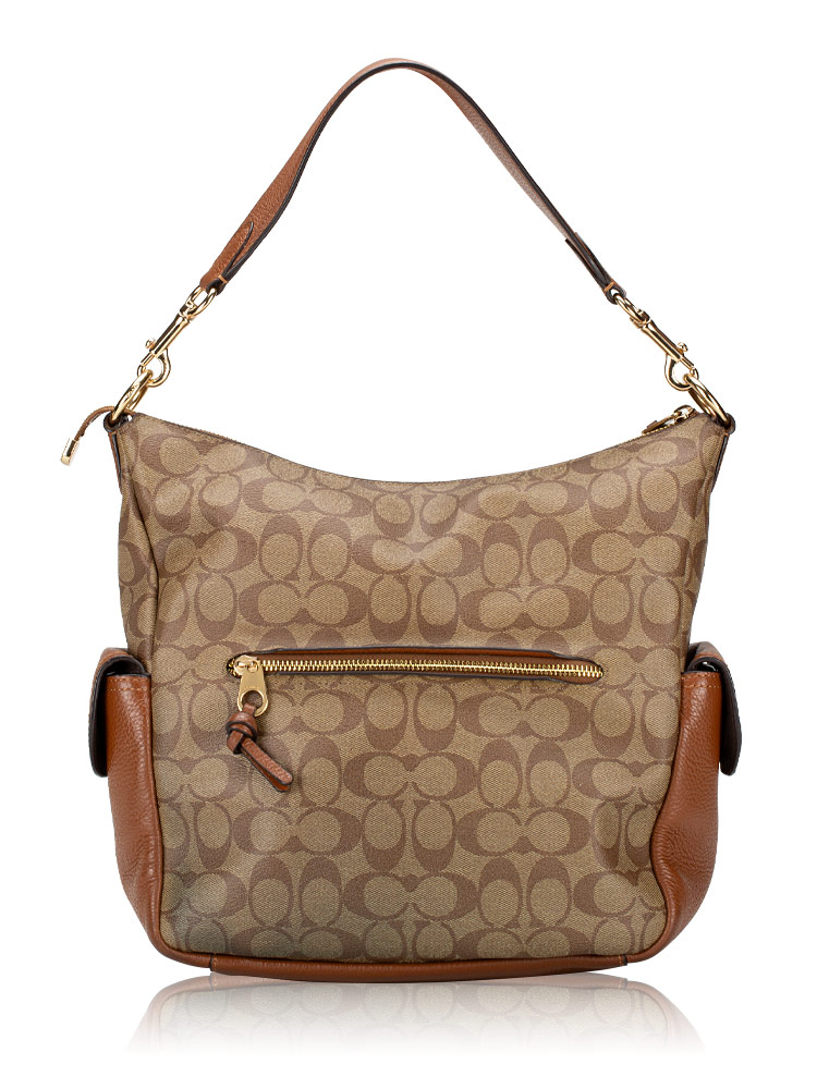 Signature coated canvas and refined pebble leather. Inside zip pocket. Zip-top closure, fabric lining. Detachable handle with 7 inc drop. Outside zip and snap pockets. Detachable strap with 20 3/4 inc drop for shoulder or crossbody wear. 10 3/4 (L) x 11 3/4 (H) x 5 1/4 (W) inc.