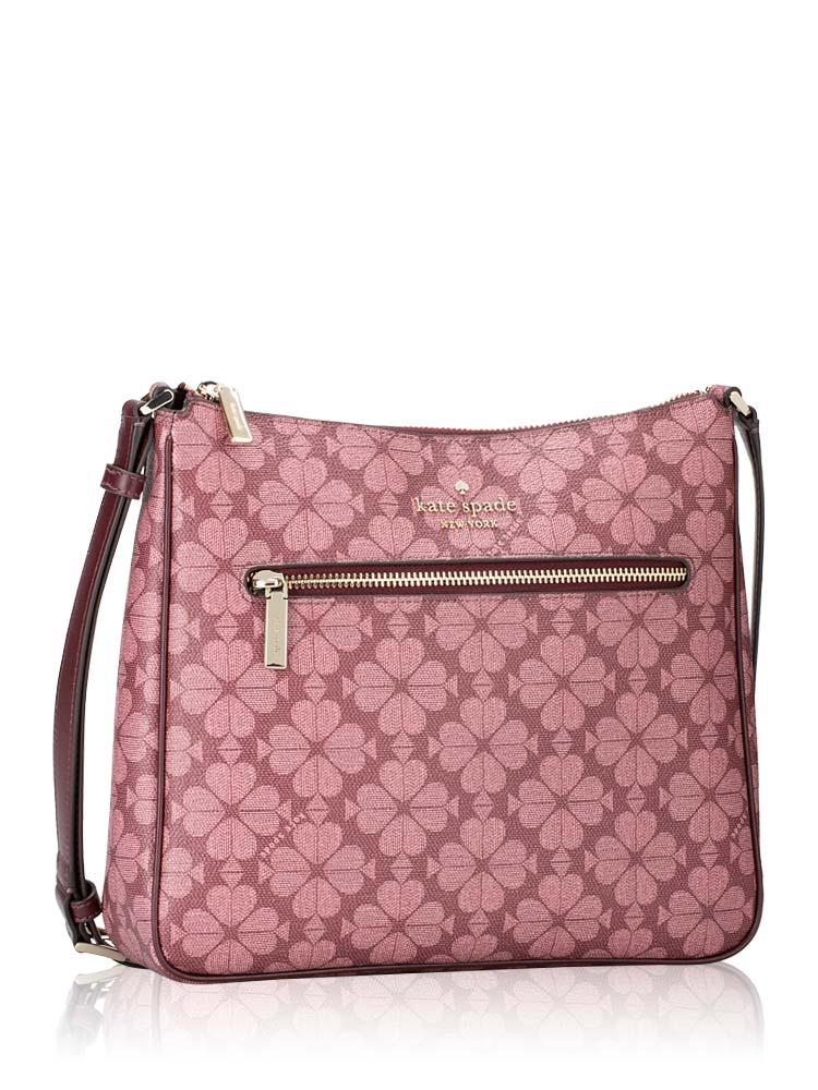Made of spade flower PVC. The bag features a zip closure that opens to two way script logo lining with interior two slip pockets and exterior one zip pocket at front.