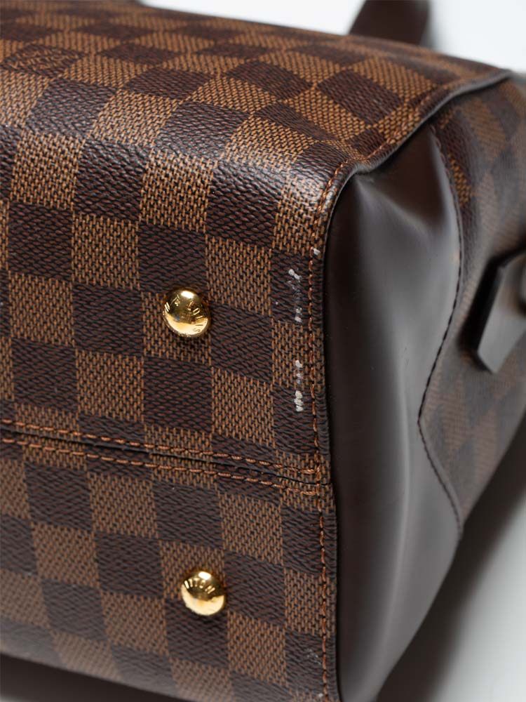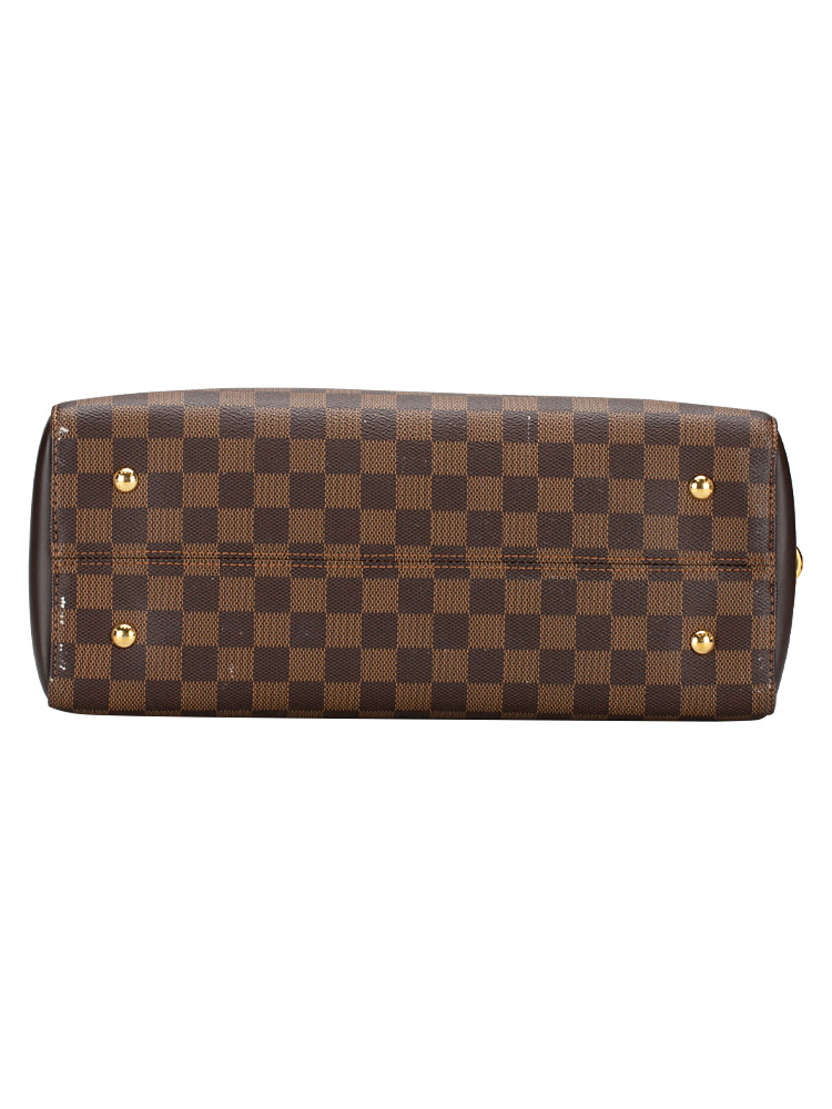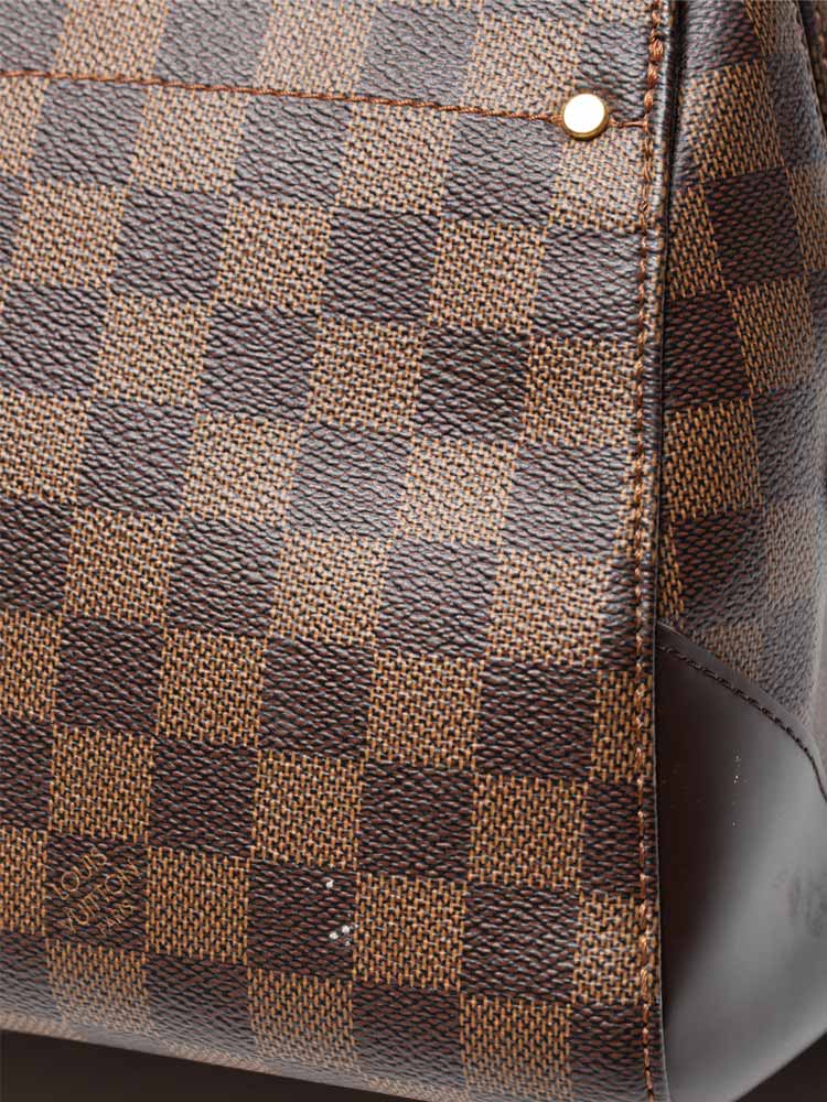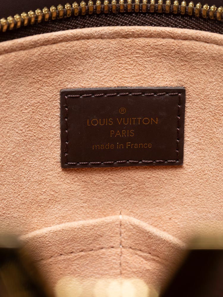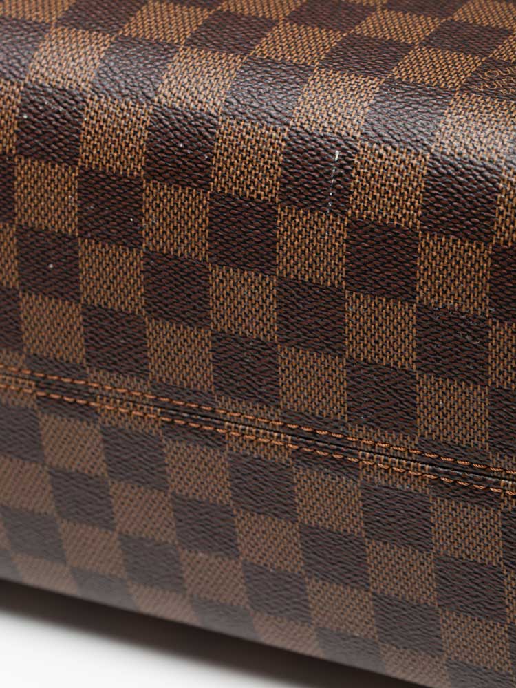 Crafted of Damier Ebene coated canvas material. It features double top handles, an optional shoulder strap, and a cut out V at the top. The top opens to a microfiber interior with a central zipper compartment with patch pockets.
