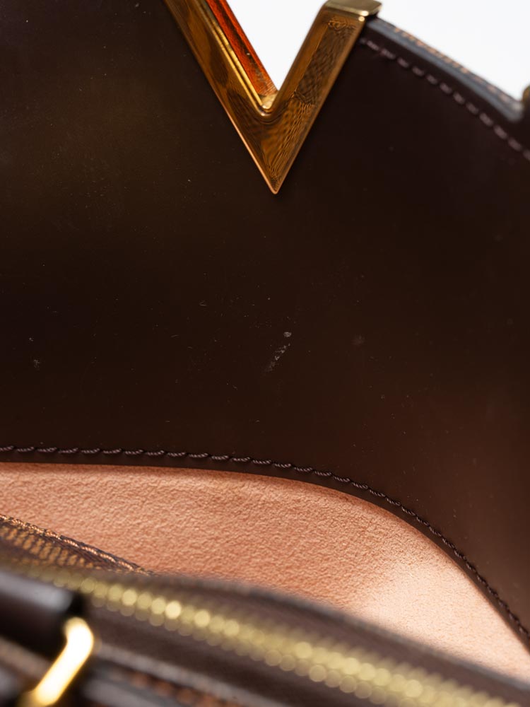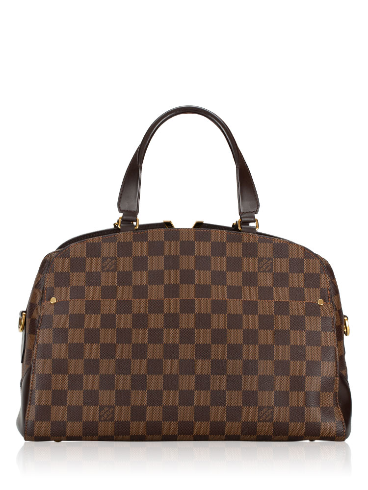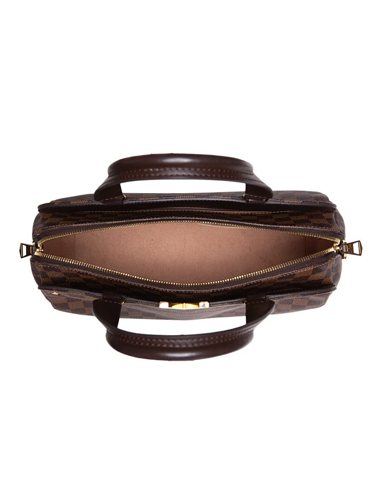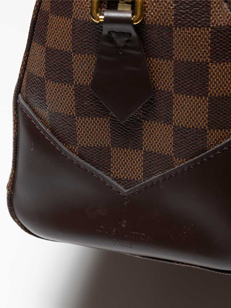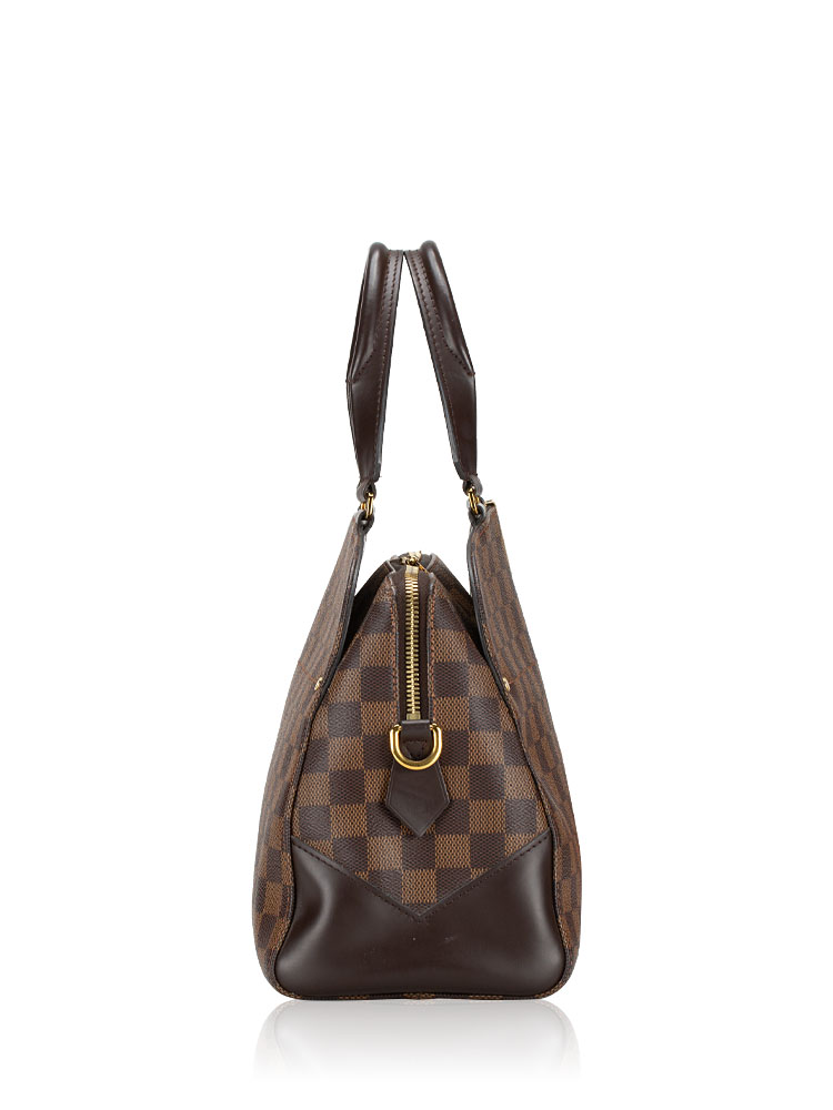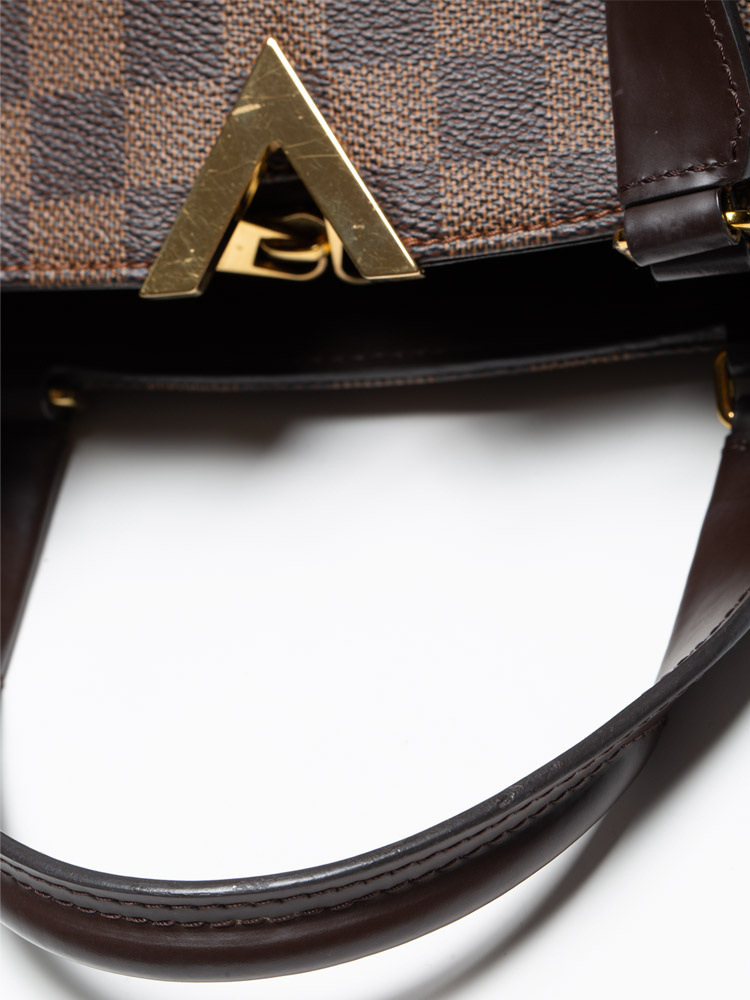 Crafted of Damier Ebene coated canvas material. It features double top handles, an optional shoulder strap, and a cut out V at the top. The top opens to a microfiber interior with a central zipper compartment with patch pockets.