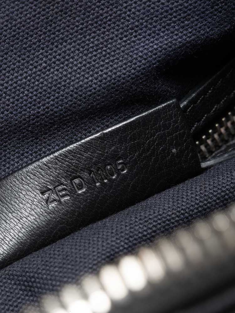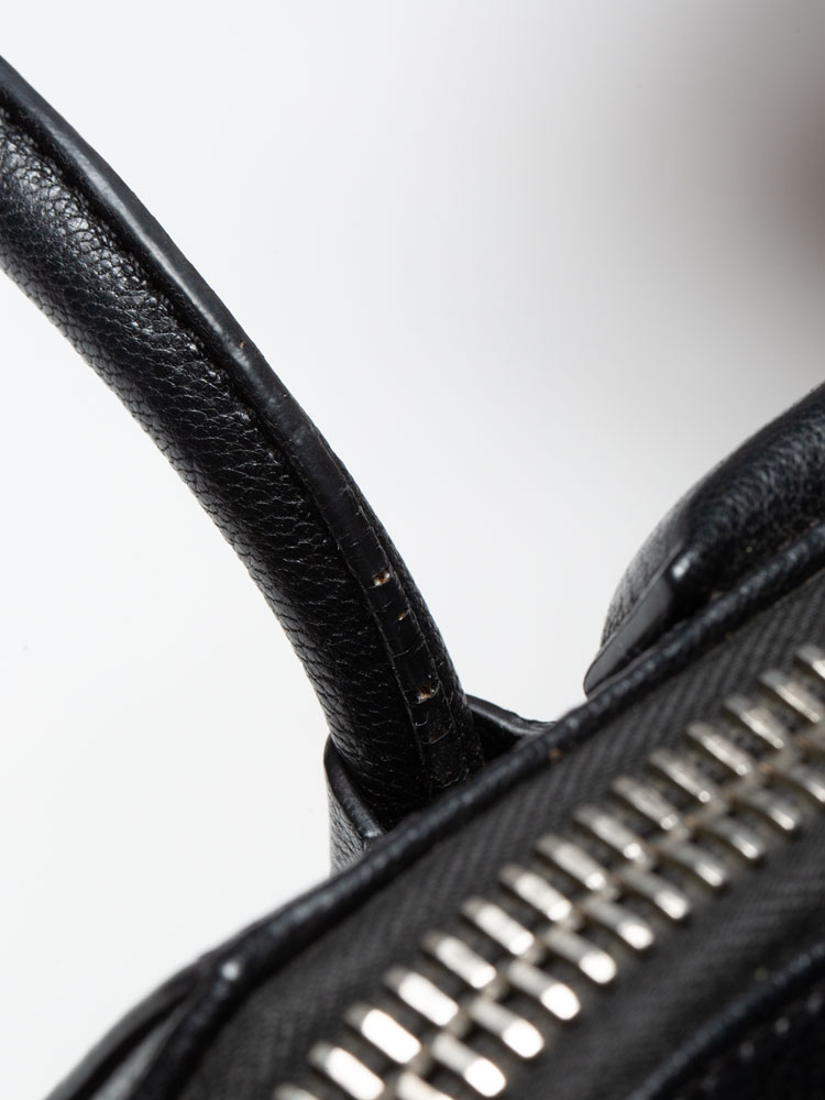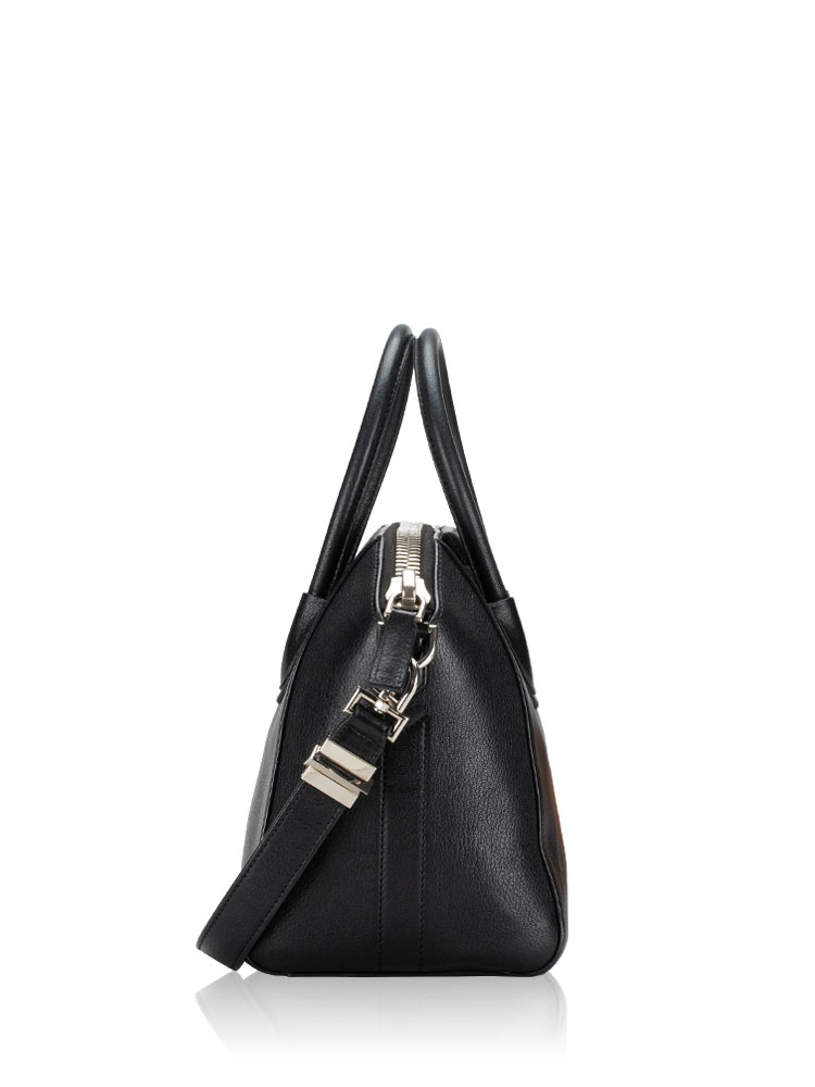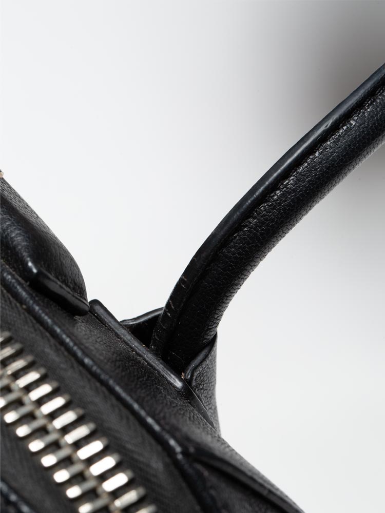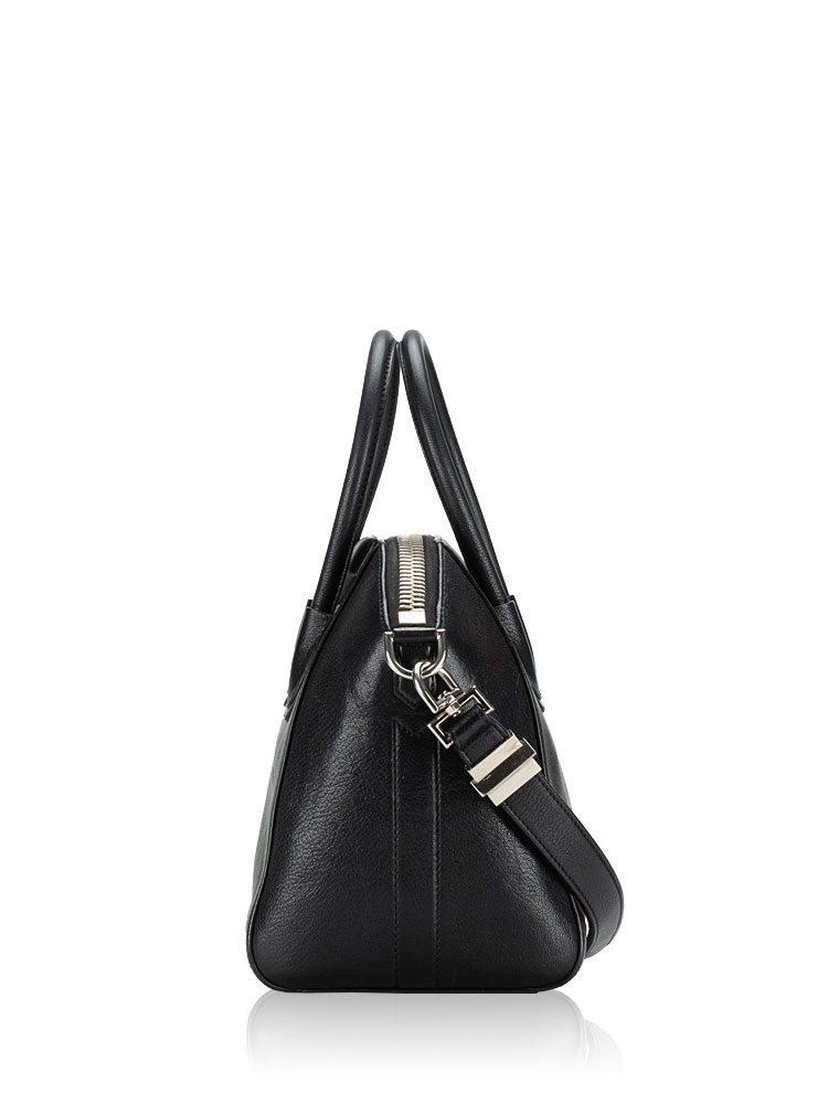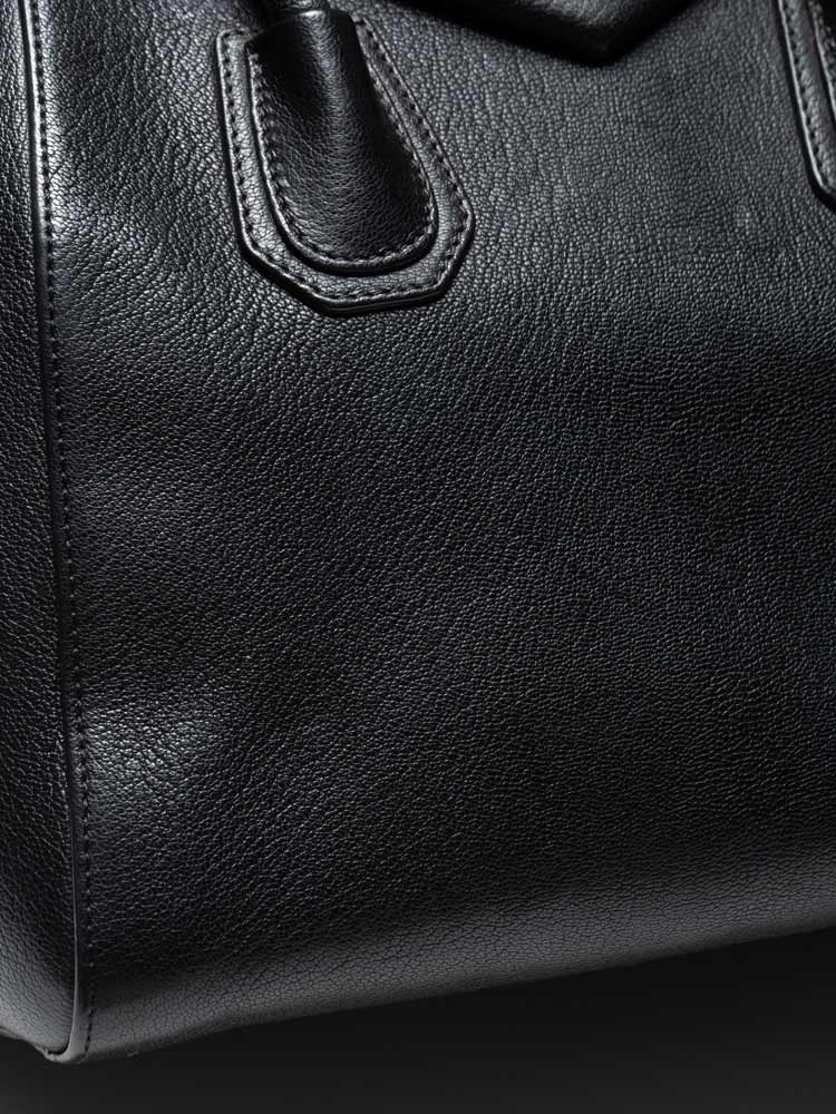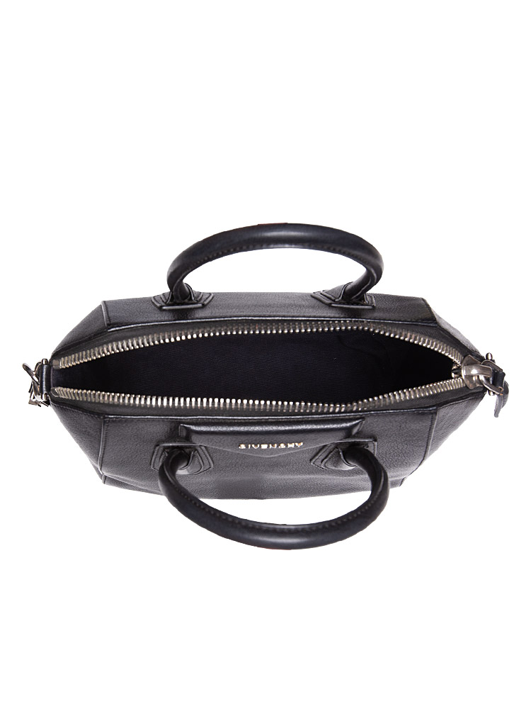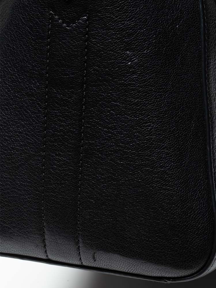 This bag is crafted of goatskin material. It features double top handles, shoulder strap, and expansive sides. The top zipper opens to a fabric material with slip and zipper pockets.