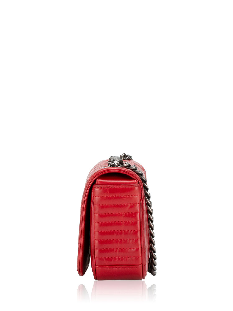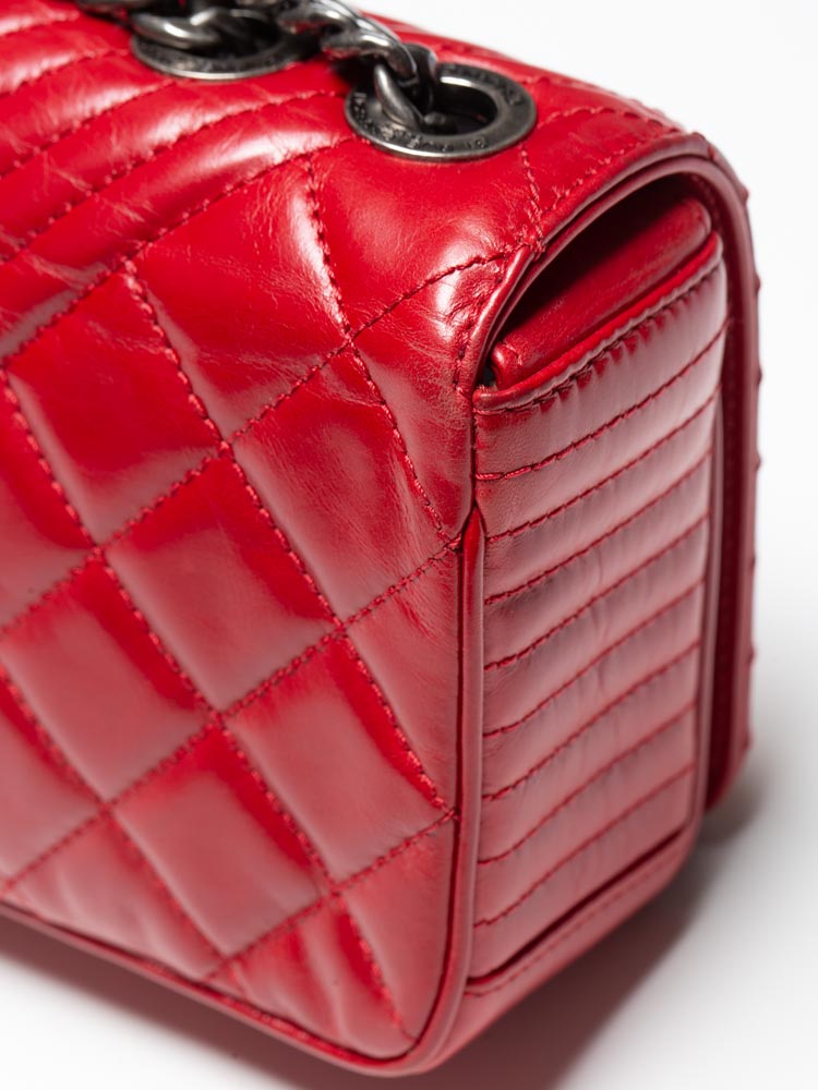 Crafted of glazed calfskin quilted leather with diamond and chevron quilting. The bag features a chain link cross body shoulder strap and a facing a ruthenium CC press lock. The flap opens to a fabric interior with a zipper pocket.