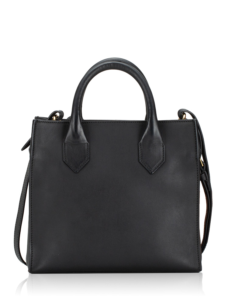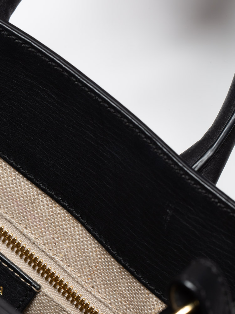 Crafted of lizard skin and calfskin material. This petite tote has rolled leather top handles and a leather cross body shoulder strap. There is a facing exterior flap pocket with a gold lock. The top is open to a linen interior.