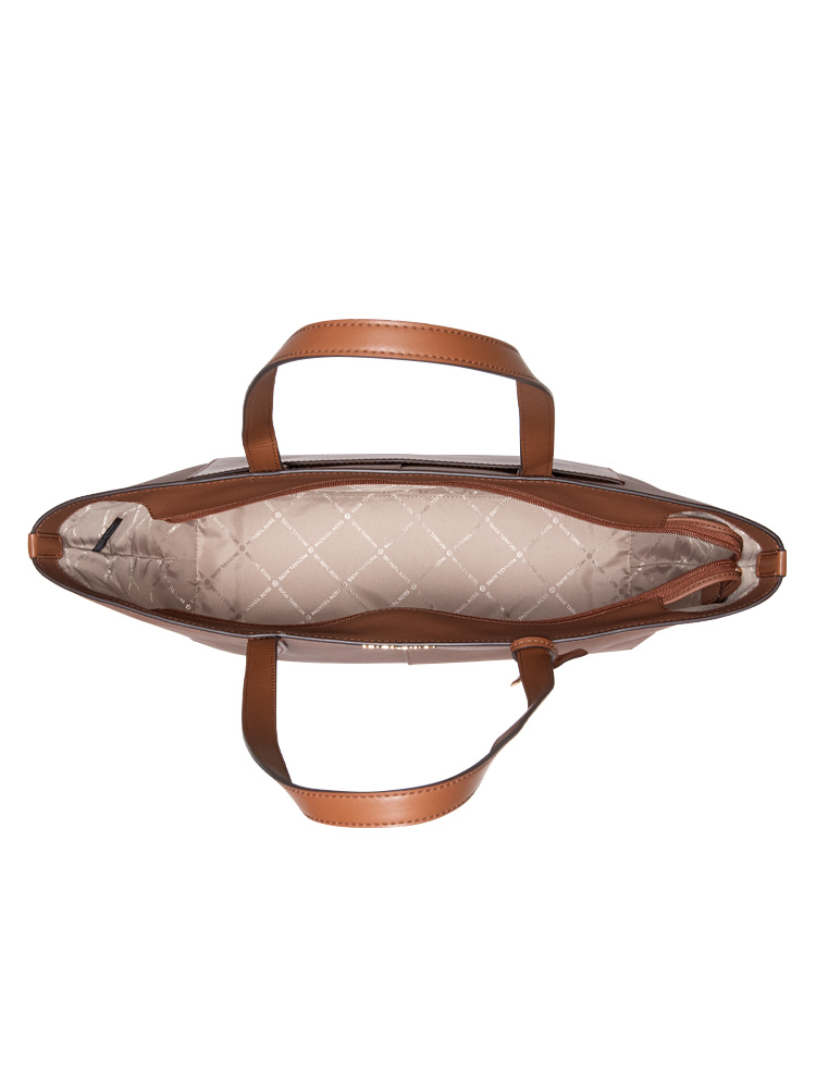 Made of saffiano leather. The bag features a zip closure that opens to polyster lining with interior one zip pocket and exterior one slip pocket a5t back.