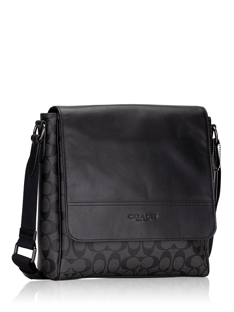 Signature coated canvas and refined calf leather. Inside zip, cell phone and multifunction pockets. Snap closure, fabric lining. Outside slip pocket. Adjustable strap with 25 inc drop for shoulder or crossbody wear. 11 (L) x 10 3/4 (H) x 3 1/4 (W) inc.