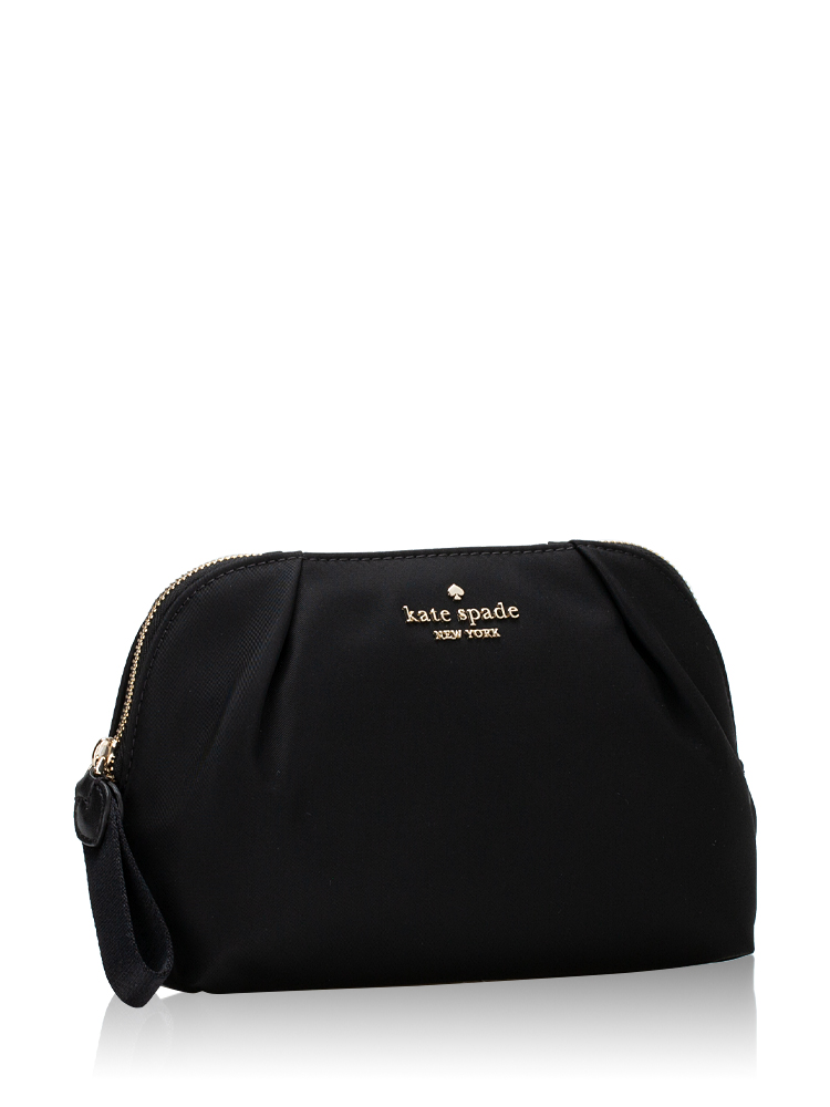 Made of nylon with nylon lining. The cosmetic bag features an open zip closure, gold tone hardware, and no pocket interior.