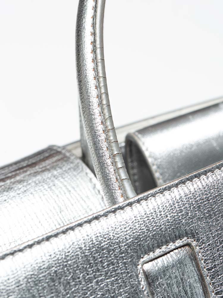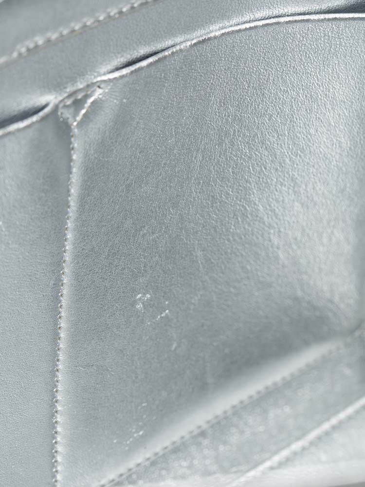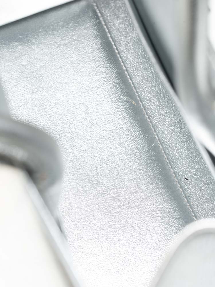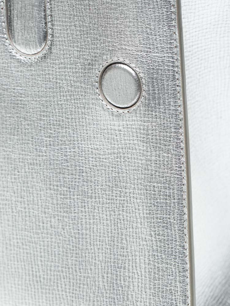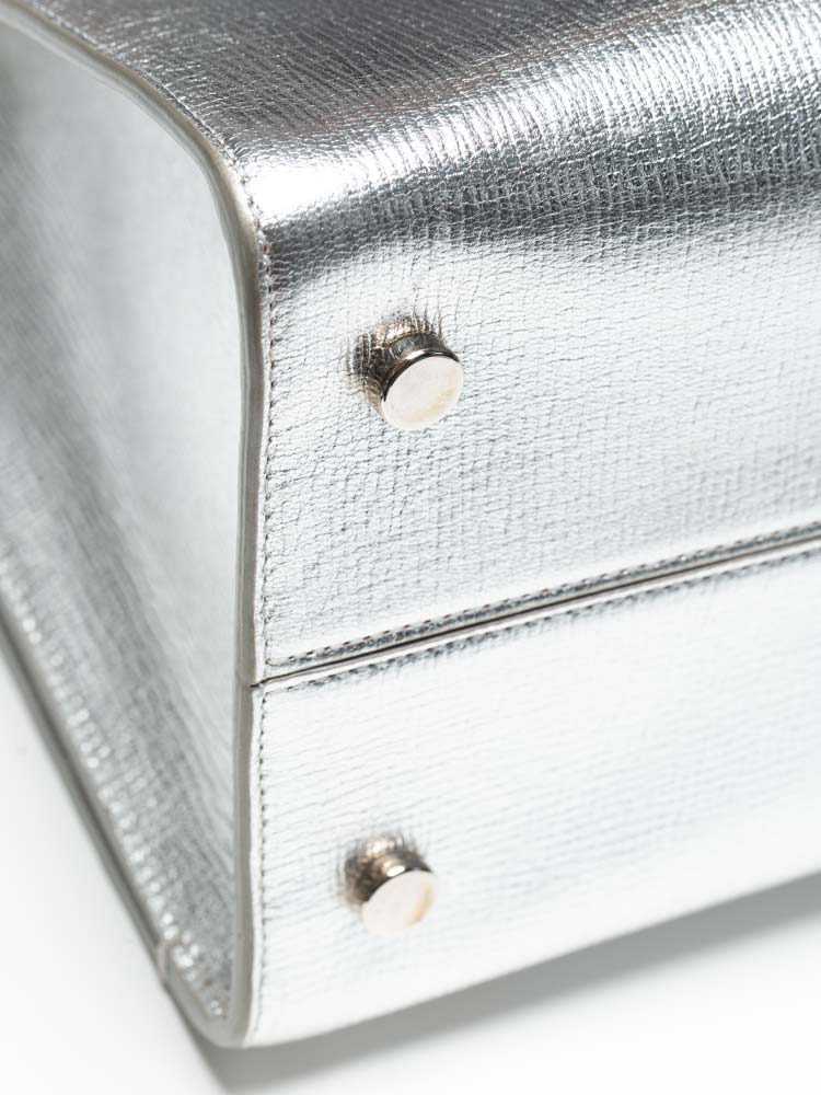 This handbag is composed of crushed calfskin leather in metallic silver. This handbag features silver rolled leather top handles, a shoulder strap and silver hardware. The facing flap opens with a textured press lock to a metallic calfskin interior.