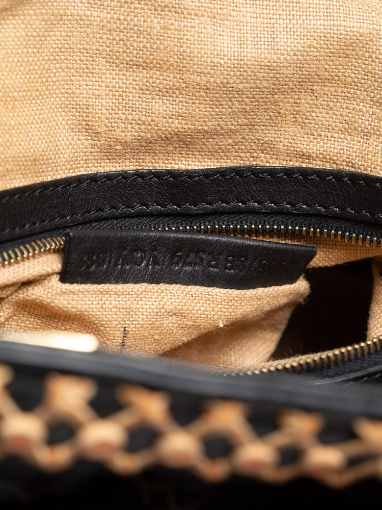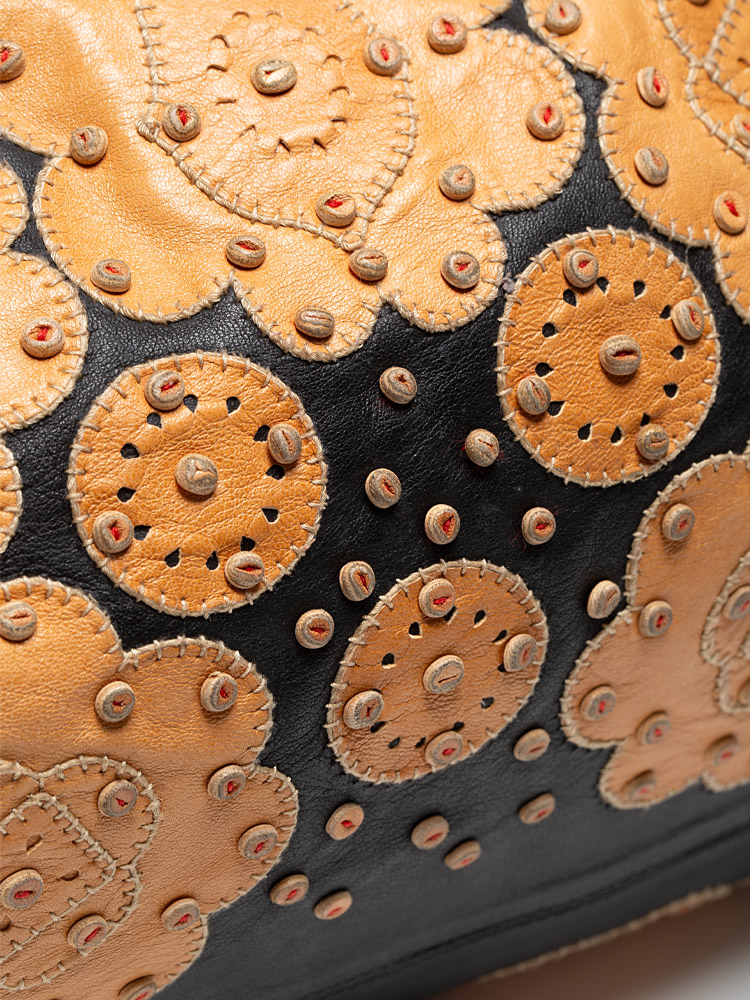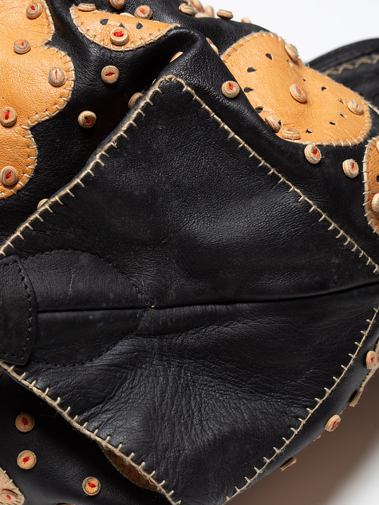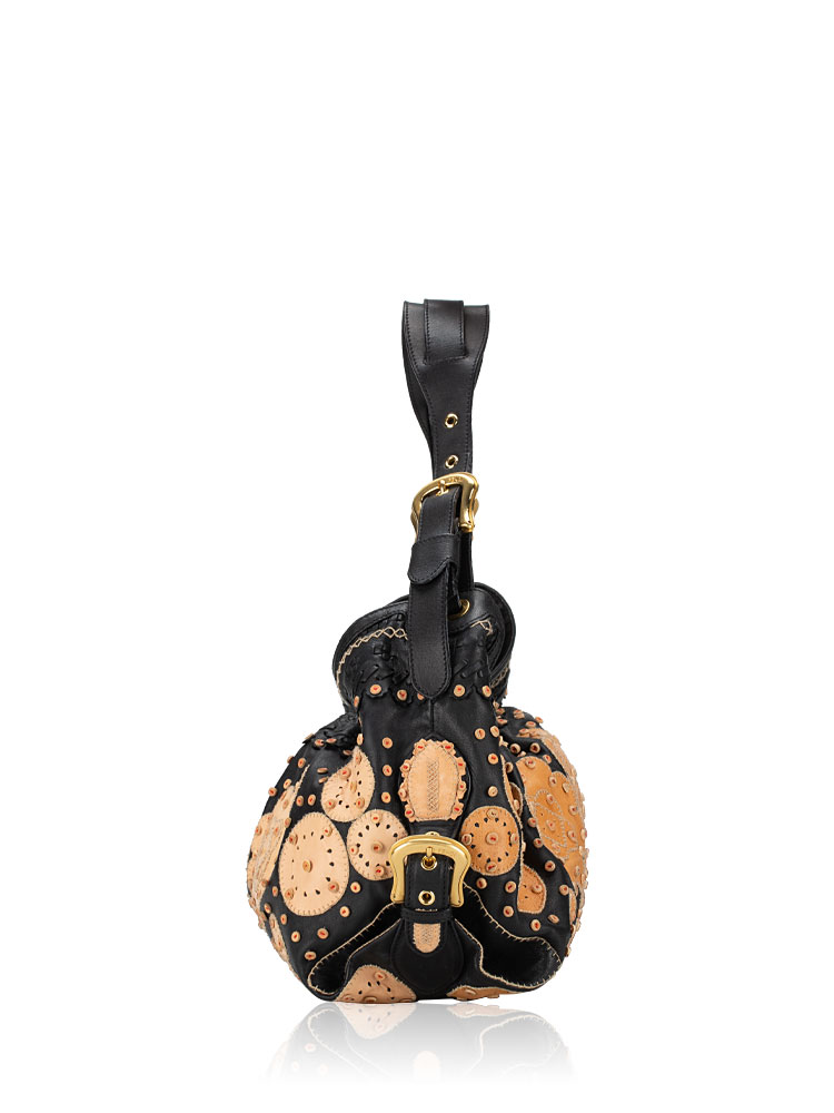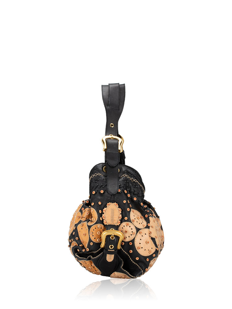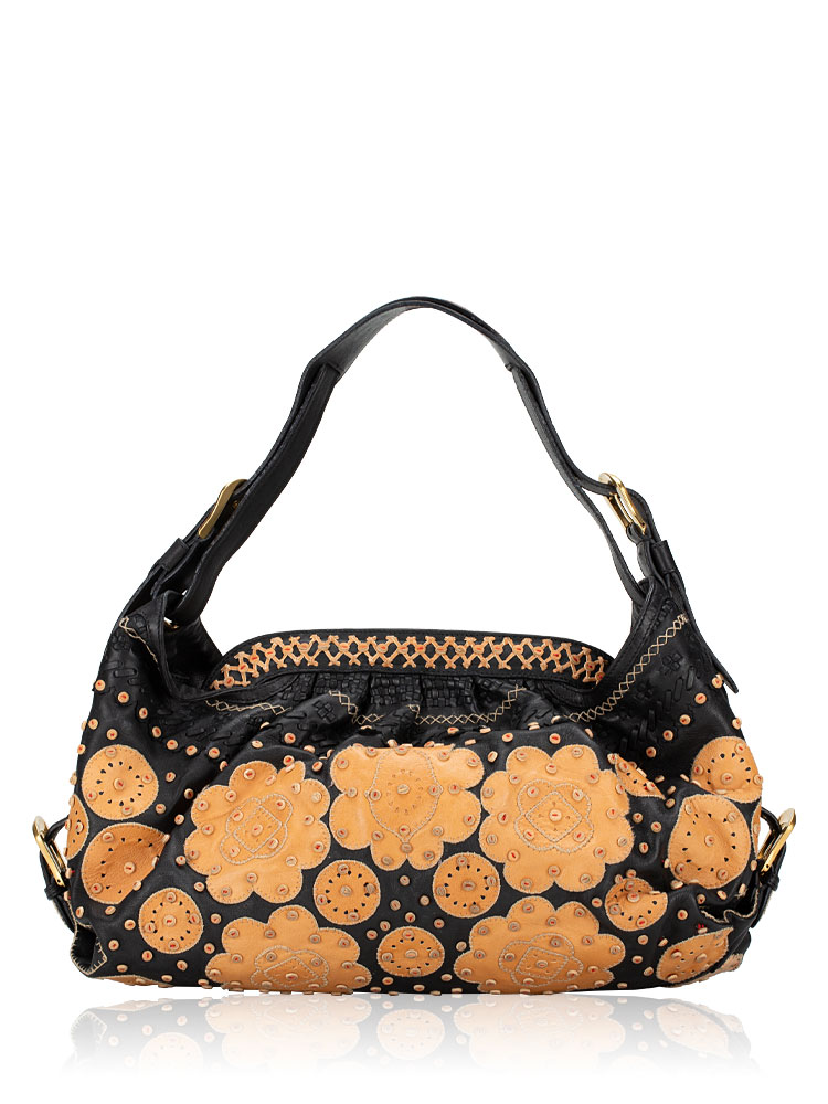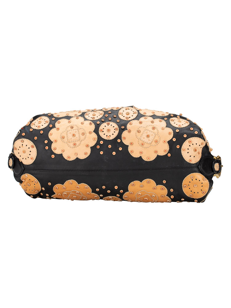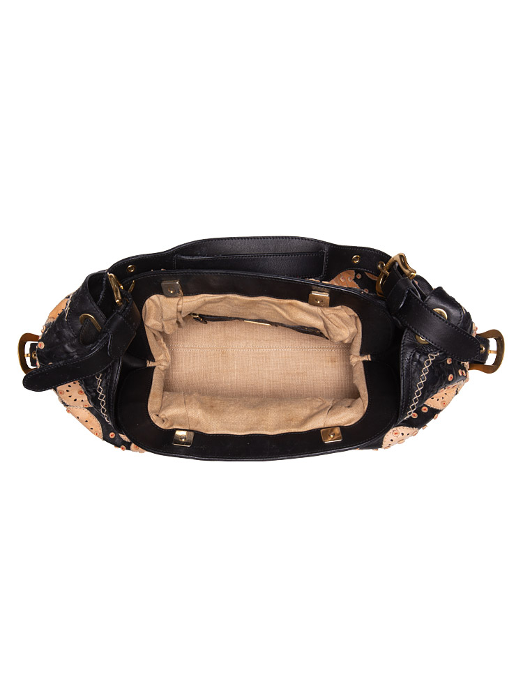 Crafted of lambskin leather material. It features top handles and decorative side belts and bronze buckles with magnets at the top with decorative embroidery at upper material. It opens to a fabric interior with patch and zipper pockets.