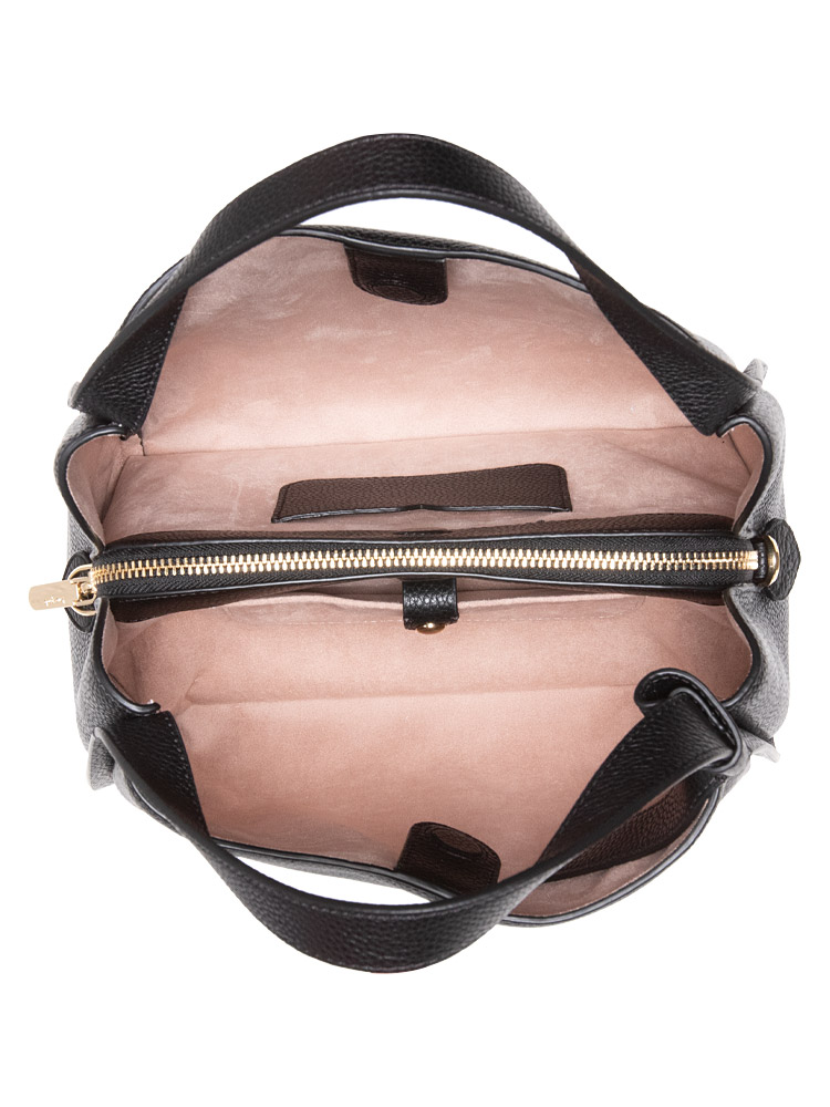 Made of pebbled leather. The bag features a magnetic closure that opens to fabric and suede lining with one card slot, one slip button pocket, one zip compartment and one slip pocket.