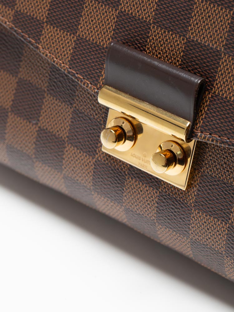 Crafted of damier ebene coated canvas. It features leather trim including a top handle with a removable tassel and an optional shoulder strap with brass hardware. The flap opens to a fabric interior with a patch pockets.