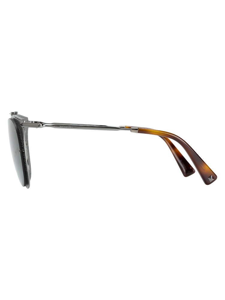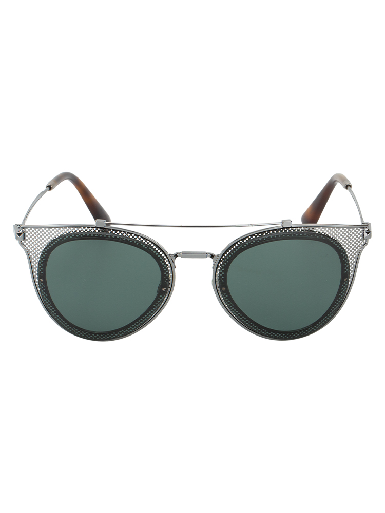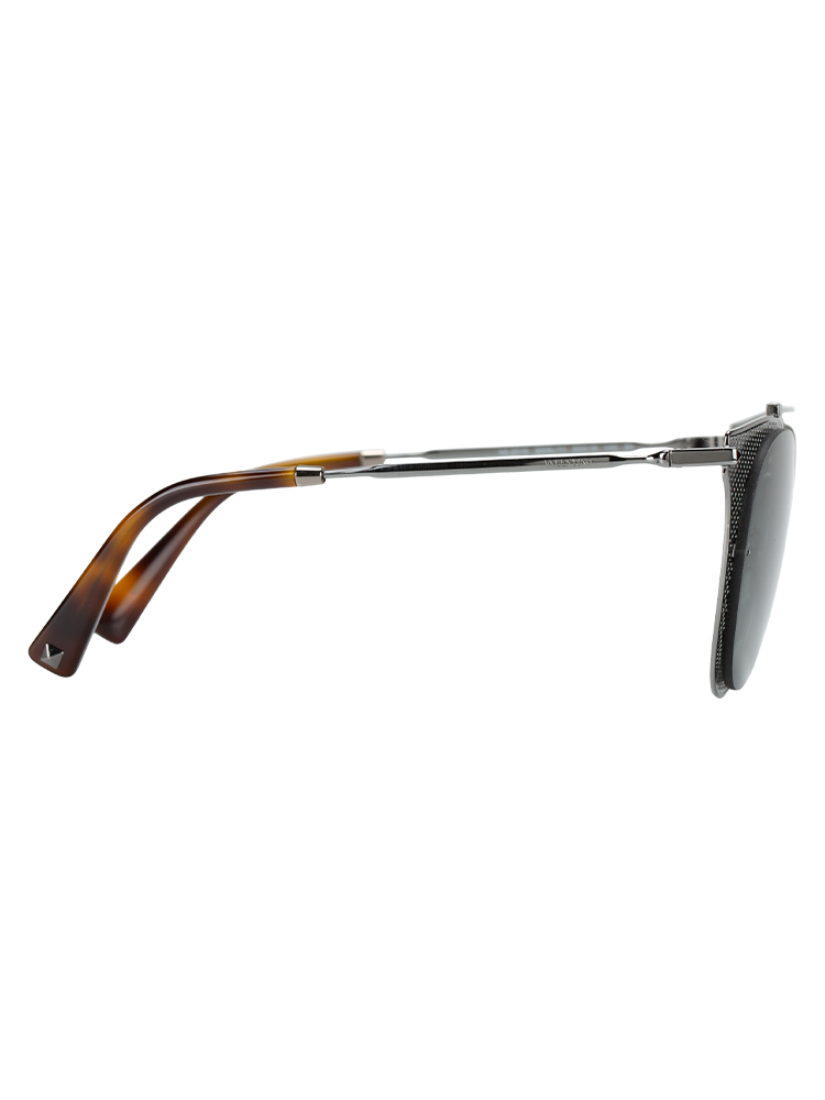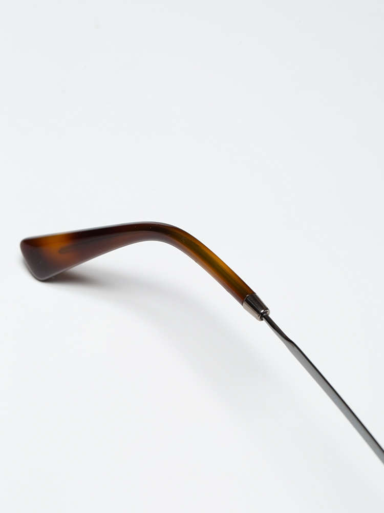 Crafted of metal and acetate lens. It features a perforated frame with metal temple and tortoise motif at temple tips.