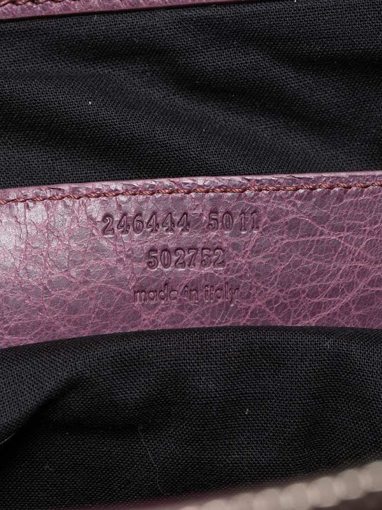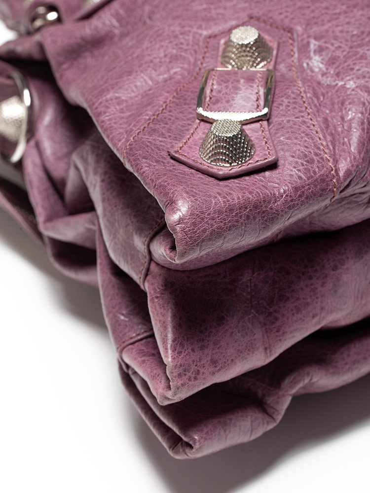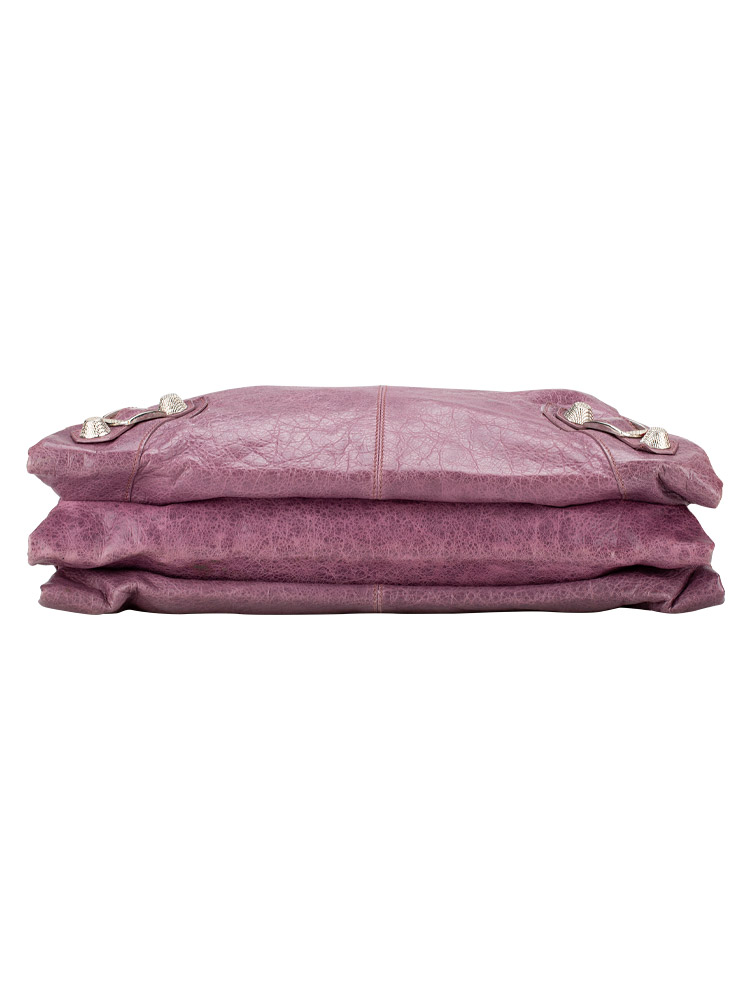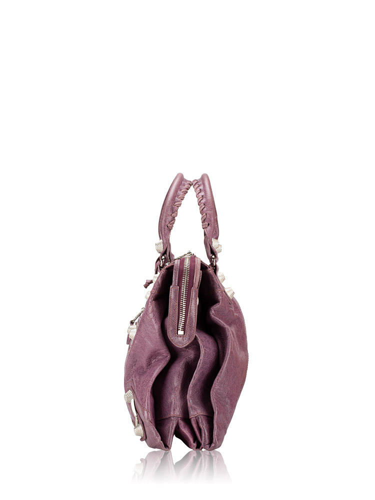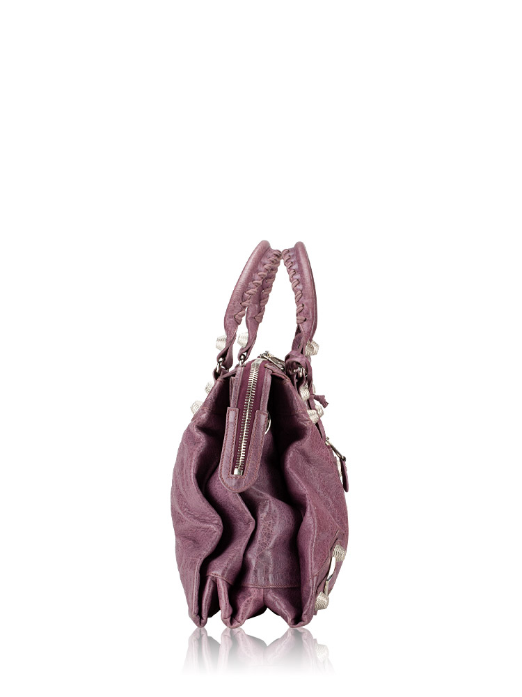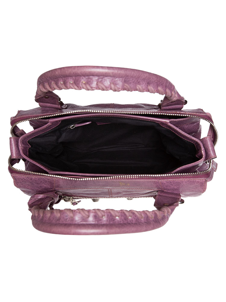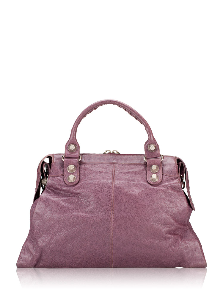 Crafted of lambskin leather. Features rolled leather top handles, an optional shoulder strap, and silver hardware including studs and buckles. The top zipper opens to a fabric interior with zipper and patch pockets.
