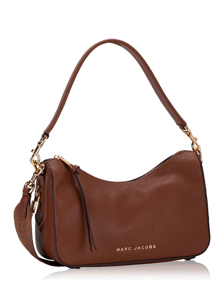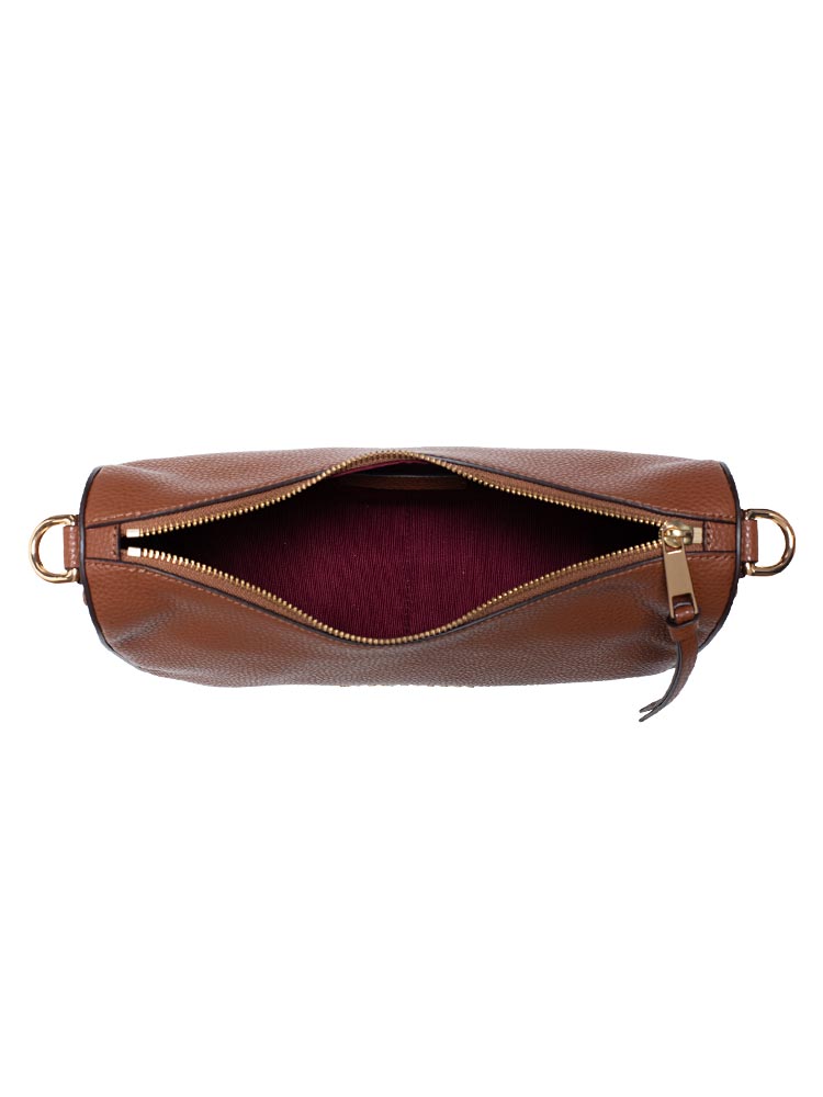 Made of pebbled leather. The bag features a zip closure that opens to fabric lining with one zip pocket, removable shoulder strap, adjustable and removable long strap.