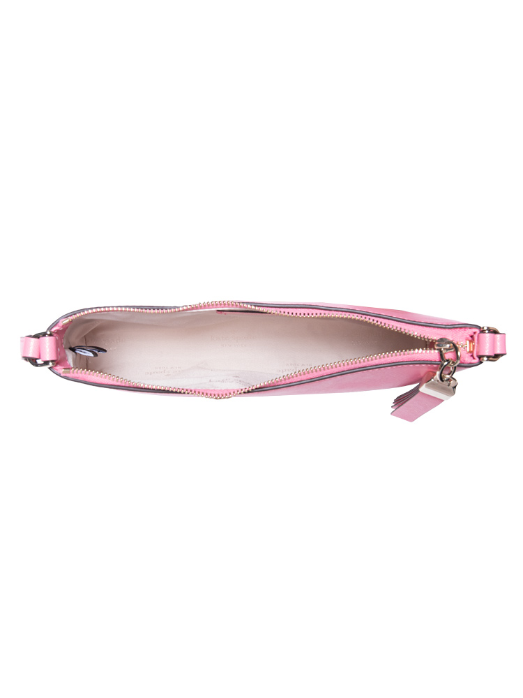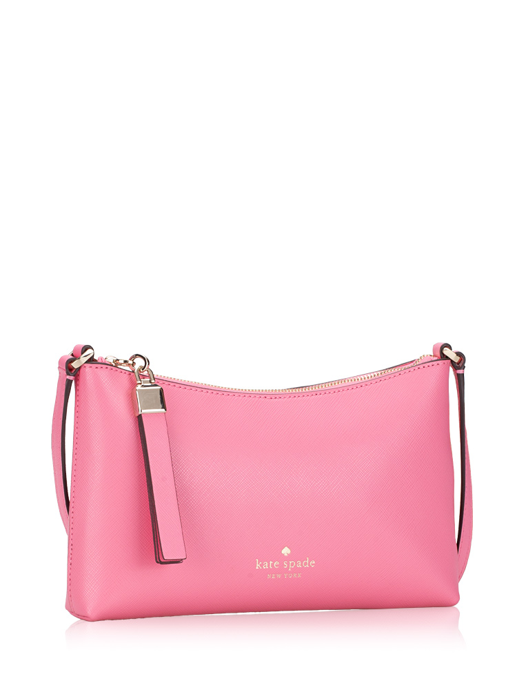 Made of saffiano leather. The bag features a zip closure that opens to polyester lining with adjustable strap, kate spade foil logo.