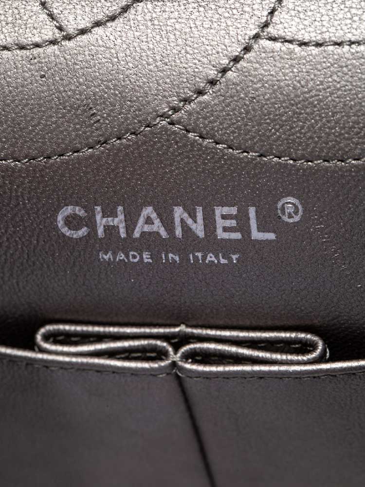 Crafted of diamond-quilted metallic calfskin leather. Features a ruthenium reissue chain shoulder strap and a ruthenium Mademoiselle turn lock. This opens to reveal an inner flap and a matching leather interior with patch pockets.