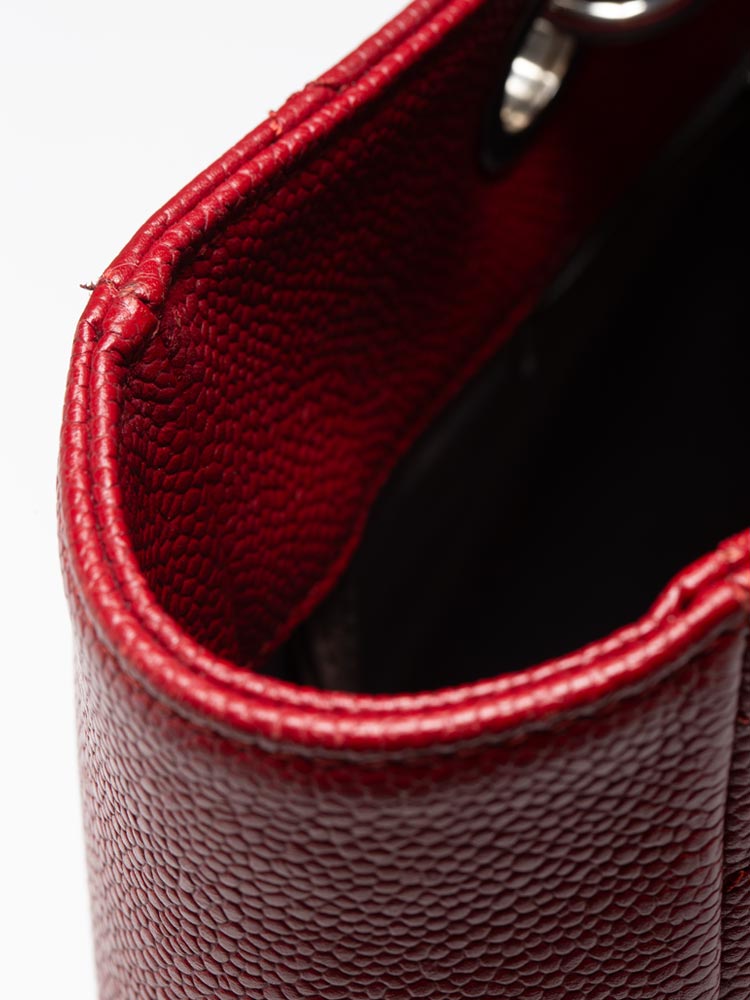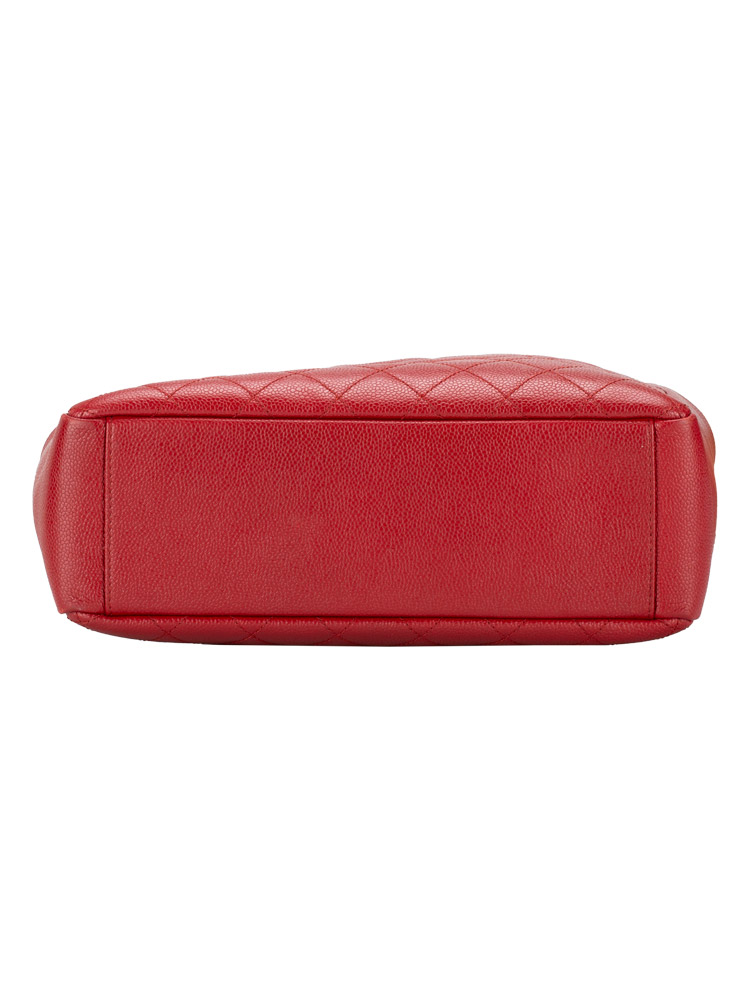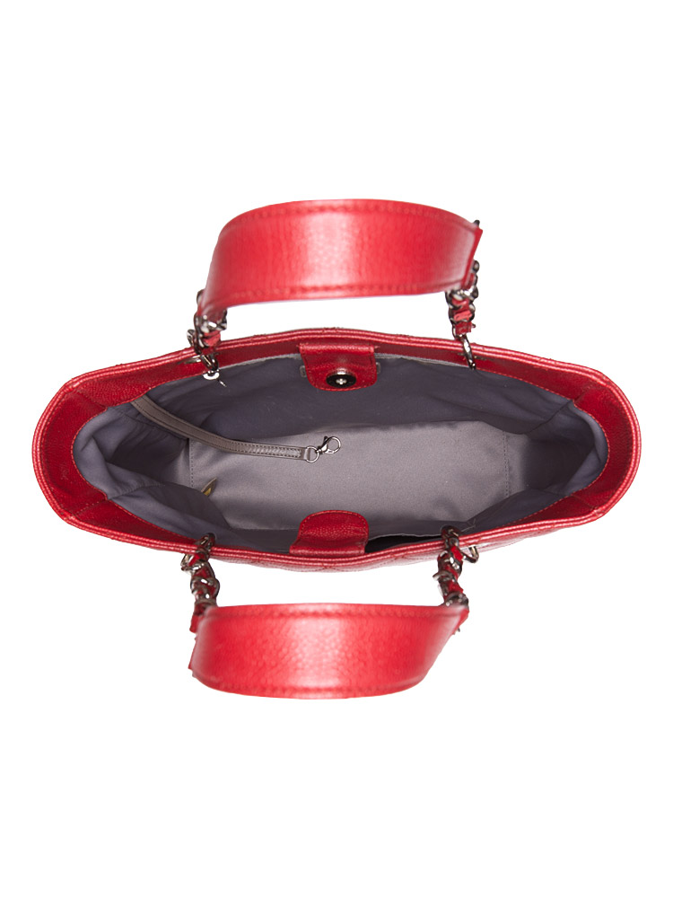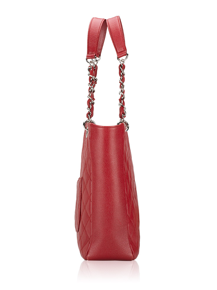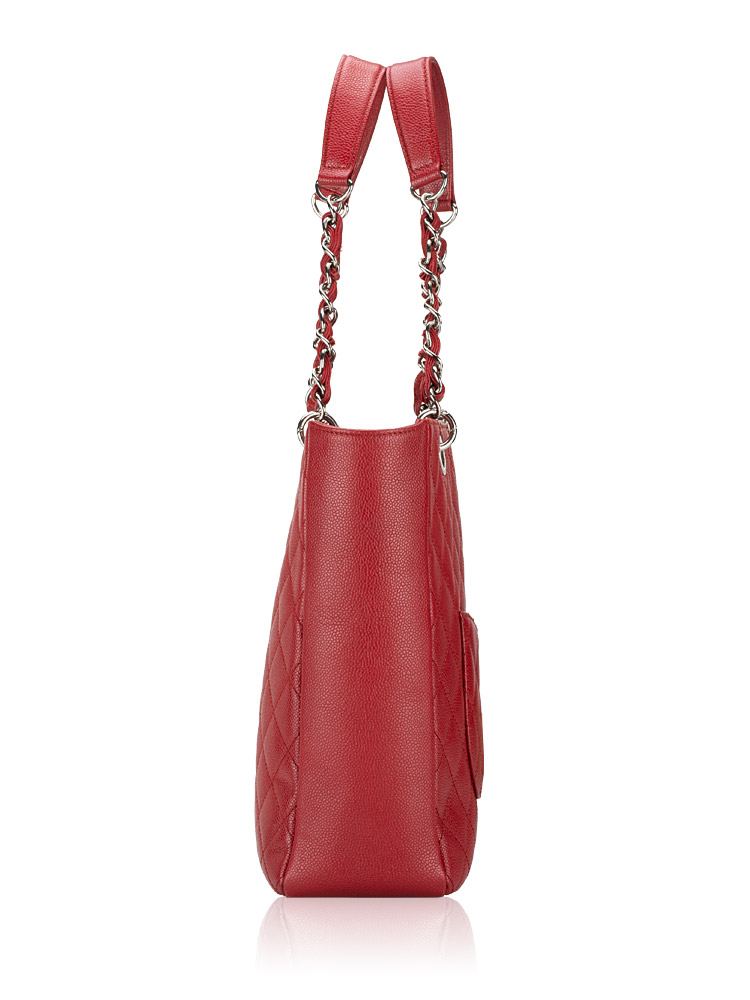 This bag is crafted of caviar leather. The bag features with quilted diamond, double top handles with chain and leather pad, CC frontal logo on upper material. The tote opens to satin lining with slip and zipper pockets.