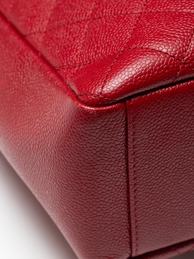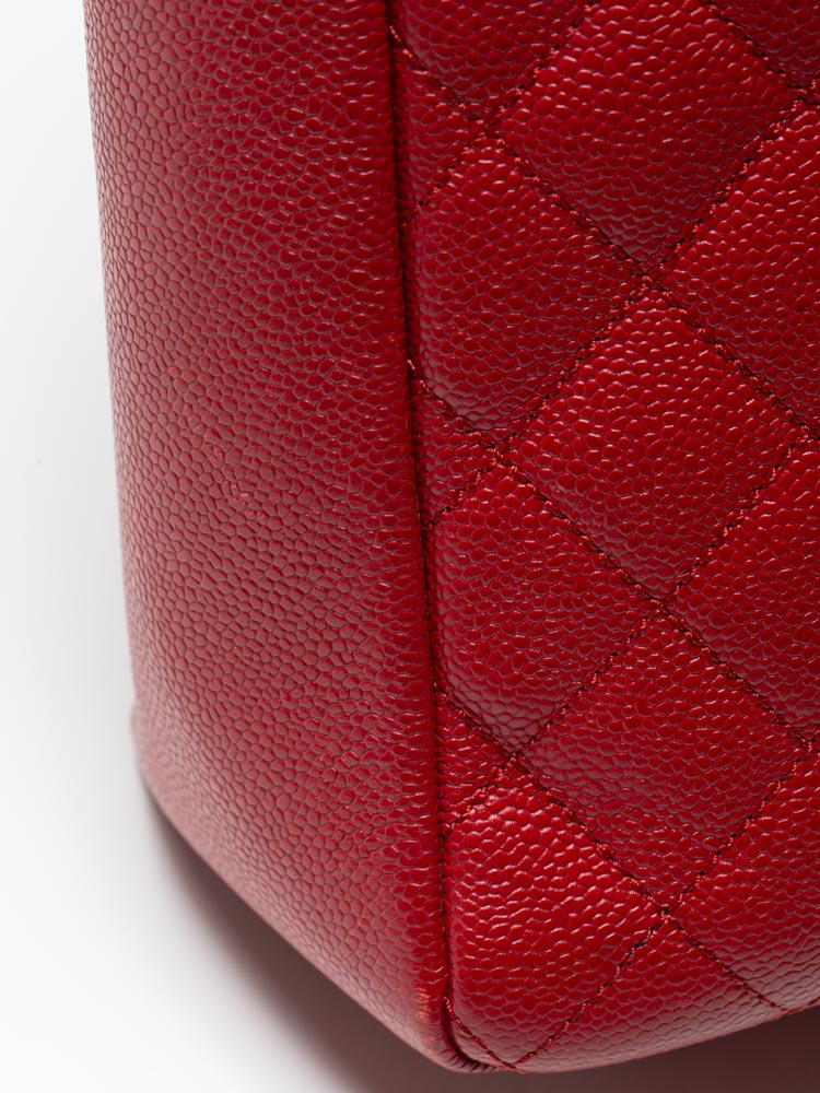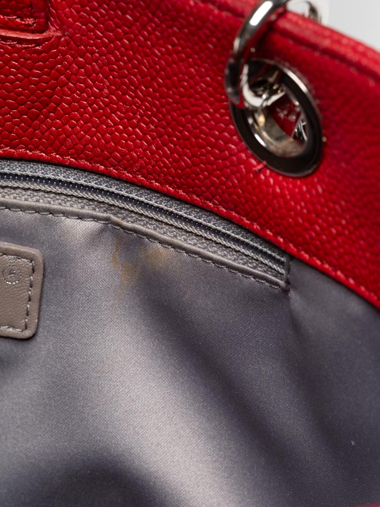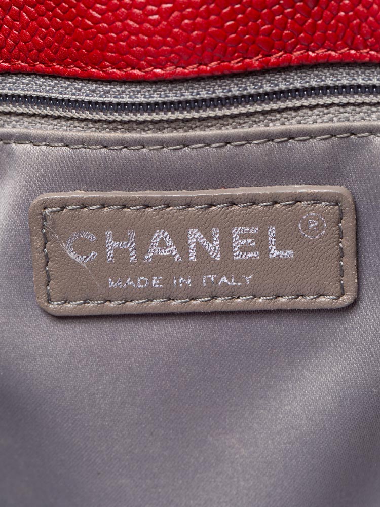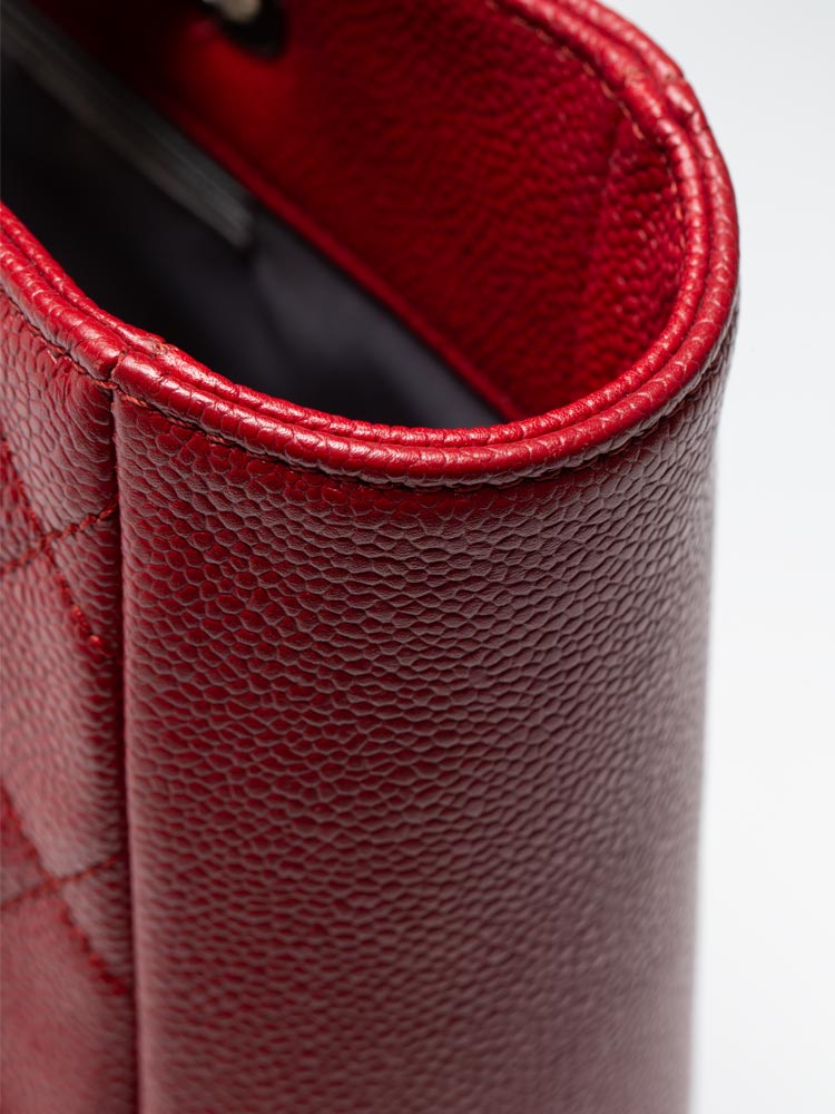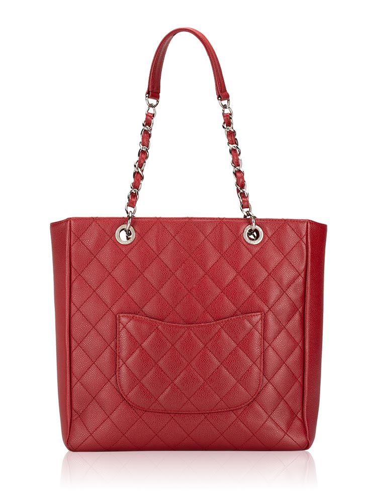 This bag is crafted of caviar leather. The bag features with quilted diamond, double top handles with chain and leather pad, CC frontal logo on upper material. The tote opens to satin lining with slip and zipper pockets.