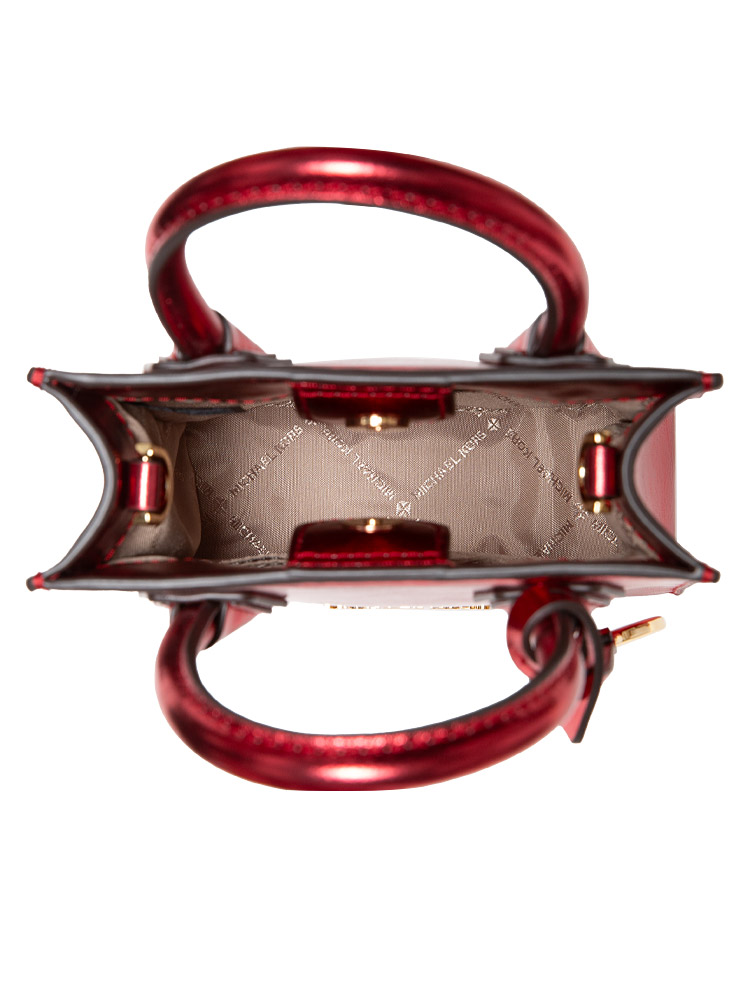 Crafted from patent and leather, this scaled-down bag features structured top handles and an adjustable shoulder strap for added versatility. Wear it crossbody on casual days, or carry it by the top handles for added polish.