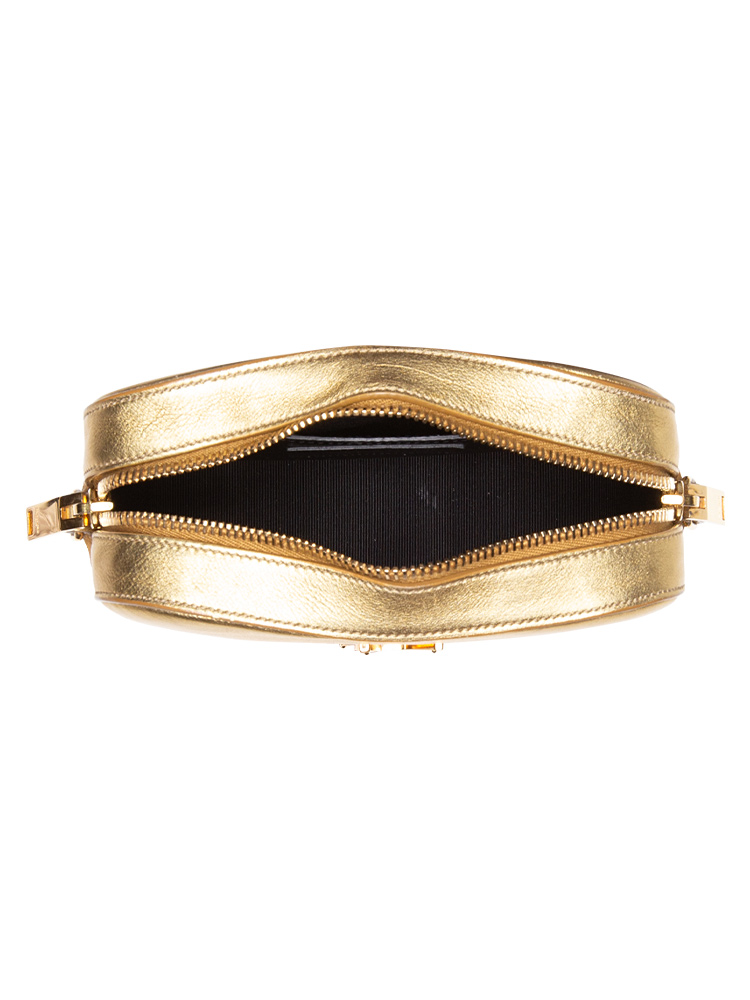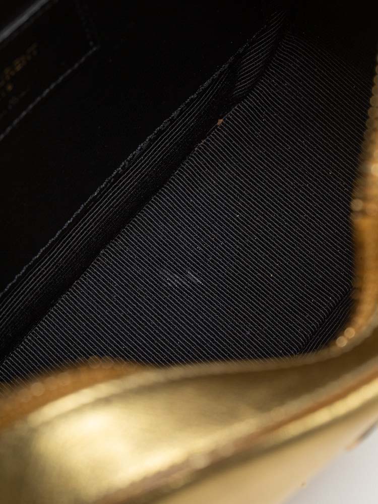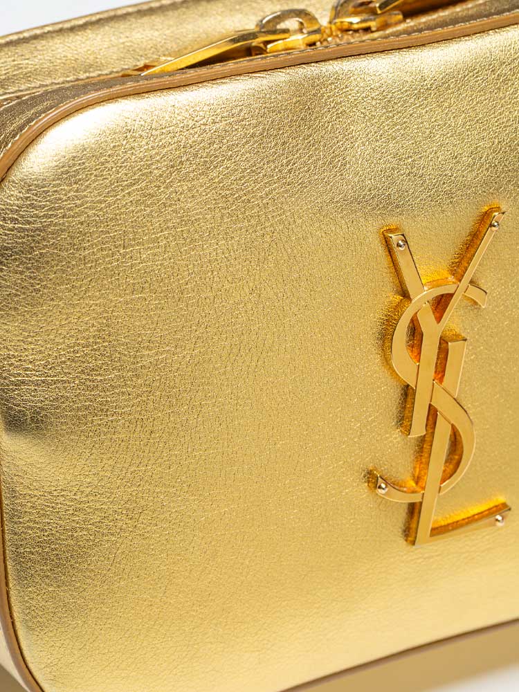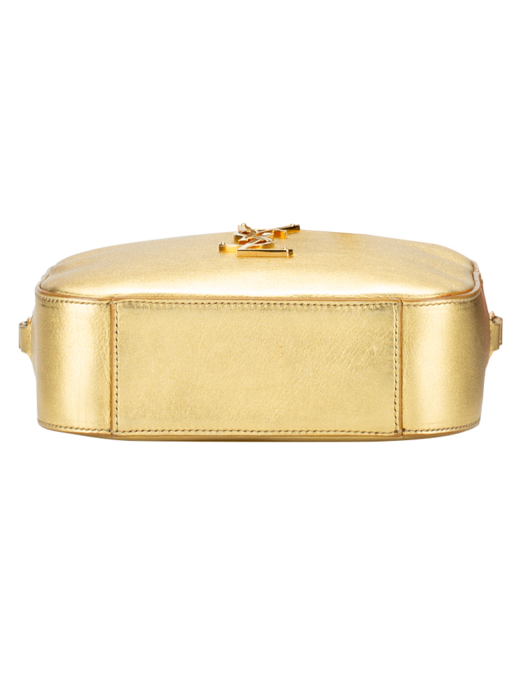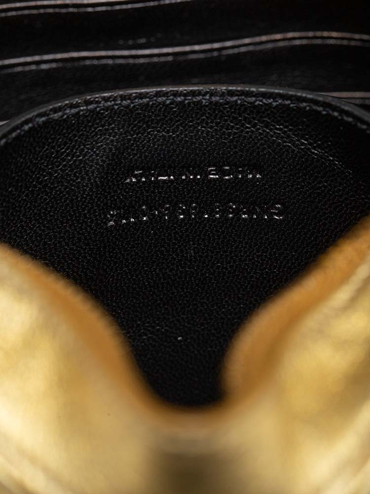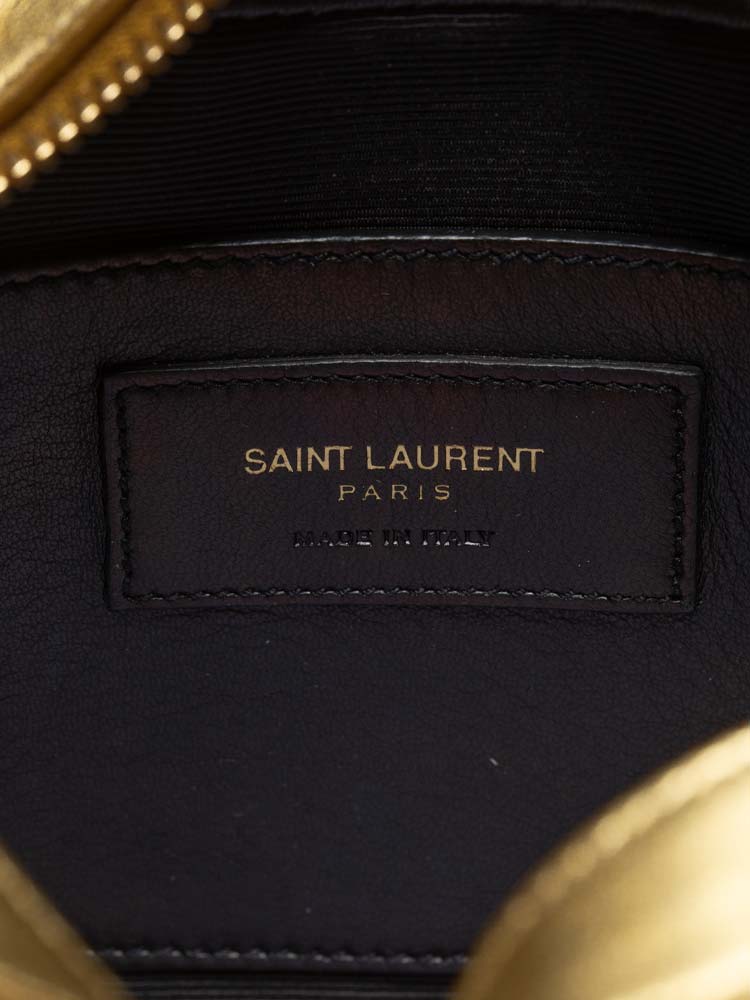 This shoulder bag is crafted of textured metallic gold leather. It features a cross-body strap and a gold YSL logo on the face. The top zipper opens to a compact black fabric interior with a patch pocket and card slots.