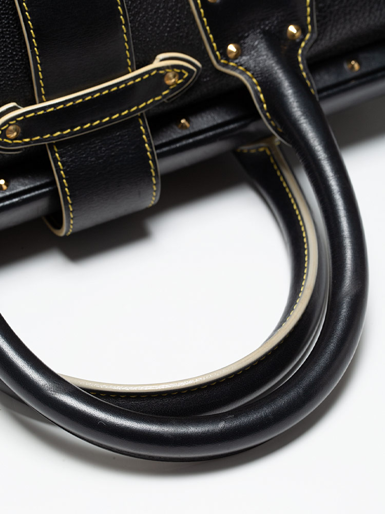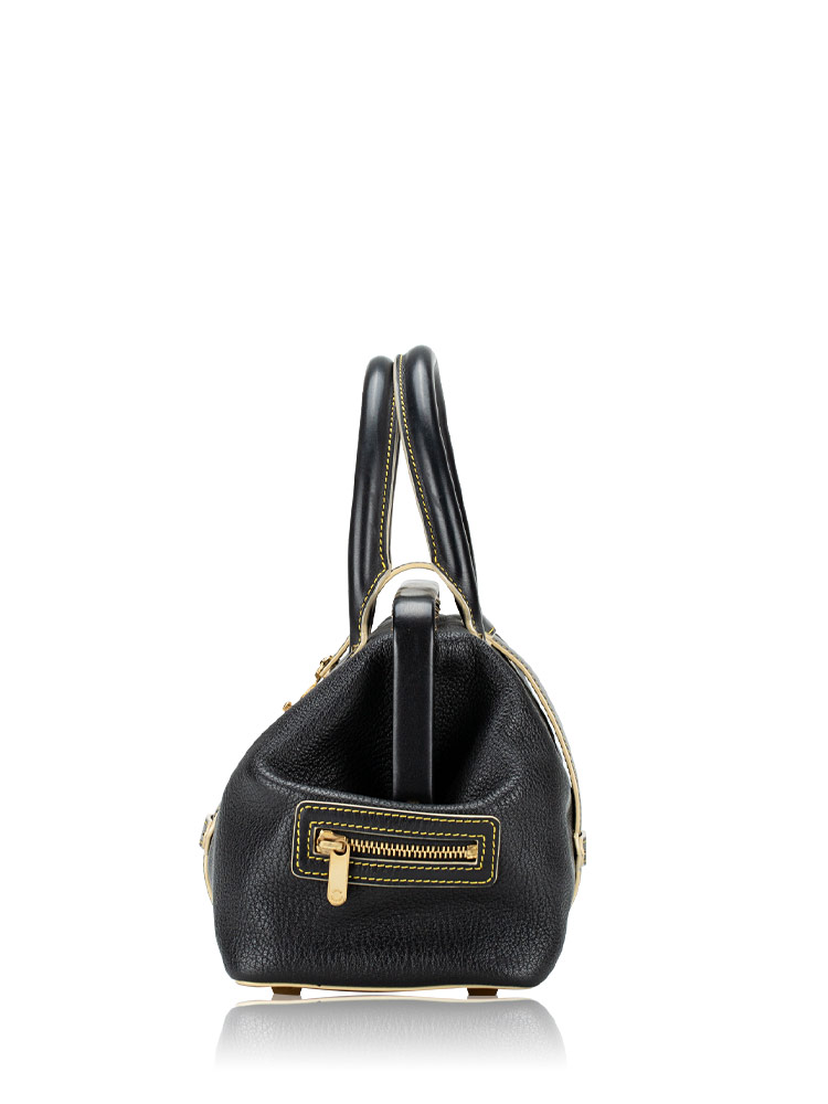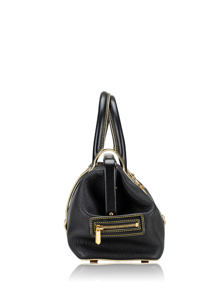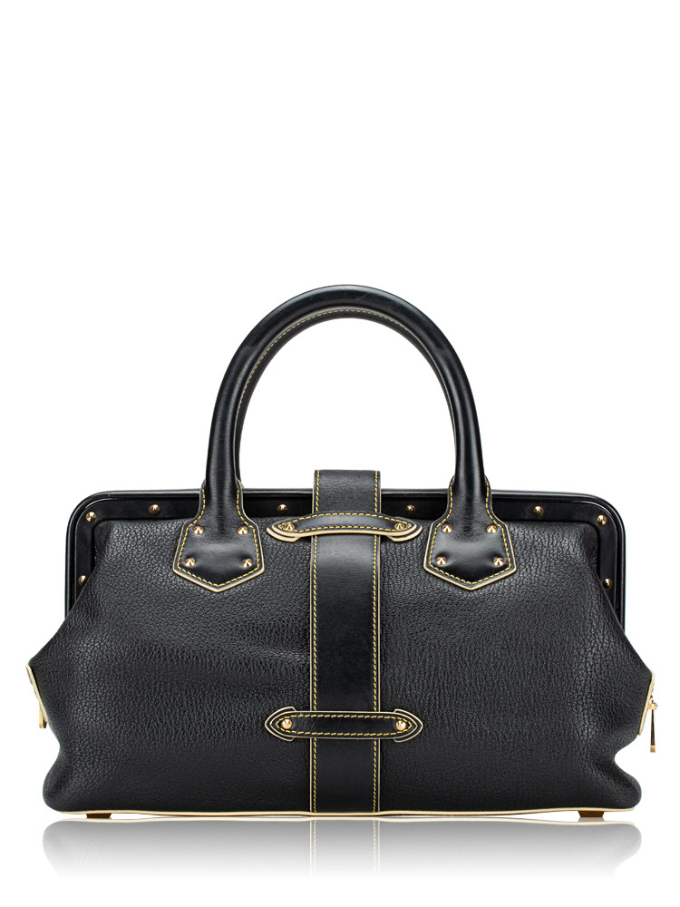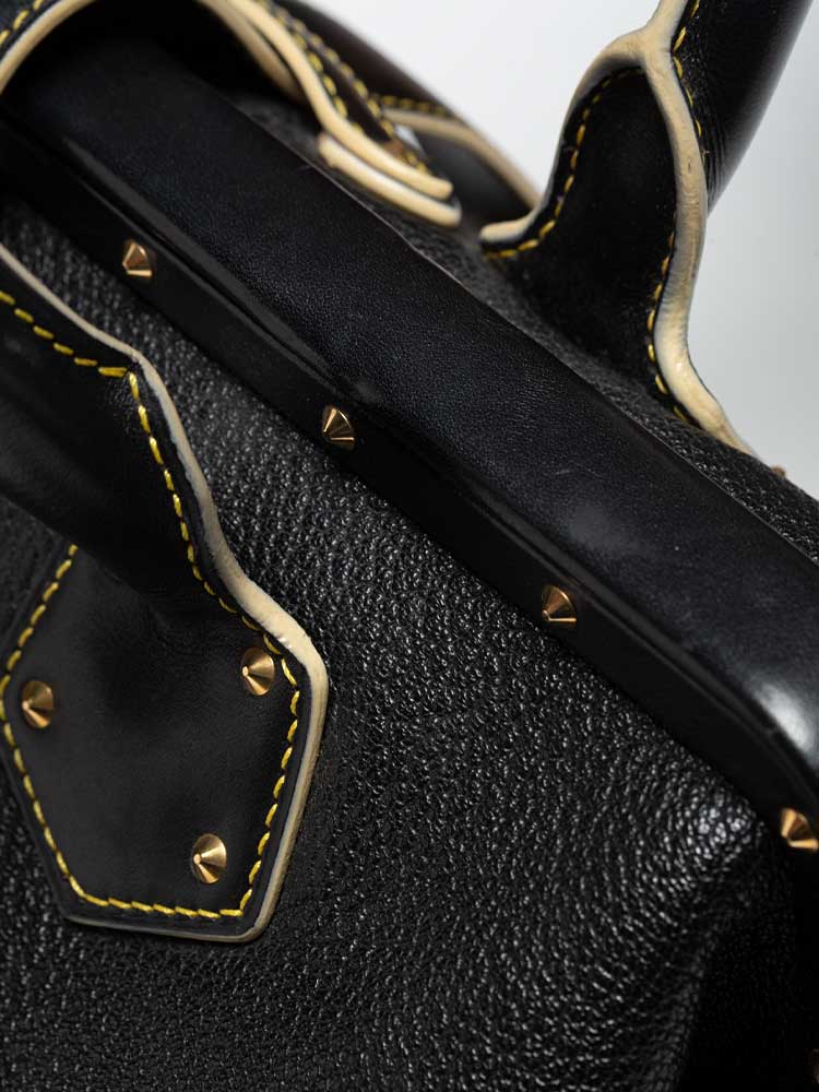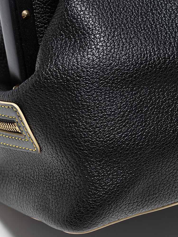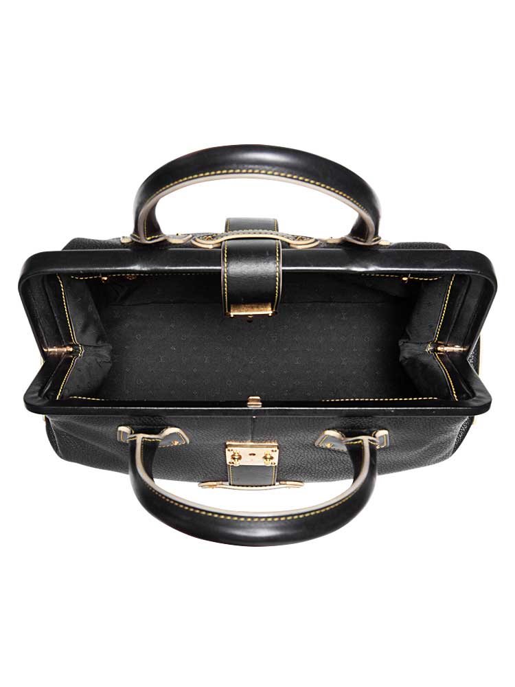 Crafted of goatskin leather. Features rolled leather top handles and brass hardware including studs and a press lock. This opens to a jacquard fabric interior with zipper pocket.