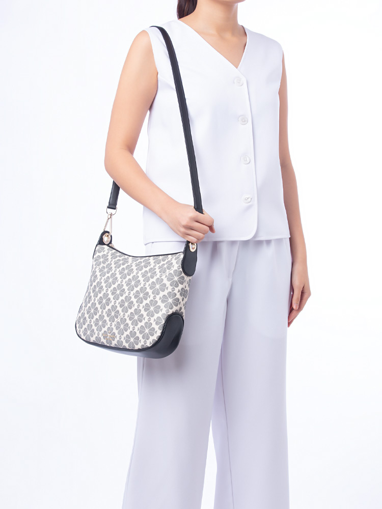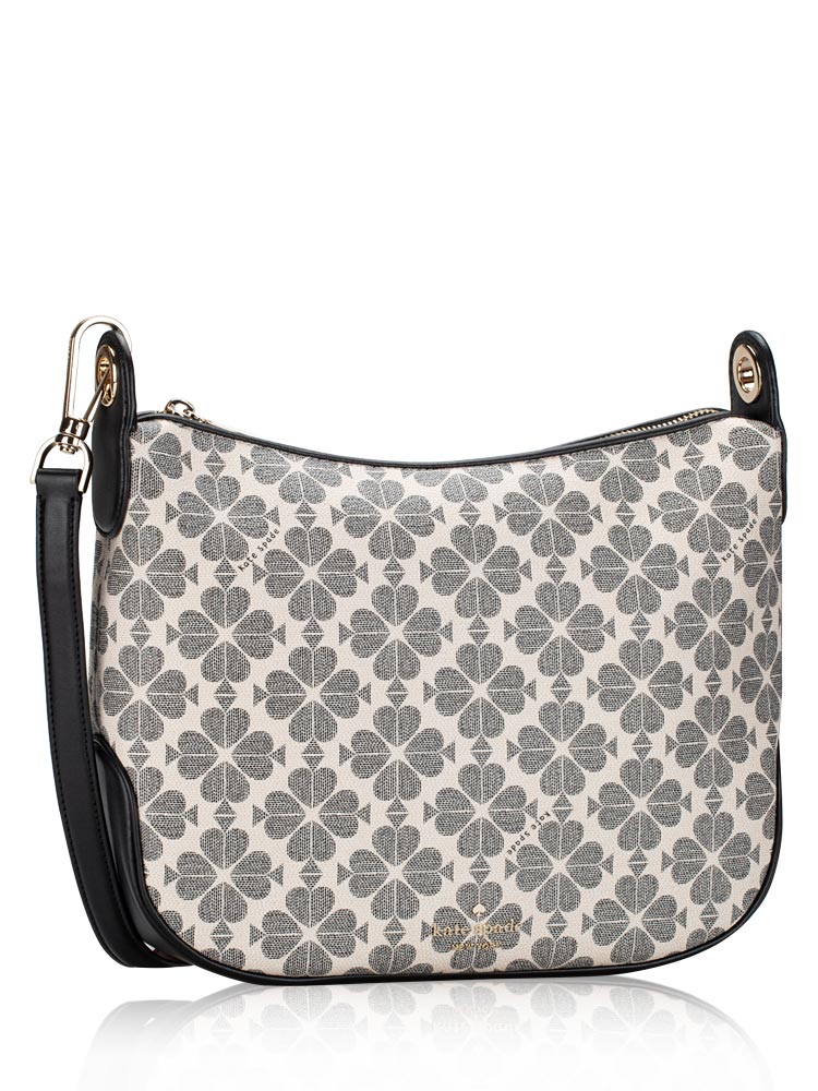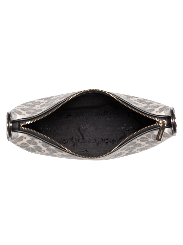 Made of signature pvc spade flower. The bag features a zip closure that opens to two way script logo lining with interior one zip pocket, one slip pocket.