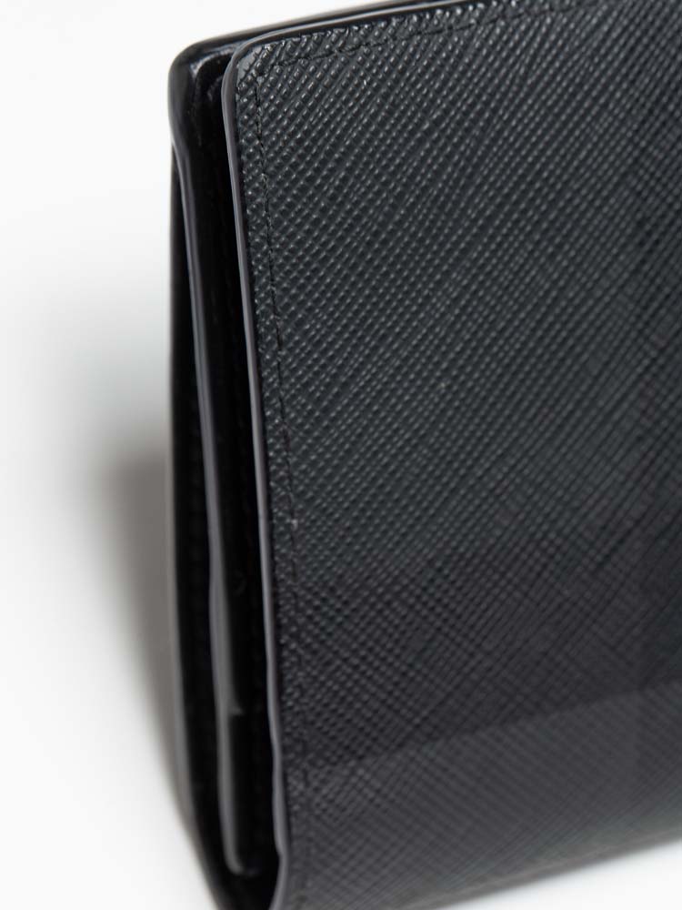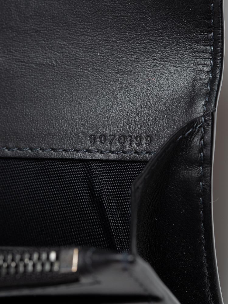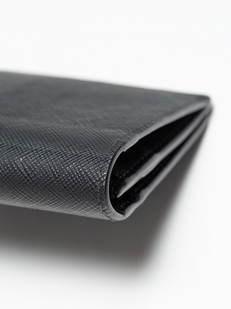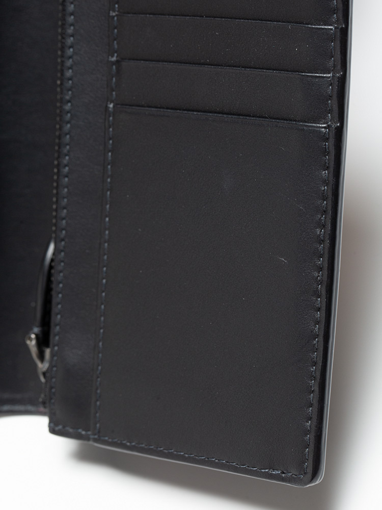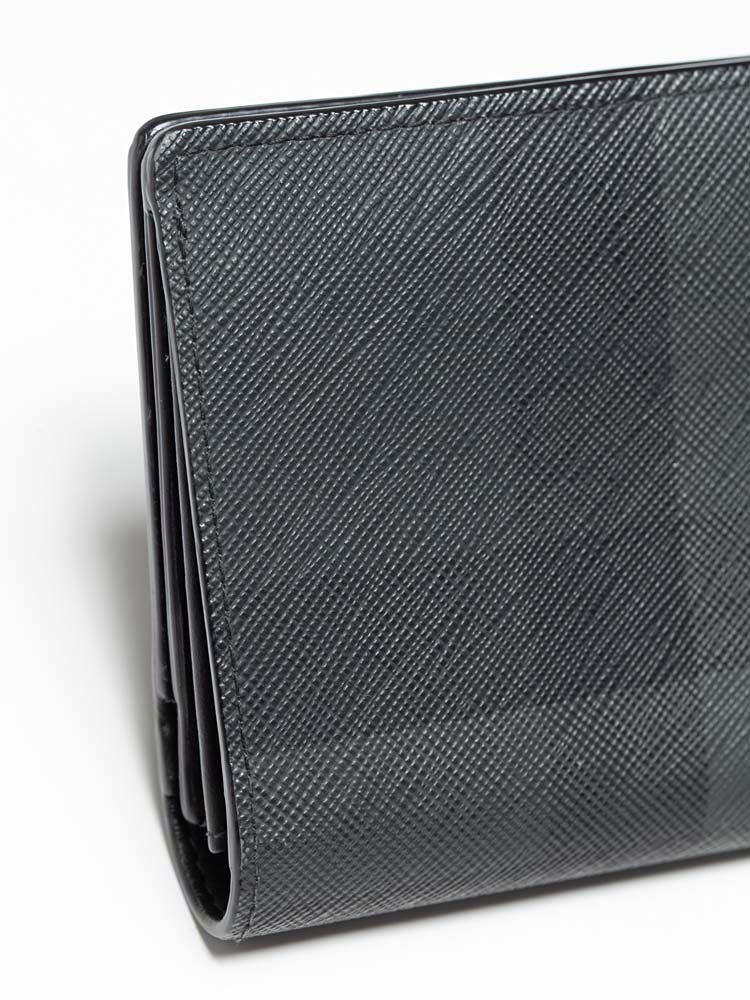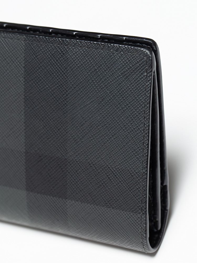This wallet is crafted of check coated canvas in gray and black. The wallet opens to a calfskin interior with card slots, billfold, and zipper pocket.