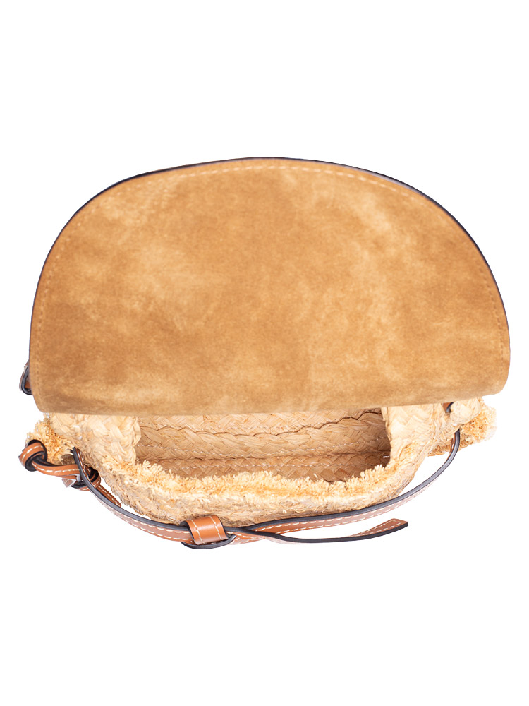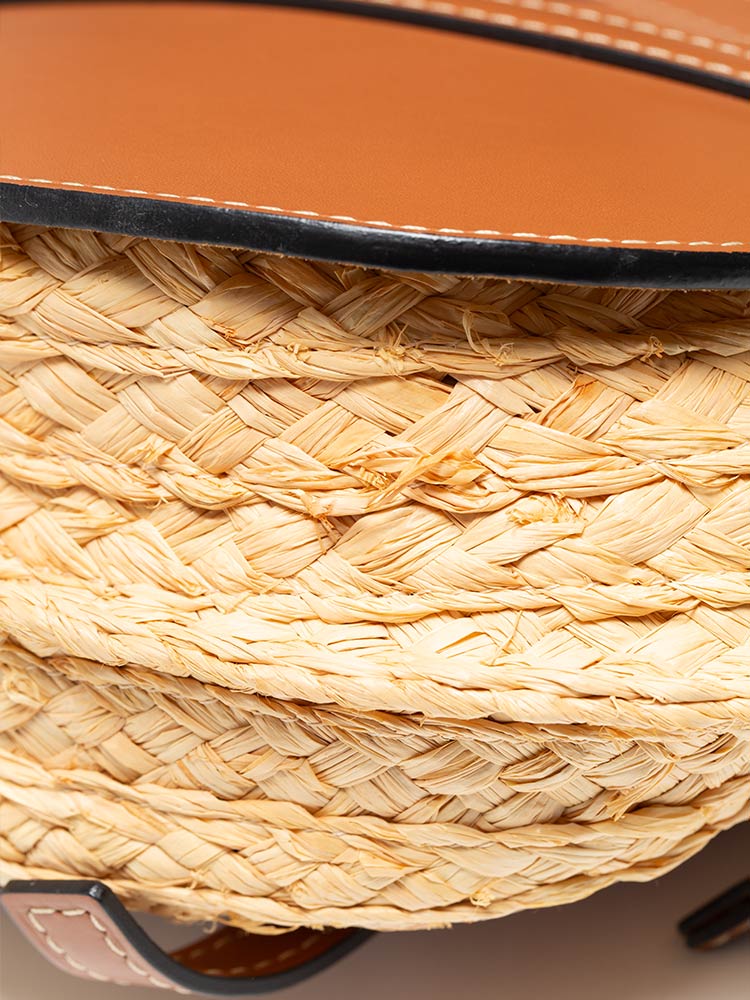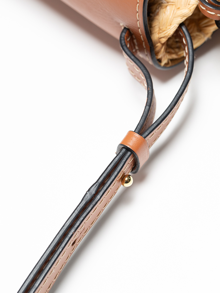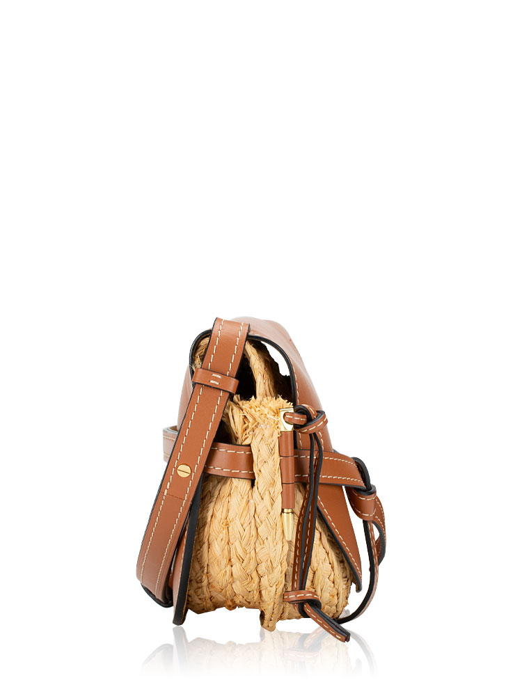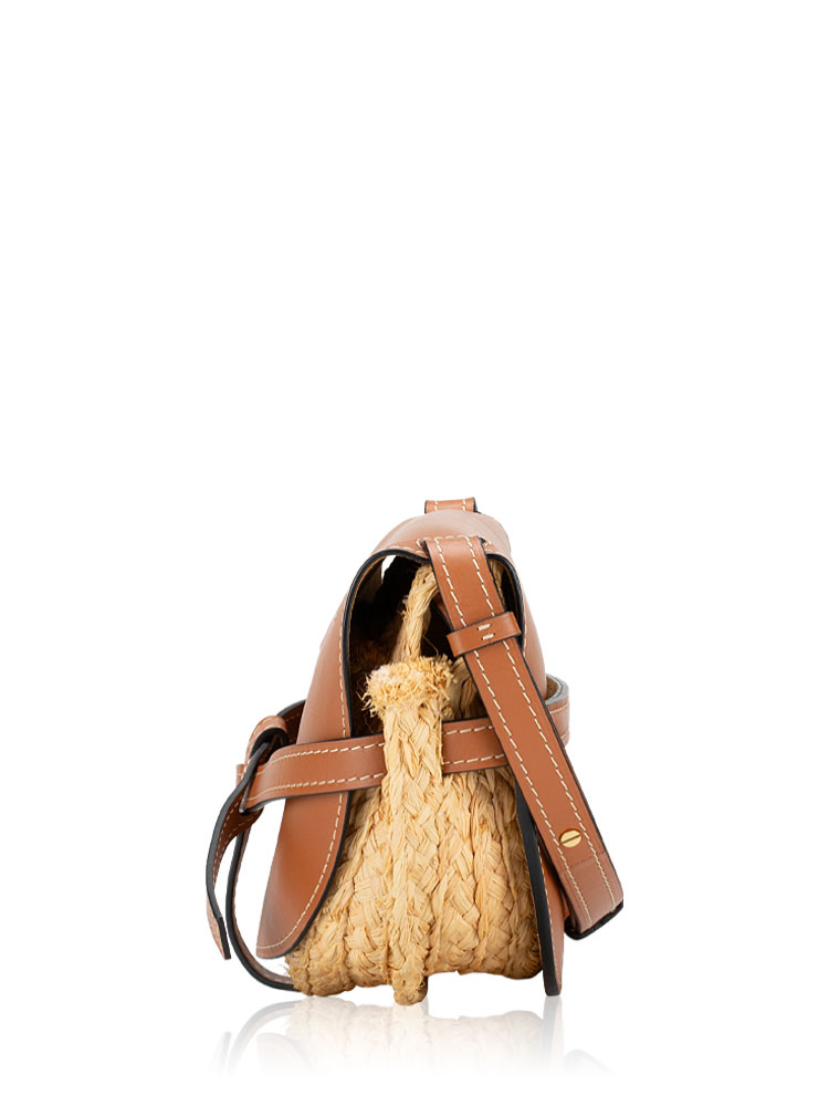 This crossbody is crafted of smooth calfskin leather in brown and woven raffia. The bag features a shoulder strap, a front knotted detail which holds the front flap, and gold hardware.